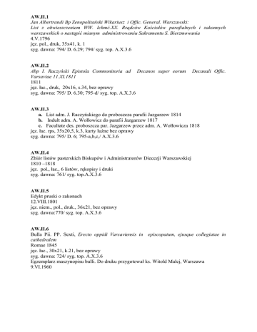 AW.II.1 Jan Albertrandi Bp Zenopolitański Wikariusz i Offic. General. Warszawski: List z obwieszczeniem WW. Ichmć.XX. Rządców Kościołów parafialnych i zakonnych warszawskich o nastąpić mianym administrowaniu Sakramentu S. Bierzmowania 4.V.1796 jęz. pol., druk, 35x41, k. 1 syg. dawna: 794/ D. 6.29; 794/ syg. top. A.X.3.6 AW.II.2 Abp I. Raczyński Epistola Commonitoria ad Decanos super eorum Varsaviae 11.XI.1811 1811 jęz. łac., druk, 20x16, s.34, bez oprawy syg. dawna: 795/ D. 6.30; 795-d/ syg. top. A.X.3.6 Decanali Offic. AW.II.3 a. List adm. J. Raczyńskiego do proboszcza parafii Jazgarzew 1814 b. Indult adm. A. Wołłowicz do parafii Jazgarzew 1817 c. Facultate des. proboszcza par. Jazgarzew przez adm. A. Wołłowicza 1818 jęz. łac. rps, 35x20,5, k.3, karty luźne bez oprawy syg. dawna: 795/ D. 6; 795-a,b,c,/ A.X.3.6 AW.II.4 Zbiór listów pasterskich Biskupów i Administratorów Diecezji Warszawskiej 1810 –1818 jęz. pol., łac., 6 listów, rękopisy i druki syg. dawna: 761/ syg. top.A.X.3.6 AW.II.5 Edykt pruski o zakonach 12.VIII.1801 jęz. niem., pol., druk., 36x21, bez oprawy syg. dawna:770/ syg. top. A.X.3.6 AW.II.6 Bulla Pii. PP. Sexti, Erecto oppidi Varsaviensis in episcopatum, ejusque collegiatae in cathedralem Romae 1845 jęz. łac., 30x21, k.21, bez oprawy syg. dawna: 724/ syg. top. A.X.3.6 Egzemplarz maszynopisu bulli. Do druku przygotował ks. Witold Malej, Warszawa 9.VI.1960 AW.II.7 Protocollum Expeditionum Consistorii Generalis Varsaviensis moderante Diaecesim Illustrissimo ac Reverendissimo Domino Josepho Bończa Miaskowski Episcopo Varsaviensi,Ordinis Aquilae Rubrae Equite. Auditore et iudice delegato Varsaviensi per … Adamo Prażmowski praeposito Cat. Varsaviensi ... 22.XII.1799 – 9.IX.1804 jęz. łac., pol., rps., s. 333-13/index/ -21 nlb., opr. skóra, brzegi zniszczone syg. dawna: 877/ L. 1.3; 877/ syg. top. A.X.3.6; Rew. 1968 – Ks. Jan Wysocki AW.II.8 Akta administracji Abpa Ignacego Raczyńskiego 1806 – 1807 1806 – 1807 jęz. pol., łac., rps, 34,5x22,5, k.7, opr. płótno syg. dawna: 889-a/ L. 1.15; 889-a/ syg. top. A.X.3.6; Rew. 1968 – Ks. Jan Wysocki AW.II.9 Akta Bpa Malinowskiego 1812 – 1816 jęz. pol., łac., rps, 35x22, k. 13, opr. płótno syg. dawna: 889-b/ L. 1.15; 889-b/ syg. top. A.X.3.6; Rew. 1968 – Ks. Jan Wysocki Karty wyrwane z różnych ksiąg – posiadają przekreślona paginację AW.II.10 Listy Bpa J. Rybińskiego do Kapituły Warszawskiej 1798 jęz. pol.,rps, 23x19, k. 2/bifolium/, bez oprawy syg. dawna: 919/ L. 1.19; 919/ syg. top.A.X.3.6; Rew. 1968 – Ks. Jan Wysocki AW.II.11 List Bpa J. B. Miaskowskiego do Kapituły Warszawskiej 9.IV.1802 jęz. pol.,łac.,rps, 23x18, k. 2/bifolium/, bez oprawy syg. dawna: 921/ L. 1.21, 921/ syg. top, A.X.3.6; Rew. 1968 – Ks. Jan Wysocki AW.II.12 List okólny do duchowień[stwa] diec[ezji] Warszaw[skiej] względem szczepienia dzieci ospykrowia nazwanej 10.X.1811 jęz. pol.,rps, 35,5x20,5, k. 2, bez oprawy syg. dawna: 890/ L. 1.16; 890/ syg. top. A.X.3.6; Rew. 1968 – Ks. Jan Wysocki AW.II.13 Wiadomość historyczna o erekcji Kolegiaty Warszawskiej św. Jana Chrzciciela Katedry Warszawskiej i Kościoła Metropolitalnego – O Arcybiskupach – O Kapitule Kolegiaty Królewskiej św. Jana 1790 – O Biskupach diecezjalnych w Królestwie Polskim za panowania Króla Pol[kiego] Stanisława Augusta Poniatowskiego w roku 1790 – O Biskupach Diecezjalnych z grona Prześ[wietnej] Kapituły Warszawskiej będących – Capitulum Metropolitanum Varsaviense Anno 1836 1836 /?/ jęz. pol., rps, 36x22, k.6, okładka papierowa mylna syg. dawna: 878/ L. 1.4, 878/ syg. top. A.X.3.6; Rew. 1968 = Ks. Jan Wysocki Rękopis prawdopodobnie z kręgu Kapituły Warszawskiej. AW.II.14 Prothocollon variarum expeditionum sub Illustrissimo ac Reverendissimo D[omi]no Joanne Baptista Albertrandi Episcopo Zenopolitane Archidiacono Cathedrali Varsaviensi, Ordinis S. Stanislai Equi… in annis1797, 1798, 1799, 1800 et 1801 juxta suas adnotationes ac insertions, gratiose impertitarum 1.VII.1797 –2.V.1801 jęz. łac., rps, 35x21, k.2nlb.,10; s.72, 5, 2nlb., opr. Karton syg. dawna: 881/ L. 1.7; 881/ syg. top. A.X.3.5; Rew. 1968 – Ks. Jan Wysocki AW.II.15 Akta, odezwy do obywatelów diecezji warszawskiej od zwierzchności duchownej, cywilnej i wojskowej końcem pospolitej obrony i jej sposobu w sobie zamykające 1806 – 1807 jęz. pol., rps, 37x25, k. 54, opr. płótno syg. dawna: 880/ L. 1.6, 880/ syg. top. A.X.3.5; Rew. 1968 – Ks. Jan Wysocki Zawiera rejestr odezw – niepełny AW.II.16 Urządzenia i odezwy do duchowieństwa od Konsystorza General[nego] Warszaw[skiego] pod rządami pruskim I polskim w roku 1800 aż do roku 1807 wydawane 4.I.1800 – 28.X.1807 jęz. pol., rps, 37x24, k. 81+5+4, opr. tektura syg. dawna: 879/ L. 1.5; 879/ syg. top. A.X.3.5; Rew. 1968 Ks. Jan Wysocki 5 kart o innej paginacji między księgą I a II oraz 4 karty na końcu księgi II AW.II.17 Correspondenti Decani Gąbinensis 1800 – 1807 jęz. pol., rps, 25x20, k. 147+2, opr. płótno syg. dawna: 883/ L. 1.9; 883/ syg. top. A.X.3.5; Rew. 1968 – Ks. Jan Wysocki AW.II.18 Status praesens Diaecesis Varsaviensis 1805 lub 1806 jęz. Łac., rps, 35x21, k. 2, opr. tektura syg. dawna: 885/ L. 1.11; 885/ syg. top. A.X.3.4; Rew. 1968 – Ks. Jan Wysocki AW.II.19 De Scholis Parochialibus 1800 – 1807 jęz. pol., niem., rps, 37x23, k. 45, opr. płótno syg. dawna: 912/ L. 1.18; 912/ syg. top. A.X.3.4; Rew. 1968 – Ks. Jan Wysocki AW.II.20 Acta Facultate Apostolicas pro Diaecesi Varsaviensis 1806 – 1815 jęz. łac.,rps, 35x22, k.36, poszyt bez oprawy syg. dawna: 734/ syg. top. A.X.3.4 AW.II.21 Rozporządzenia władz pruskich do Zakonów i Zgromadzeń 1804 – 1806 jęz. pol., niem., łac., rps, 36x21, k. 137 – 168, opr. płótno syg. dawna: 884/ L. 1. 10; 884/ syg. top. A.X.3.4; Rew. 1968 – Ks. Jan Wysocki AW.II.22 Akta o Zgromadzeniach zakonnych ogólne 1799 – 1806 jęz. pol., niem., łac., rps, 41x25, k. 136, opr. płótno syg