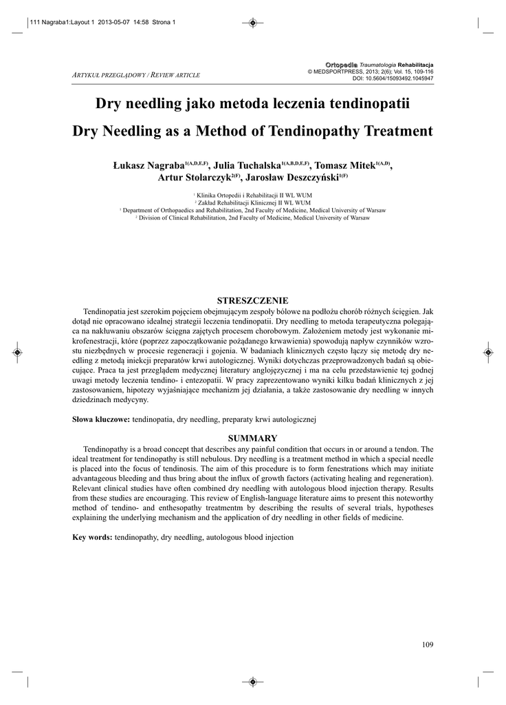 111 Nagraba1:Layout 1 2013-05-07 14:58 Strona 1 O r t o p e d i a Traumatologia Rehabilitacja © MEDSPORTPRESS, 2013; 2(6); Vol. 15, 109-116 DOI: 10.5604/15093492.1045947 ARTYKUŁ PRZEGLĄDOWY / REVIEW ARTICLE Dry needling jako metoda leczenia tendinopatii Dry Needling as a Method of Tendinopathy Treatment Łukasz Nagraba1(A,D,E,F), Julia Tuchalska1(A,B,D,E,F), Tomasz Mitek1(A,D), Artur Stolarczyk2(F), Jarosław Deszczyński1(F) 1 Klinika Ortopedii i Rehabilitacji II WL WUM Zakład Rehabilitacji Klinicznej II WL WUM 1 Department of Orthopaedics and Rehabilitation, 2nd Faculty of Medicine, Medical University of Warsaw 2 Division of Clinical Rehabilitation, 2nd Faculty of Medicine, Medical University of Warsaw 2 STRESZCZENIE Tendinopatia jest szerokim pojęciem obejmującym zespoły bólowe na podłożu chorób różnych ścięgien. Jak dotąd nie opracowano idealnej strategii leczenia tendinopatii. Dry needling to metoda terapeutyczna polegająca na nakłuwaniu obszarów ścięgna zajętych procesem chorobowym. Założeniem metody jest wykonanie mikrofenestracji, które (poprzez zapoczątkowanie pożądanego krwawienia) spowodują napływ czynników wzrostu niezbędnych w procesie regeneracji i gojenia. W badaniach klinicznych często łączy się metodę dry needling z metodą iniekcji preparatów krwi autologicznej. Wyniki dotychczas przeprowadzonych badań są obiecujące. Praca ta jest przeglądem medycznej literatury anglojęzycznej i ma na celu przedstawienie tej godnej uwagi metody leczenia tendino- i entezopatii. W pracy zaprezentowano wyniki kilku badań klinicznych z jej zastosowaniem, hipotezy wyjaśniające mechanizm jej działania, a także zastosowanie dry needling w innych dziedzinach medycyny. Słowa kluczowe: tendinopatia, dry needling, preparaty krwi autologicznej SUMMARY Tendinopathy is a broad concept that describes any painful condition that occurs in or around a tendon. The ideal treatment for tendinopathy is still nebulous. Dry needling is a treatment method in which a special needle is placed into the focus of tendinosis. The aim of this procedure is to form fenestrations which may initiate advantageous bleeding and thus bring about the influx of growth factors (activating healing and regeneration). Relevant clinical studies have often combined dry needling with autologous blood injection therapy. Results from these studies are encouraging. This review of English-language literature aims to present this noteworthy method of tendino- and enthesopathy treatmentm by describing the results of several trials, hypotheses explaining the underlying mechanism and the application of dry needling in other fields of medicine. Key words: tendinopathy, dry needling, autologous blood injection 109 111 Nagraba1:Layout 1 2013-05-07 14:58 Strona 2 Nagraba Ł. i wsp., Dry needling jako metoda leczenia tendinopatii WSTĘP BACKGROUND Tendinopatia jest szerokim pojęciem obejmującym zespoły bólowe na podłożu chorób różnych ścięgien [1]. Dolegliwości związane z tendinopatią obserwuje się częściej w populacji sportowców niż w populacji ogólnej [2]. Szacuje się, że łokieć tenisisty dotyka około 2% populacji ogólnej i niespełna 40% tenisistów, a prawie połowa zawodowych siatkarzy (~44,6%) cierpi z powodu kolana skoczka [36]. Badanie ultrasonograficzne jest cennym narzędziem w diagnostyce choroby, a także w monitorowaniu efektów leczenia [7]. Jak dotąd, nie opracowano idealnej strategii leczenia tendinopatii [8]. Jedną z ciekawszych, nowszych metod jest punkcja igłowa metodą dry needling. Niniejsza praca jest przeglądem literatury medycznej i ma na celu przedstawienie metody, badań klinicznych nad jej zastosowaniem oraz hipotez wyjaśniających mechanizm jej działania. Tendinopathy is a broad concept that describes any painful condition that occurs in or around a tendon. [1]. Tendinopathy-related symptoms are present more commonly in athletes than in the general population [2]. It is estimated that approximately 2% general population and 40% all tennis players suffer from tennis elbow syndrome and about half (~44.6%) of all professional volleyball players have jumper’s knee syndrome [3-6]. The ultrasound examination is a valuable tool in diagnosis and evaluation of treatment outcomes in tendinopathies [7]. An ideal strategy for tendinopathy treatment is yet to be developed [8]. The dry needling technique is one of the most recent methods. The paper is a literature review and aims to describe this treatment method, evaluate supporting clinical data and present hypotheses regarding the underlying biological mechanisms. PRZEZSKÓRNA PUNKCJA IGŁOWA METODĄ DRY NEEDLING PERCUTANEOUS NEEDLE PUNCTURE WITH DRY NEEDLING TECHNIQUE Pojęcie dry needling odnosi się do mało inwazyjnej metody terapeutycznej wykorzystującej punkcję igłową bez iniekcji substancji leczniczych w terapii przewlekłych zespołów bólowych różnego pochodzenia. Po raz pierwszy metody tej użył czechosłowacki lekarz Karel Lewit w roku 1979 do leczenia bólu mięśniowo-powięziowego (fasciomialgii, myofacial pain syndrome). Lewit zauważył, że sukces terapeutyczny stosowanych w tym celu iniekcji nie zależy od właściwości analgetycznych wstrzykiwanej substancji [9]. Od tego czasu prowadzono liczne badania nad zastosowaniem metody dry needling w leczeniu fasciomialgii, zespołów bólowych okolicy lędźwiowo-krzyżowej, zespołu wąskiego kanału kręgowego, a także migreny, a nawet trądziku torbielowatego [10-13]. Wyniki wielu z tych badań kształtują się obiecująco. Dry needling refers to a minimally invasive therapeutic method which utilizes needle puncture without injection of active substances to treat chronic pain of different origin. Czech doctor Karel Lewit was the first to use this method to treat myofascial pain syndrome in 1979. Lewit observed that the therapeutic success of injection had not been dependent on the analgesic properties of injected substances 