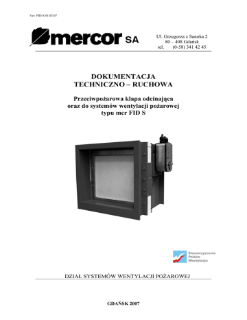 Ver. FID-S 01.02.07 Ul. Grzegorza z Sanoka 2 80 – 408 Gdańsk tel. (0-58) 341 42 45 tel./fax (0-58) 341 39 85 DOKUMENTACJA TECHNICZNO – RUCHOWA Przeciwpożarowa klapa odcinająca oraz do systemów wentylacji pożarowej typu mcr FID S DZIAŁ SYSTEMÓW WENTYLACJI POŻAROWEJ GDAŃSK 2007 FID S przeciwpożarowe klapy jednopłaszczyznowe SPIS TREŚCI: 1. WSTĘP ................................................................................................................................................3 2. PRZEDMIOT DOKUMENTACJI ..........................................................................................................3 3. PRZEZNACZENIE URZĄDZENIA ........................................................................................................3 4. BUDOWA I ZASADA DZIAŁANIA URZĄDZENIA ................................................................................4 5. OZNACZENIE URZĄDZENIA...............................................................................................................7 6. MONTAŻ URZĄDZENIA ......................................................................................................................8 6.1. PRZEGLĄD PRZED MONTAŻEM ...............................................................................................9 6.2. OTWÓR MONTAŻOWY .............................................................................................................9 6.3. WMUROWANIE ..........................................................................................................................9 6.4. PODŁĄCZENIA ELEKTRYCZNE ..............................................................................................14 7. WARUNKI TRANSPORTU I SKŁADOWANIA ....................................................................................19 8. KONSERWACJA I SERWIS ..............................................................................................................19 9. WARUNKI GWARANCJI ....................................................................................................................19 MERCOR SA – Firma zastrzega sobie prawo dokonania modyfikacji i zmian 2/19 FID S przeciwpożarowe klapy jednopłaszczyznowe 1.WSTĘP ______________________________________________________________ Celem niniejszej dokumentacji techniczno – ruchowej (DTR) jest zapoznanie użytkownika z przeznaczeniem, konstrukcją, zasadą działania, prawidłowym montażem i obsługą wyrobu. DTR zawiera również dodatkowe informacje na temat warunków użytkowania, konserwacji oraz warunków gwarancji wyrobu. Poniższa DTR dotyczy całej grupy dymoszczelnych przeciwpożarowych klap typu mcr FID S. Przestrzeganie zaleceń zawartych w DTR zapewni prawidłowe funkcjonowanie urządzenia w zakresie zabezpieczeń przeciwpożarowych pomieszczeń oraz bezpieczeństwo użytkowników systemu. 2.PRZEDMIOT DOKUMENTACJI ______________________________________ Przedmiotem niniejszej dokumentacji techniczno – ruchowej są: Klapy prostokątne mcr FID S/P, Klapy okrągłe mcr FID S/O, Klapy prostokątne z przekładką izolacyjną mcr FID S-p/P, Klapy okrągłe z przekładką izolacyjną mcr FID S-p/O. 3.PRZEZNACZENIE URZĄDZENIA____________________________________ Zastosowanie _____________________________________________________________________ Klapy mcr FID S/S /P, mcr FID S/S p/P, mcr FID S/S /O, mcr FID S/S p/O z wyzwalaczem termicznym przeznaczone są do zabudowy w instalacjach wentylacji ogólnej, w miejscu przechodzenia tych instalacji przez przegrody budowlane. W czasie pożaru klapy te umożliwiają zachowanie odporności ogniowej przegrody budowlanej, przez którą są prowadzone przewody wentylacyjne i klimatyzacyjne. Podczas normalnej pracy instalacji przegroda klapy znajdują się w pozycji otwartej. W przypadku wybuchu pożaru następuje przejście przegrody klapy do pozycji zamkniętej. Klapy mcr FID S/V /P, mcr FID S/V p/P, mcr FID S/V /O, mcr FID S/V p/O mogą być wykonane bez wyzwalacza termicznego. Są to klapy stosowane w systemach wentylacji pożarowej. Podczas normalnej pracy instalacji przegroda klapy znajduje się w pozycji zamkniętej. W przypadku wybuchu pożaru następuje przejście przegrody klapy do pozycji otwartej i umożliwienie oddymiania oraz przepływu przez urządzenie dymu i gazów pożarowych o wysokiej temperaturze. Klapy mcr FID S/M /P, mcr FID S/M p/P, mcr FID S/M /O, mcr FID S/M p/O przeznaczone są również do zabudowy w instalacjach systemu gdzie kanały wentylacyjne pełnią dwie funkcje - wentylacji ogólnej oraz wentylacji oddymiania, w miejscu przechodzenia tych instalacji przez przegrody budowlane. Podczas normalnej pracy instalacji przegroda klapy znajduje się w pozycji otwartej. W przypadku pożaru przegroda klapy pozostaje w pozycji otwartej lub następuje jej przejście do pozycji zamkniętej. Klapy te nie są wyposażone w wyzwalacze termiczne. Odporność ogniowa _______________________________________________________________ EIS 90, EIS90AA, ES120, EIS120AA – w zależności od sposobu i miejsca montażu Wersje wykonania ________________________________________________________________ • • • Odcinające - S Do systemów wentylacji pożarowej (oddymiające) - V Do kanałów dwu funkcyjnych (systemy mieszane) - M MERCOR SA – Firma zastrzega sobie prawo dokonania modyfikacji i zmian 3/19 FID S przeciwpożarowe klapy jednopłaszczyznowe 4.BUDOWA I ZASADA DZIAŁANIA URZĄDZENIA_____________________ Budowa ___________________________________________________________________________ Klapy odcinające typu mcr FID S/... /P i mcr FID S/… /O Klapy odcinające mcr FID S składają się z obudowy o przekroju prostokątnym (mcr FID S /P) lub o przekroju okrągłym (mcr FID S /O), ruchomej przegrody odcinającej oraz mechanizmu wyzwalającosterującego uruchamianego zdalnie lub samoczynnie po zadziałaniu wyzwalacza termicznego. Obudowa klap wykonana jest z blachy stalowej, ocynkowanej, o 