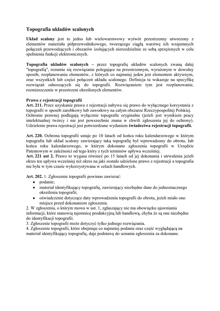 Topografia układów scalonych Układ scalony jest to jedno lub wielowarstwowy wytwór przestrzenny utworzony z elementów materiału półprzewodnikowego, tworzącego ciągłą warstwę ich wzajemnych połączeń przewodzących i obszarów izolujących nierozdzielnie ze sobą sprzężonych w celu spełnienia funkcji elektronicznych. Topografia układów scalonych – przez topografię układów scalonych zwaną dalej "topografią", rozumie się rozwiązanie polegające na przestrzennym, wyrażonym w dowolny sposób, rozplanowaniu elementów, z których co najmniej jeden jest elementem aktywnym, oraz wszystkich lub części połączeń układu scalonego. Definicja ta wskazuje na specyfikę rozwiązań odnoszących się do topografii. Rozwiązaniem tym jest rozplanowanie, rozmieszczenie w przestrzeni określonych elementów. Prawo z rejestracji topografii Art. 211. Przez uzyskanie prawa z rejestracji nabywa się prawo do wyłącznego korzystania z topografii w sposób zarobkowy lub zawodowy na całym obszarze Rzeczypospolitej Polskiej. Ochronie prawnej podlegają wyłącznie topografie oryginalne (jeżeli jest wynikiem pracy intelektualnej twórcy i nie jest powszechnie znana w chwili zgłoszenia jej do ochrony). Udzielenie prawa rejestracji jest potwierdzane wydaniem świadectwa rejestracji topografii. Art. 220. Ochrona topografii ustaje po 10 latach od końca roku kalendarzowego w którym topografia lub układ scalony zawierający taką topografię był wprowadzony do obrotu, lub końca roku kalendarzowego, w którym dokonano zgłoszenia topografii w Urzędzie Patentowym w zależności od tego który z tych terminów upływa wcześniej. Art. 221 ust 2. Prawo to wygasa również po 15 latach od jej dokonania i utrwalenia jeżeli okres ten upływa wcześniej niż okres na jaki zostało udzielone prawo z rejestracji a topografia nie była w tym czasie wykorzystywana w celach handlowych. Art. 202. 1. Zgłoszenie topografii powinno zawierać: podanie; materiał identyfikujący topografię, zawierający niezbędne dane do jednoznacznego określenia topografii; oświadczenie dotyczące daty wprowadzenia topografii do obrotu, jeżeli miało ono miejsce przed dokonaniem zgłoszenia. 2. W zgłoszeniu, o którym mowa w ust. 1, zgłaszający nie ma obowiązku ujawniania informacji, które stanowią tajemnicę produkcyjną lub handlową, chyba że są one niezbędne do identyfikacji topografii. 3. Zgłoszenie topografii może dotyczyć tylko jednego rozwiązania. 4. Zgłoszenie topografii, które obejmuje co najmniej podanie oraz część wyglądającą na materiał identyfikujący topografię, daje podstawę do uznania zgłoszenia za dokonane.