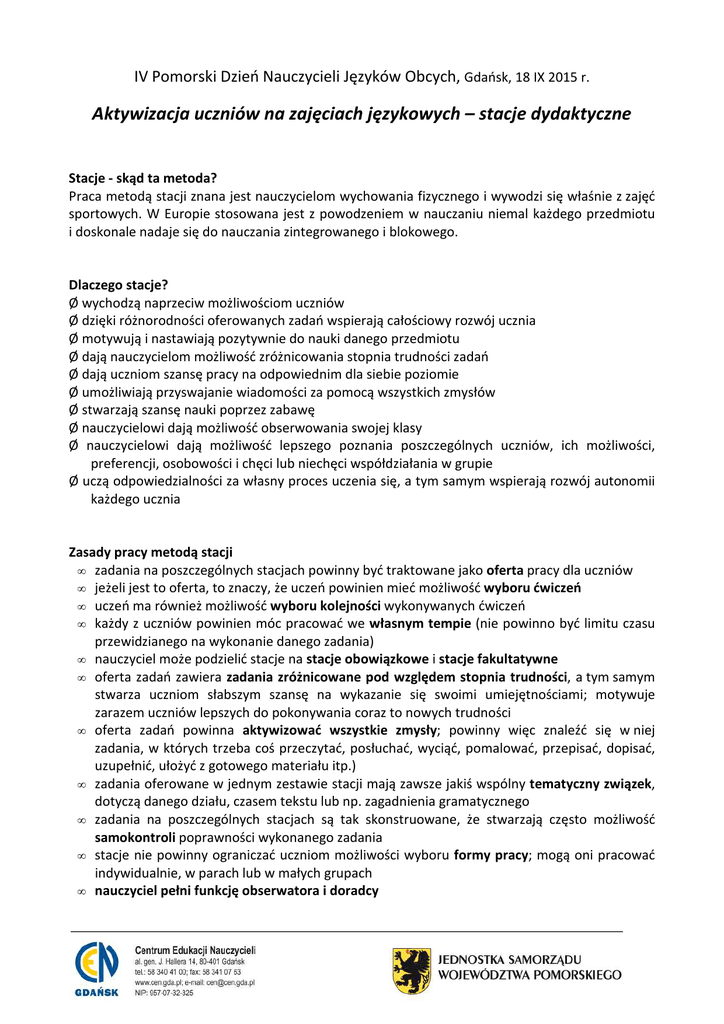 IV Pomorski Dzień Nauczycieli Języków Obcych, Gdańsk, 18 IX 2015 r. Aktywizacja uczniów na zajęciach językowych – stacje dydaktyczne Stacje - skąd ta metoda? Praca metodą stacji znana jest nauczycielom wychowania fizycznego i wywodzi się właśnie z zajęć sportowych. W Europie stosowana jest z powodzeniem w nauczaniu niemal każdego przedmiotu i doskonale nadaje się do nauczania zintegrowanego i blokowego. Dlaczego stacje? Ø wychodzą naprzeciw możliwościom uczniów Ø dzięki różnorodności oferowanych zadań wspierają całościowy rozwój ucznia Ø motywują i nastawiają pozytywnie do nauki danego przedmiotu Ø dają nauczycielom możliwość zróżnicowania stopnia trudności zadań Ø dają uczniom szansę pracy na odpowiednim dla siebie poziomie Ø umożliwiają przyswajanie wiadomości za pomocą wszystkich zmysłów Ø stwarzają szansę nauki poprzez zabawę Ø nauczycielowi dają możliwość obserwowania swojej klasy Ø nauczycielowi dają możliwość lepszego poznania poszczególnych uczniów, ich możliwości, preferencji, osobowości i chęci lub niechęci współdziałania w grupie Ø uczą odpowiedzialności za własny proces uczenia się, a tym samym wspierają rozwój autonomii każdego ucznia Zasady pracy metodą stacji • zadania na poszczególnych stacjach powinny być traktowane jako oferta pracy dla uczniów • jeżeli jest to oferta, to znaczy, że uczeń powinien mieć możliwość wyboru ćwiczeń • uczeń ma również możliwość wyboru kolejności wykonywanych ćwiczeń • każdy z uczniów powinien móc pracować we własnym tempie (nie powinno być limitu czasu przewidzianego na wykonanie danego zadania) • nauczyciel może podzielić stacje na stacje obowiązkowe i stacje fakultatywne • oferta zadań zawiera zadania zróżnicowane pod względem stopnia trudności, a tym samym stwarza uczniom słabszym szansę na wykazanie się swoimi umiejętnościami; motywuje zarazem uczniów lepszych do pokonywania coraz to nowych trudności • oferta zadań powinna aktywizować wszystkie zmysły; powinny więc znaleźć się w niej zadania, w których trzeba coś przeczytać, posłuchać, wyciąć, pomalować, przepisać, dopisać, uzupełnić, ułożyć z gotowego materiału itp.) • zadania oferowane w jednym zestawie stacji mają zawsze jakiś wspólny tematyczny związek, dotyczą danego działu, czasem tekstu lub np. zagadnienia gramatycznego • zadania na poszczególnych stacjach są tak skonstruowane, że stwarzają często możliwość samokontroli poprawności wykonanego zadania • stacje nie powinny ograniczać uczniom możliwości wyboru formy pracy; mogą oni pracować indywidualnie, w parach lub w małych grupach • nauczyciel pełni funkcję obserwatora i doradcy Wskazówki organizacyjne • praca metodą stacji wymaga częściowej zmiany organizacji klasy – poszczególne stacje ustawiamy na pojedynczych stolikach tak, aby mogło przy nich pracować jednocześnie kilku uczniów • powinniśmy zadbać o to, by na każdym stoliku znajdowały się wszystkie materiały potrzebne do wykonania danego ćwiczenia (wędki, karton udający akwarium, klamerki, kostki itp., oraz oczywiście odpowiednia ilość kart pracy ucznia (czasem wystarczy jeden zestaw czasem każdy powinien mieć swój arkusz pracy • zadania na niektórych stacjach wymagają od nauczyciele wcześniejszego przygotowania odpowiednich materiałów dodatkowych lub wycięcia i sklejenia materiałów gotowych. • zanim uczniowie przystąpią do rozwiązywania zadań powinniśmy omówić zasady pracy (jeśli nie są one jeszcze znane) oraz krótko przedstawić poszczególne stacje. • każdy uczeń powinien otrzymać tzw. „kartę zbiorczą” – kartkę, na której wpisze swoje imię i nazwisko i będzie kolejno zaznaczał wykonane zadania lub wpisywał ich rozwiązania. Można na nich umieścić pytania pomocnicze. • w celu zachowania pewnej przejrzystości zadań wykonanych przez poszczególnych uczniów nauczyciel może zrobić, np. na papierze pakowym lub na tablicy, dużą tabelę z nazwiskami uczniów z jednej strony i numerami, czy nazwami stacji z drugiej, na której uczniowie „odhaczają” wykonanie poszczególnych zadań; nauczyciel ma tym samym orientację, ile zadań zostało wykonanych przez ilu uczniów, które cieszą się największym zainteresowaniem itp. • powinniśmy zwrócić uwagę grupy na możliwość wykonywania ćwiczeń w dowolnej kolejności, z kolegą / koleżanką lub bez, w sobie właściwym tempie • zwróćmy również uwagę uczniom na zasady zachowania się, nie niszczenie materiałów, zostawianie stacji w ładzie i porządku, nie przeszkadzanie sobie wzajemnie. • praca metodą stacji lepiej „wychodzi” w klasie podzielonej na grupy. • gdy mamy lekcje w całej klasie; należy pomyśleć o dostatecznie dużym pomieszczeniu, aby uczniowie mogli w miarę swobodnie przemieszczać się pomiędzy poszczególnymi stacjami oraz dostosować ilość stacji do ilości uczniów ( przy jednej stacji może pracować nie przeszkadzając sobie 2 uczniów, w przypadku 30 uczniów oznacza to ok. 15 stacji + 1 stacja “mijankowa”. Niektóre zadania na stacjach można przeznaczyć do wykonania indywidualnego, w parze lub małej grupie uczniów (max.4 osoby). Wówczas stacji będzie odpowiednio mniej. • na osobnej stacji “eksperckiej” układamy podręczniki, słowniki, leksykony, materiały pomocnicze i lekcyjne, można ustawić komputer- stacja ta ma za zadanie pomóc uczniom w poszukaniu rozwiązania, jeśli nie jest on w stanie rozwiązać go bez pomocy. Uczeń może też zweryfikować swoje rozwiązanie, jeśli nie jest go pewny. • w czasie pracy na stacjach uczniowie mogą mieć możliwość skomentowania pracy na piśmie jeśli ustawimy stację „graffiti”, na której jest plakat przeznaczony na komentarze albo collage • w czasie pracy na stacjach uczniowie mogą mieć możliwość skomentowania pracy ustn