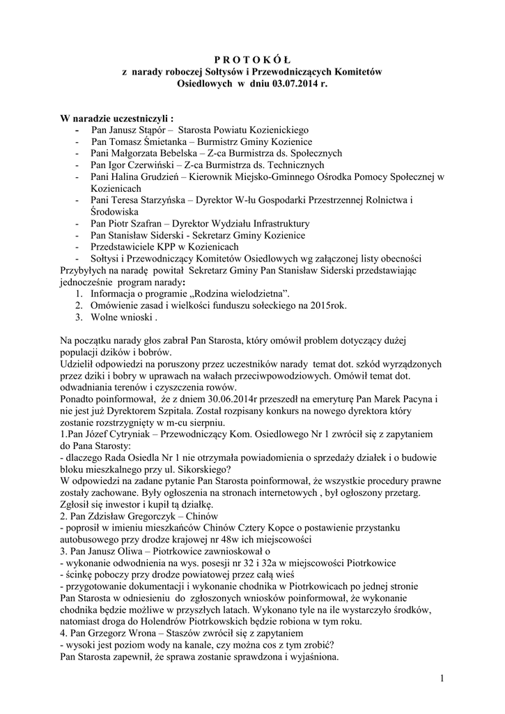 PROTOKÓŁ z narady roboczej Sołtysów i Przewodniczących Komitetów Osiedlowych w dniu 03.07.2014 r. W naradzie uczestniczyli : - Pan Janusz Stąpór – Starosta Powiatu Kozienickiego - Pan Tomasz Śmietanka – Burmistrz Gminy Kozienice - Pani Małgorzata Bebelska – Z-ca Burmistrza ds. Społecznych - Pan Igor Czerwiński – Z-ca Burmistrza ds. Technicznych - Pani Halina Grudzień – Kierownik Miejsko-Gminnego Ośrodka Pomocy Społecznej w Kozienicach - Pani Teresa Starzyńska – Dyrektor W-łu Gospodarki Przestrzennej Rolnictwa i Środowiska - Pan Piotr Szafran – Dyrektor Wydziału Infrastruktury - Pan Stanisław Siderski - Sekretarz Gminy Kozienice - Przedstawiciele KPP w Kozienicach - Sołtysi i Przewodniczący Komitetów Osiedlowych wg załączonej listy obecności Przybyłych na naradę powitał Sekretarz Gminy Pan Stanisław Siderski przedstawiając jednocześnie program narady: 1. Informacja o programie „Rodzina wielodzietna”. 2. Omówienie zasad i wielkości funduszu sołeckiego na 2015rok. 3. Wolne wnioski . Na początku narady głos zabrał Pan Starosta, który omówił problem dotyczący dużej populacji dzików i bobrów. Udzielił odpowiedzi na poruszony przez uczestników narady temat dot. szkód wyrządzonych przez dziki i bobry w uprawach na wałach przeciwpowodziowych. Omówił temat dot. odwadniania terenów i czyszczenia rowów. Ponadto poinformował, że z dniem 30.06.2014r przeszedł na emeryturę Pan Marek Pacyna i nie jest już Dyrektorem Szpitala. Został rozpisany konkurs na nowego dyrektora który zostanie rozstrzygnięty w m-cu sierpniu. 1.Pan Józef Cytryniak – Przewodniczący Kom. Osiedlowego Nr 1 zwrócił się z zapytaniem do Pana Starosty: - dlaczego Rada Osiedla Nr 1 nie otrzymała powiadomienia o sprzedaży działek i o budowie bloku mieszkalnego przy ul. Sikorskiego? W odpowiedzi na zadane pytanie Pan Starosta poinformował, że wszystkie procedury prawne zostały zachowane. Były ogłoszenia na stronach internetowych , był ogłoszony przetarg. Zgłosił się inwestor i kupił tą działkę. 2. Pan Zdzisław Gregorczyk – Chinów - poprosił w imieniu mieszkańców Chinów Cztery Kopce o postawienie przystanku autobusowego przy drodze krajowej nr 48w ich miejscowości 3. Pan Janusz Oliwa – Piotrkowice zawnioskował o - wykonanie odwodnienia na wys. posesji nr 32 i 32a w miejscowości Piotrkowice - ścinkę poboczy przy drodze powiatowej przez całą wieś - przygotowanie dokumentacji i wykonanie chodnika w Piotrkowicach po jednej stronie Pan Starosta w odniesieniu do zgłoszonych wniosków poinformował, że wykonanie chodnika będzie możliwe w przyszłych latach. Wykonano tyle na ile wystarczyło środków, natomiast droga do Holendrów Piotrkowskich będzie robiona w tym roku. 4. Pan Grzegorz Wrona – Staszów zwrócił się z zapytaniem - wysoki jest poziom wody na kanale, czy można cos z tym zrobić? Pan Starosta zapewnił, że sprawa zostanie sprawdzona i wyjaśniona. 1 Ad.1. Programu spotkania Pani V-ce Burmistrz Małgorzata Bebelska i Pani Halina Grudzień Kierownik MGOPS w Kozienicach przypomniały program przyjęty uchwałą Rady Miejskiej Nr XX/192/2012 w Kozienicach z dnia 21 czerwca 2012r „Kozienicka Duża Rodzina” oraz Kozienicka Karta Rodziny”. Powyższy program i karta kierowana jest do rodzin wielodzietnych, zamieszkałych na terenie Gminy Kozienice i składających się z rodziców /opiekunów prawnych mających na utrzymaniu troje i więcej dzieci w wieku do 18 roku życia lub do 24 roku życia jeżeli dziecko uczy się lub studiuje. Ponadto Panie poinformowały, że uzyskanie w/w karty odbywa się na wniosek rodzica/opiekuna prawnego złożony w Miejsko-Gminnym Ośrodku Pomocy Społecznej w Kozienicach przy ul. Skłodowskiej 3, który jest jednostką koordynującą realizację programu. Kozienicka karta rodziny jest imienna, ważna z innym dokumentem potwierdzającym tożsamość. Wydanie karty jest bezpłatne i nastąpi w ciągu 30 dni od daty złożenia kompletnego wniosku a ważna jest jeden rok od dnia wydania. Pani V-ce Burmistrz omówiła program przyjęty w drodze Rozporządzenia Rady Ministrów z dnia 27 maja 2014r w sprawie szczegółowych warunków realizacji Rządowego programu dla rodzin wielodzietnych (Dz. U. z 05.06.2014r poz. 755). Na podstawie w/w rozporządzenia członkowie rodzin wielodzietnych będą mogli otrzymać Kartę Dużej Rodziny. Ogólnopolska Karta Dużej Rodziny jest uzupełnieniem lokalnych kart, które przyznają gminy swoim mieszkańcom. Można jednocześnie korzystać z obu kart rodzinnych. Pani Kierownik poinformowała, że wszelkie dane na wyżej omawiany temat można uzyskać pod adresem rodzina.gov.pl a wnioski można pobrać z internetu i złożyć w MGOPS. Tel. do osoby zajmującą się przyjmowaniem wniosków to (48) 614 65 57. Ad.2. Programu spotkania Pan Sekretarz nawiązując do funduszu sołeckiego zapoznał zebranych z wysokością funduszu, który niewiele będzie wyższy od roku 2013. Ponadto przypomniał co można realizować w ramach tych środków i w jakiej wysokości. Zebrani otrzymali po 2 egz. druków „Protokołów z Zebrania Wiejskiego Sołectwa” w celu wypełnienia i złożenia wniosków w terminie do 30.09.2014r. Zebrani otrzymali : - druki wniosków wraz z załącznikami dot. realizacji funduszu sołeckiego - ofertę półkolonii dla dzieci i młodzieży Związku Młodzieży Wiejskiej na spędzenie wolnego czasu podczas wakacji 2014roku. - Obwieszczenie Wojewody Mazowieckiego – Zarządzenia Nr 93 Wojewody Mazowieckiego z dnia 07 marca 2014 w sprawie ustalenia liczby radnych w wyborach 2014r na obszarze województwa mazowieckiego w celu poinformowania mieszkańców swoich miejscowości poprzez wywieszenie na tablicach ogłoszeń - zaproszenia na XI Kozienicki Dzień Ogórka „POWIŚLE- 2014” na dzień 6 lipca 2014r w celu poinformowania mieszkańców swoich miejscowości. Pan Burmistrz Tomasz Śmietanka zabierając głos poinformował zebr