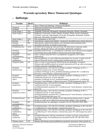 Warunki sprzedaży Qatalogus str 1 z 4 Warunki sprzedaży Biura Tłumaczeń Qatalogus 1. Definicje: Termin Skrót Q Oryginał Przekład Język Grupy 1 Język Grupy 2 JG1 JG2 Język Grupy 3 Korekta Korekta specjalistyczna Przekład prawny JG3 K KS Przekład przysięgły Oryginał niestandardowy Oryginał standardowy Oryginał trudny LEXC Przekład błyskawiczny PB Przekład błyskawiczny native PBN Przekład ekspresowy PE Przekład ekspresowy native PEN Przekład literacki PL Przekład niestandardowy Przekład standardowy Przekład standardowy native Przekład techniczny PN Tłumacz native TN LEX ON OS OT PS PSN PT Qatalogus, Katarzyna Kacprzak Wolska 82 01-141 Warszawa Definicja Biuro Tłumaczeń Qatalogus, Katarzyna Kacprzak dokument przedstawiony do przekładu dokument przełożony Angielski, Francuski, Hiszpański, Niemiecki, Rosyjski, Włoski, Ukraiński Bułgarski, Chorwacki, Czeski, Duński, Estoński, Fiński, Grecki, Kataloński, Litewski, Łotewski, Niderlandzki, Norweski, Portugalski, Rumuński, Serbski, Słowacki, Słoweński, Szwedzki, Węgierski Nie wymieniony w JG1, JG2 sprawdzenie i poprawienie błędów i niejasności przekładu przez innego tłumacza sprawdzenie i poprawienie błędów oraz skomentowanie przekładu przez specjalistę dziedziny przekładu technicznego przekład obowiązującego aktu prawnego lub dokumentu rodzącego skutki prawne, takiego jak umowa, akt notarialny, dokumenty urzędowe; przekład autoryzowany, w szczególności wykonany, przez tłumacza przysięgłego uznawanego przez sądy Polskie i rejestrowany przez tego tłumacza tekst w postaci innej niż OS (w szczególności na papierze, lub w pliku graficznym) tekst przedłożony w wersji elektronicznej dającej się wczytać w trybie 'text' do edytora Microsoft Word z zachowaniem formatowania bez cech OT tekst w wersji wczytywanej do MS Word ale nie spełniający warunków formatowania publikowanych na stronach internetowych Q, np. tekst zawierający obiekty zanurzone (embedded objects) przekład pisemny z JG1 lub JG2 na Polski, przekład z Polskiego na JG1, z szybkością od powyżej 15 stron dziennie; przekład z Polskiego na JG2, przekład pomiędzy językami JG1 z szybkością powyżej 5 stron dziennie; wykonywany przez TZ przekład pisemny z JG1 lub JG2 na Polski, przekład z Polskiego na JG1, z szybkością od powyżej 15 stron dziennie; przekład z Polskiego na JG2, przekład pomiędzy językami JG1 z szybkością powyżej 5 stron dziennie; wykonywany przez TN lub korygowany przez TN przekład pisemny z JG1 lub JG2 na Polski, przekład z Polskiego na JG1, z szybkością od 6 do 15 stron dziennie; przekład pomiędzy językami JG1 z szybkością do 5 stron dziennie, wykonywany przez TZ przekład pisemny z JG1 lub JG2 na Polski, przekład z Polskiego na JG1, z szybkością od 6 do 15 stron dziennie; przekład pomiędzy językami JG1 z szybkością do 5 stron dziennie, wykonywany przez TN lub korygowany przez TN przekład którego styl nie zdradza że jest dokumentem tłumaczonym z innego języka co wiąże się ze całkowitym porzuceniem składni i stylu oryginału przekład pisemny nie spełniający warunków PS, PE, PB; PSN, PEN, PBN; przekład pisemny z JG1 lub JG2 na Polski, przekład z Polskiego na JG1 lub JG2, z szybkością do 5 stron dziennie, wykonywany przez TZ przekład pisemny z JG1 lub JG2 na Polski, przekład z Polskiego na JG1 lub JG2, z szybkością do 5 stron dziennie, wykonywany przez TN, lub korygowany przez TN przekład dokumentu, którego zrozumienie wymaga wyższego wykształcenia specjalistycznego; (ta klasyfikacja jest niezależna od PS, PE, PB; PSN, PEN, PBN, PN tłumacz dla którego język przekładu jest językiem ojczystym i który potrafi się obowiązują od 2006-01-01 ostatnia rewizja 2011-06-24 Warunki sprzedaży Qatalogus Tłumacz zwykły TZ sens i znaczenie koherencja str 2 z 4 wylegitymować co najmniej świadectwem ukończenia szkoły średniej w tym języku lub tłumacz który w opinii innych TN z wykształceniem wyższym posługuje się językiem przekładu równie sprawnie jak TN tłumacz dla którego język przekładu jest językiem wyuczonym; TZ posiada dyplom filologii obcej lub potrafi udokumentować porównywalną znajomość języka w przypadku sporu o sens pojęć 'sens' i 'znaczenie' odnośnikami są: Gottlob Frege - Sens i znaczenie [w Pisma Semantyczne PWN 1977] Kazimierz Ajdukiewicz - O znaczeniu wyrażeń [ w Język i Poznanie PWN 1985] Willard v Orman Quine - Word and Object [wiele wydań w stałej sprzedaży] Przekład jest koherentny wtedy gdy dowolny dobrze zdefiniowany termin oryginału jest przekładany na jeden i tylko jeden dobrze zdefiniowany termin przekładu. 2 Składając zamówienie Klient przyjmuje przedstawione tu Warunki Sprzedaży (WS) 2.1 Umowa pomiędzy Klientem a Q ma pierwszeństwo względem WS. 2.2 Wyłączenie określonych zapisów WS w zamówieniu jest ważne po uzyskaniu potwierdzenia od Q. 2.2.1 Dla zamówień do PLN 1000 wystarcza potwierdzenie pocztą elektroniczną. 2.2.2 Dla zamówień powyżej PLN 1000 do PLN 3000 wystarcza potwierdzenie faksem. 2.2.3 Dla zamówień powyżej PLN 3000 konieczne jest potwierdzenie na piśmie lub podpisane potwierdzenie elektroniczne. 3. Zobowiązania Q 1.1. Jakość przekładu 1.1.1. Gramatyka, styl, słownictwo PS, PE, PB PSN, PEN, PBN LEX, LEXC PT PL Przekład nie będzie irytujący dla czytelnika który ze względów zawodowych musi go przeczytać. Błędy językowe, które nie wypaczają sensu wypowiedzi nie są podstawą do obniżenia ceny lub żądania bezpłatnych poprawek. Przekład odpowiada językowi typowego absolwenta studiów pierwszego stopnia (licencjat, BA), dla którego język przekładu jest ojczysty. Błędy językowe spotykane u osób tak wykształconych nie są podstawą do obniżenia ceny lub żądania bezpłatnych poprawek. W przypadku gdy w dla celów litygacji, tekst oryginału jest nadrzędny względem przekładu, przekład będzie w miarę dosłownie trz