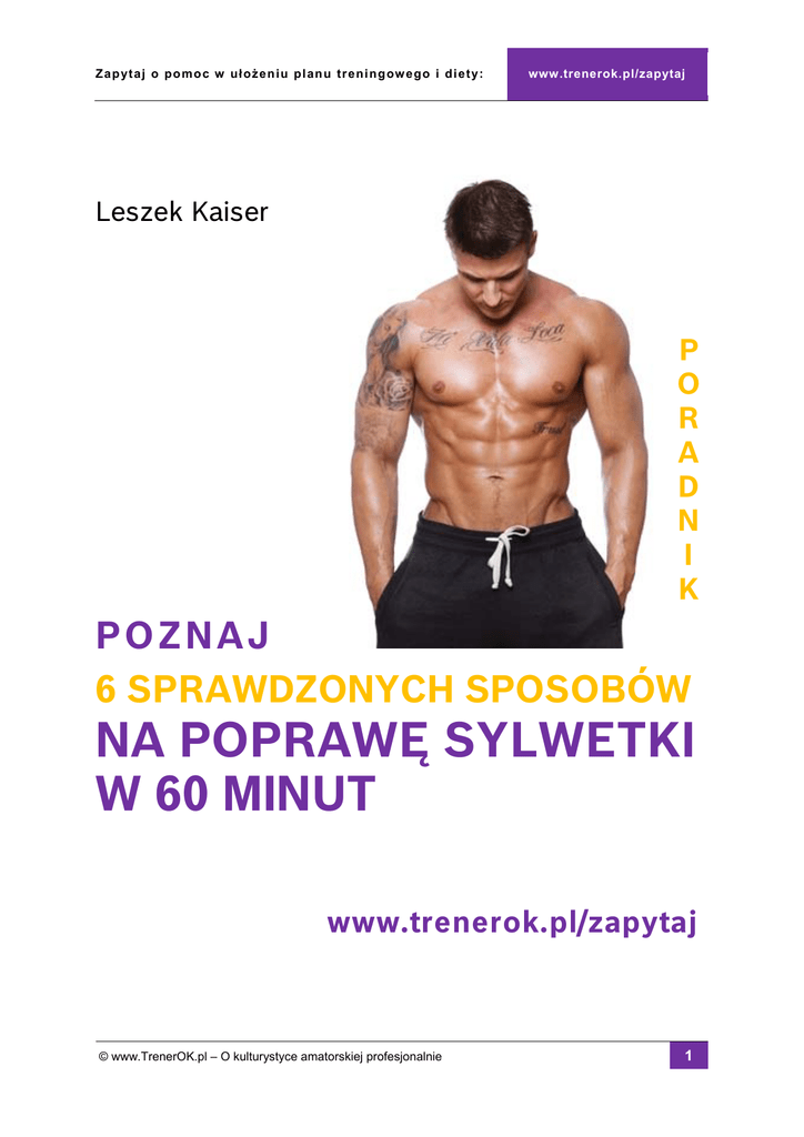 Z ap yt aj o p o m o c w uł oż en i u pl an u t r en i n g ow eg o i d i et y: www.trenerok.pl/zapytaj Leszek Kaiser P O R A D N I K POZNAJ 6 SPRAWDZONYCH SPOSOBÓW NA POPRAWĘ SYLWETKI W 60 MINUT www.trenerok.pl/zapytaj © www.TrenerOK.pl – O kulturystyce amatorskiej profesjonalnie 1 Z ap yt aj o p o m o c w uł oż en i u pl an u t r en i n g ow eg o i d i et y: www.trenerok.pl/zapytaj W tym poradniku zapoznam cię z 6 sposobami, które prowadzą niechybnie do znakomitych efektów, na które oczekujesz. Przeznacz kilkanaście minut na przeanalizowanie poniższych rad i jeszcze chwilę na zaplanowanie, jak je wprowadzisz w praktykę. Na końcu tego opracowania sugeruję pewne działania, które pomogą ci tę wiedzę wdrożyć w twoje życie. © www.TrenerOK.pl – O kulturystyce amatorskiej profesjonalnie 2 Z ap yt aj o p o m o c w uł oż en i u pl an u t r en i n g ow eg o i d i et y: www.trenerok.pl/zapytaj 1. Dobierz metodę treningową do celu Trenując na siłowni możesz mieć różne cele, jakie chcesz osiągnąć. Może to być: ¾ zbudowanie większych mięśni, ¾ zgubienie oponki, ¾ wyrzeźbienie ciała, ¾ zwiększenie siły ogólnej czy specjalistycznej, ¾ poprawa wytrzymałości. Być może w tym momencie powiesz, że chcesz poprawić każdy z wymienionych elementów, ale by zrobić to efektywnie i najszybciej, warto skorzystać z różnych metod treningowych, gdyż zwykle są to cele wymagające realizacji w dłuższym okresie czasu. Niektóre metody są dość uniwersalne, bo np. metoda body building powiększy twoje mięśnie, a większe mięśnie rozwijają większą siłę, gdyż siła zależy od ich przekroju. Trening tą metodą poprawi też twoją wytrzymałość − ale wtedy, gdy wcześniej nic nie trenowałeś… Niemniej jednak metoda body building nie jest najskuteczniejszą, gdy interesuje ciebie efektywne i znaczne zwiększanie siły, po to by rywalizować na zawodach. W końcu © www.TrenerOK.pl – O kulturystyce amatorskiej profesjonalnie 3 Z ap yt aj o p o m o c w uł oż en i u pl an u t r en i n g ow eg o i d i et y: www.trenerok.pl/zapytaj siłacze startują w różnych kategoriach wagowych i dwaj faceci o tej samej masie podnoszą bardzo różniące się ciężary. Inną bardzo ważna metodą treningową w treningu siłowym jest metoda ciężko-atletyczna. Jest to główna metoda, jaką stosują sztangiści i trójboiści. Ta metoda okazuje się też pożyteczna podczas pracy nad wielkością umięśnienia, ale nie powinna być stosowana, gdy mamy na celu poprawę wytrzymałości siłowej. Okazuje się, że każdy cel wymaga wybrania innej metody treningowej, by osiągnąć główny cel najszybciej. Im wyższe cele sobie stawiasz, tym ich realizacja wymaga zastosowania bardziej przemyślanego i zróżnicowanego planu. Praca nad efektowną sylwetką powinna mieć zatem różne etapy a w każdym z nich dominować powinien 1 jasno wyznaczony cel, gdyż to daje najlepsze efekty w dłuższym przedziale czasowym. Uzyskanie pięknej sylwetki to zwykle dłuższy proces z wykorzystaniem kilku metod treningowych, a jak je wykorzystać, by dały efekty spektakularne? To wszystko znajdziesz w kursach: „Programy treningowe dla zaawansowanych”. © www.TrenerOK.pl – O kulturystyce amatorskiej profesjonalnie 4 Z ap yt aj o p o m o c w uł oż en i u pl an u t r en i n g ow eg o i d i et y: www.trenerok.pl/zapytaj 2. W każdy kolejnym treningu zmniejsz liczbę powtórzeń i zwiększ obciążenie Zacznij od 15 powtórzeń w serii, a skończ na 4. To najważniejsza zasada, gdy stosujesz metodę body building w celu zbudowania masy mięśniowej. Trening bez zmian, nie ma sensu, chyba, że chodzi ci tylko o uczęszczanie do siłowni w celach towarzyskich… Dlaczego należy zwiększać obciążenia? Dlatego by nie dopuścić do przyzwyczajenia się twoich mięśni do określonej pracy. Kiedy dołożysz np. na sztangę 2 kg podczas wyciskania sztangi w leżeniu, to twoje mięśnie będą musiały się zmagać z większym obciążeniem niż na poprzednim treningu i zaangażują się nowe włókna mięśniowe, które wcześniej nie pracowały. Być może pomyślisz teraz − to od razu zwiększę ciężar na maksa i zmuszę te włókna do pracy. To tak nie działa − organizm z jednej strony adoptuje się do pracy, ale z drugiej ma swoje ograniczenia i nam pozostaje tylko z nim współpracować i wykorzystywać naturalne procesy, jakie w nim zachodzą. Kiedy stawiasz przed swoim organizmem większe wymagania (większy ciężar do podniesienia) co trening, to on stara się przygotować na taki wysiłek poprzez odpowiednie przygotowanie mięśni. © www.TrenerOK.pl – O kulturystyce amatorskiej profesjonalnie 5 Z ap yt aj o p o m o c w uł oż en i u pl an u t r en i n g ow eg o i d i et y: www.trenerok.pl/zapytaj Jak to działa? Podczas każdego znacznego wysiłku następują mikrouszkodzenia i by zaradzić negatywnym skutkom tego faktu, organizm odbudowuje włókna mięśniowe z nadmiarem − pogrubiają się one wskutek gromadzenia większych ilości substancji energetycznych i budulcowych (podobnie jak złamane kości) − dlatego możesz podołać temu coraz większemu wysiłkowi. 3. Po 6 tygodniach zmień zestaw ćwiczeń We wcześniejszym punkcie napisałem, że organizm adaptuje się do określonej pracy. Ta adaptacja ma 2 oblicza: Pierwsze − dobre − przystosowanie do określonych wymagań, jakie mu stawiamy − dzięki temu możemy poprawiać swoją © www.TrenerOK.pl – O kulturystyce amatorskiej profesjonalnie 6 Z ap yt aj o p o m o c w uł oż en i u pl an u t r en i n g ow eg o i d i et y: www.trenerok.pl/zapytaj formę czy w ogóle pokonywać coraz większe wymagania. To drugie jest jak wymagający ojciec − byś mógł się rozwijać, musisz zmieniać to co robisz − na siłowni to najczęściej oznacza zmianę zestawu ćwiczeń. Zrealizowanie takiego planu treningowego przez okres 4-6 tygodni nazywa się cyklem treningowym. Kolejne takie