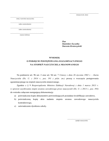 ..................................................... (miejscowość, data) ............................................................ (imię i nazwisko nauczyciela) ............................................................. (adres zamieszkania) ............................................................ (adres zamieszkania) ............................................................ (numer telefonu) Pan Stanisław Szczotka Starosta Krotoszyński WNIOSEK O PODJĘCIE POSTĘPOWANIA EGZAMINACYJNEGO NA STOPIEŃ NAUCZYCIELA MIANOWANEGO Na podstawie art. 9b ust. 2 oraz art. 9d ust. 7 Ustawy z dnia 26 stycznia 1982 r. – Karta Nauczyciela (Dz. U. z 2014 r., poz. 191 z późn. zm.) proszę o wszczęcie postępowania egzaminacyjnego na stopień nauczyciela mianowanego. Zgodnie z § 9 Rozporządzenia Ministra Edukacji Narodowej z dnia 1 marca 2013 r. w sprawie uzyskiwania stopni awansu zawodowego przez nauczycieli (Dz. U. z 2013 r., poz. 393) do wniosku załączam następującą dokumentację: a) poświadczone kopie dokumentów potwierdzających posiadane kwalifikacje zawodowe, b) poświadczoną kopię aktu nadania stopnia awansu zawodowego nauczyciela kontraktowego, c) zaświadczenie dyrektora szkoły. .......................................... (podpis nauczyciela)