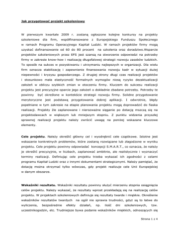 Jak przygotować projekt szkoleniowy W pierwszym kwartale 2009 r. zostaną ogłoszone kolejne konkursy na projekty szkoleniowe dla firm, współfinansowane z Europejskiego Funduszu Społecznego w ramach Programu Operacyjnego Kapitał Ludzki. W ramach projektów firmy mogą uzyskać dofinansowanie od 60 do 80 procent na szkolenia oraz doradztwo.Wsparcie projektów szkoleniowych przez EFS jest szansą na stworzenie odpowiedzi na potrzeby firmy w zakresie know-how i realizację długofalowej strategii rozwoju zasobów ludzkich. To sposób na sukces w pozyskiwaniu i utrzymaniu najlepszych w organizacji. Dla wielu firm oznacza stabilizację i zapewnienie finansowania rozwoju kadr w sytuacji duŜej niepewności i kryzysu gospodarczego. Z drugiej strony długi czas realizacji projektów i stosunkowo mała elastyczność formalnych wymogów niosą ryzyko dezaktualizacji załoŜeń w obliczu szybkich zmian w otoczeniu firmy. Kluczem do sukcesu realizacji projektu jest precyzyjne oparcie jego załoŜeń o dokładnie zbadane potrzeby. Potrzeby te powinny być określone w kontekście strategii rozwoju firmy. Solidne przygotowanie merytoryczne jest podstawą przygotowania dobrej aplikacji. I odwrotnie, błędy popełniane w tym zakresie na etapie planowania projektu mogą doprowadzić do fiaska realizacji. Projekty źle zaplanowane i nierozwaŜne sięganie po dotację mszczą się na projektodawcach w większym lub mniejszym stopniu. Z punktu widzenia przyszłej sprawnej realizacji projektu naleŜy zwrócić uwagę na poniŜej wskazane kluczowe elementy. Cele projektu. NaleŜy określić główny cel i wyodrębnić cele cząstkowe. Istotne jest wskazanie konkretnych problemów, które zostaną rozwiązane lub złagodzone w wyniku projektu. Cele projektu powinny odpowiadać koncepcji S.M.A.R.T., co oznacza, Ŝe naleŜy je określić precyzyjnie, w liczbach, zaplanować ambitnie, ale realistycznie i wyznaczyć terminy realizacji. Definiując cele projektu trzeba wykazać ich zgodności z celami programu Kapitał Ludzki oraz z innymi dokumentami strategicznymi. NaleŜy pamiętać, Ŝe dotację moŜna otrzymać tylko wówczas, gdy projekt realizuje cele Unii Europejskiej w danym obszarze. Wskaźniki rezultatu. Wskaźniki rezultatu powinny słuŜyć mierzeniu stopnia osiągnięcia celów projektu. NaleŜy wykazać, Ŝe rezultaty wprost przekładają się na realizację celów projektu. W projektach szkoleniowych definiuje się rezultaty twarde i miękkie. Określenie wskaźników rezultatów twardych wyliczenia, bezpośrednie efekty na ogół nie sprawia trudności, gdyŜ są to łatwe do działań, np. ilość dni szkoleniowych, tzw. uczestnikogodzin, etc. Trudniejsze bywa podanie wskaźników miękkich, odnoszących się Strona 1 z 4 do kompetencji i postaw oraz określenie ich wartości i sposobów mierzenia. Najczęściej popełniane błędy to określenie wskaźników rezultatu, których nie moŜna zmierzyć w obiektywny sposób lub takich, których wartość zaleŜy od wielu czynników, a nie wynika wyłącznie wprost z działań realizowanych w projekcie. Przykładowo szkolenia z technik sprzedaŜy są w stanie dostarczyć wybranym osobom niezbędne kompetencje i przygotować zespół handlowców do sprzedaŜy produktów. Zbyt śmiałym natomiast jest załoŜenie, Ŝe wyłącznie w wyniku szkoleń handlowcy zwiększą sprzedaŜ o konkretną wartość. Ta bowiem zaleŜy od wielu innych czynników wewnątrz firmy i w jej otoczeniu. Wskaźniki rezultatu naleŜy definiować rozwaŜnie pamiętając, Ŝe z jednej strony w duŜej mierze decydują one o atrakcyjności projektu dla oceniających, z drugiej stanowią zobowiązanie dla firmy. Program szkoleniowy skrojony na miarę. Nieadekwatny do aktualnych potrzeb, rozpatrywanych w kontekście rozwoju firm, program szkoleniowy nie jest w stanie przyciągnąć uczestników. Kluczem do zapewnienia frekwencji na szkoleniach i płynnej realizacji projektu jest przeprowadzenie dogłębnej analizy potrzeb szkoleniowych na etapie tworzenia projektu. Konieczne jest zaplanowanie jej bieŜącej aktualizacji w trakcie projektu i uwzględnianie płynących z niej wniosków w tematyce szkoleń. Przy tym trzeba pamiętać, Ŝe jeśli w trakcie projektu konieczne będą znaczące zmiany w tematyce szkoleń, będą one wymagały zgody instytucji wdraŜającej i będą uwarunkowane m.in. utrzymaniem celów projektu. Harmonogram. Musi obejmować wszystkie działania w projekcie i uwzględniać niezbędne rezerwy czasowe. Nie naleŜy rezygnować z wnikliwej analizy przyszłych terminów wykonania działań, gdyŜ moŜe okazać się, Ŝe ramy czasowe projektu wymuszą cięcia i ograniczenia rzeczowe. W praktyce zdarzają się projekty nie uwzględniające np. sezonowości w branŜy i dostępności uczestników. Konsekwencją moŜe być niewystarczająca frekwencja na szkoleniach i niemoŜność zrealizowania załoŜonych działań. NaleŜy pamiętać, Ŝe projekty współfinansowane róŜnią się od rynkowego zakupu szkoleń, do jakiego przywykły podmioty rynkowe. Cechuje je mała dowolność działań i ograniczona elastyczność. Wprowadzanie zmian do harmonogramu i zmiany ustalonych terminów wymagają zgody instytucji wdraŜającej, a bywa, Ŝe są niemoŜliwe. Konsekwencje nieprzestrzegania terminów, czy konieczności wprowadzania nagłych zmian mogą mieć powaŜniejsze, finansowe konsekwencje - zdecydowanie inne niŜ te, do których przywykły podmioty rynkowe. Strona 2 z 4 Finanse w projekcie. Na potrzeby projektu szkoleniowego sporządza się budŜet zadaniowy. Konstrukcja ta pozwala na precyzyjne oszacowanie kosztów poszczególnych działań i uzyskanie wysokiej efektywności kosztowej. W budŜecie projektu moŜna ująć wyłącznie pozycje niezbędne do realizacji celów projektu i zgodne z katalogiem wydatków kwalifikowanych. Konstruując budŜet naleŜy pamiętać, Ŝe jego łączna, nominalna wartość nie będzie mogła zostać zwiększona. Niezwykle istot