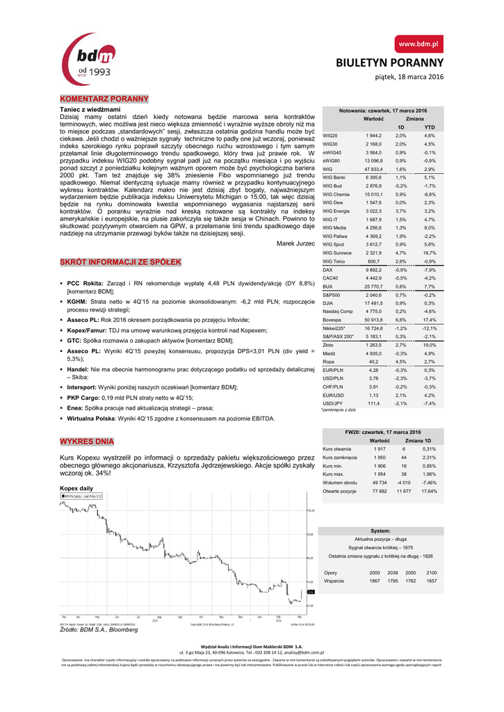 BIULETYN PORANNY piątek, 18 marca 2016 KOMENTARZ PORANNY Taniec z wiedźmami Dzisiaj mamy ostatni dzień kiedy notowana będzie marcowa seria kontraktów terminowych, wiec możliwa jest nieco większa zmienność i wyraźnie wyższe obroty niż ma to miejsce podczas „standardowych” sesji, zwłaszcza ostatnia godzina handlu może być ciekawa. Jeśli chodzi o ważniejsze sygnały techniczne to padły one już wczoraj, ponieważ indeks szerokiego rynku poprawił szczyty obecnego ruchu wzrostowego i tym samym przełamał linie długoterminowego trendu spadkowego, który trwa już prawie rok. W przypadku indeksu WIG20 podobny sygnał padł już na początku miesiąca i po wyjściu ponad szczyt z poniedziałku kolejnym ważnym oporem może być psychologiczna bariera 2000 pkt. Tam też znajduje się 38% zniesienie Fibo wspomnianego już trendu spadkowego. Niemal identyczną sytuacje mamy również w przypadku kontynuacyjnego wykresu kontraktów. Kalendarz makro nie jest dzisiaj zbyt bogaty, najważniejszym wydarzeniem będzie publikacja indeksu Uniwersytetu Michigan o 15:00, tak więc dzisiaj będzie na rynku dominowała kwestia wspomnianego wygasania najstarszej serii kontraktów. O poranku wyraźnie nad kreską notowane są kontrakty na indeksy amerykańskie i europejskie, na plusie zakończyła się także sesja w Chinach. Powinno to skutkować pozytywnym otwarciem na GPW, a przełamanie linii trendu spadkowego daje nadzieję na utrzymanie przewagi byków także na dzisiejszej sesji. Marek Jurzec SKRÓT INFORMACJI ZE SPÓŁEK Notowania: czwartek, 17 marca 2016 Wartość Zmiana 1D YTD 4,6% WIG20 1 944,2 2,0% WIG30 2 168,0 2,0% 4,5% mWIG40 3 564,0 0,9% -0,1% sWIG80 13 096,8 0,9% -0,9% WIG 47 833,4 1,6% 2,9% WIG Banki 6 395,6 1,1% 5,1% WIG Bud 2 876,9 -0,2% -1,7% WIG Chemia 15 010,1 0,9% -8,8% WIG Dew 1 547,6 0,0% 2,3% WIG Energia 3 022,3 3,7% 3,2% WIG IT 1 687,9 1,5% 4,7% WIG Media 4 256,6 1,3% 8,0% WIG Paliwa 4 369,2 1,9% -2,2% WIG Spoż 3 612,7 0,9% 5,6% WIG Surowce 2 321,9 4,7% 18,7% 800,7 2,6% -0,9% DAX 9 892,2 -0,9% -7,9% CAC40 4 442,9 -0,5% -4,2% BUX 25 770,7 0,6% 7,7% S&P500 2 040,6 0,7% -0,2% KGHM: Strata netto w 4Q’15 na poziomie skonsolidowanym: -6,2 mld PLN; rozpoczęcie procesu rewizji strategii; DJIA 17 481,5 0,9% 0,3% Nasdaq Comp 4 775,0 0,2% -4,6% Asseco PL: Rok 2016 okresem porządkowania po przejęciu Infovide; Bovespa 50 913,8 6,6% 17,4% Kopex/Famur: TDJ ma umowę warunkową przejęcia kontroli nad Kopexem; Nikkei225* 16 724,8 -1,2% -12,1% S&P/ASX 200* 5 183,1 0,3% -2,1% Złoto 1 263,5 2,7% 19,0% Miedź 4 935,0 -0,3% 4,9% Ropa 40,2 4,5% 2,7% EUR/PLN 4,28 -0,3% 0,3% USD/PLN 3,78 -2,3% -3,7% Intersport: Wyniki poniżej naszych oczekiwań [komentarz BDM]; CHF/PLN 3,91 -0,2% -0,3% PKP Cargo: 0,19 mld PLN straty netto w 4Q’15; EUR/USD 1,13 2,1% 4,2% USD/JPY 111,4 -2,1% -7,4% PCC Rokita: Zarząd i RN rekomenduje wypłatę 4,48 PLN dywidendy/akcję (DY 8,8%) [komentarz BDM]; GTC: Spółka rozmawia o zakupach aktywów [komentarz BDM]; Asseco PL: Wyniki 4Q’15 powyżej konsensusu, propozycja DPS=3,01 PLN (div yield = 5,3%); Handel: Nie ma obecnie harmonogramu prac dotyczącego podatku od sprzedaży detalicznej – Skiba; Enea: Spółka pracuje nad aktualizacją strategii – prasa; WIG Telco *zamknięcie z dziś Wirtualna Polska: Wyniki 4Q’15 zgodne z konsensusem na poziomie EBITDA. FW20: czwartek, 17 marca 2016 Wartość WYKRES DNIA Kurs Kopexu wystrzelił po informacji o sprzedaży pakietu większościowego przez obecnego głównego akcjonariusza, Krzysztofa Jędrzejewskiego. Akcje spółki zyskały wczoraj ok. 34%! Kopex daily Zmiana 1D Kurs otwarcia 1 917 6 0,31% Kurs zamknięcia 1 950 44 2,31% Kurs min. 1 906 16 0,85% Kurs max. 1 954 38 1,98% Wolumen obrotu 49 734 -4 010 -7,46% Otwarte pozycje 77 882 11 677 17,64% System: Aktualna pozycja – długa Sygnał otwarcia krótkiej – 1875 Ostatnia zmiana sygnału z krótkiej na długą - 1826 Opory 2000 2038 2050 2100 Wsparcia 1867 1795 1762 1657 Źródło: BDM S.A., Bloomberg Wydział Analiz i Informacji Dom Maklerski BDM S.A. ul. 3-go Maja 23, 40-096 Katowice, Tel.: 032 208 14 12, [email protected] Opracowanie ma charakter czysto informacyjny i zostało opracowany na podstawie informacji uznanych przez autorów za wiarygodne . Zawarte w nim komentarze są subiektywnymi poglądami autorów. Opracowanie i zawarte w nim komentarze nie są podstawą żadnej rekomendacji kupna bądź sprzedaży w rozumieniu obowiązującego prawa i nie powinny być tak interpretowane. Publikowanie w prasie lub w Internecie całości lub części opracowania wymaga zgody sporządzających raport. BIULETYN PORANNY piątek, 18 marca 2016 GPW PODSUMOWANIE FW20 (1,913.00, 1,946.00, 1,901.00, 1,935.00, +29.0000) Indeksy GPW 2200 2150 2100 2050 2000 1950 1900 1850 1800 1750 1700 1650 31 7 14 September 21 28 5 12 October 19 26 2 9 16 November 23 30 7 14 December 21 4 11 2016 18 25 1 8 15 February 22 29 7 March 14 21 28 April WIG20 (1,907.65, 1,951.48, 1,907.65, 1,944.21, +38.5200) 2200 2150 2100 Open Low High Close WIG20 1 907,7 1 907,7 1 951,5 1 944,2 2,0% 779 WIG30 2 136,6 2 131,7 2 174,6 2 168,0 2,0% 825 mWIG40 3 541,5 13 019,6 13 096,8 3 564,0 0,9% 177 sWIG80 13 023,3 3 541,3 3 569,0 13 096,8 0,9% 41 WIG-PL 48 261,9 48 261,9 48 783,3 48 783,3 1,6% 948 WIG 47 292,9 47 201,0 47 937,6 47 833,4 1,6% 962 WIG20 Cena Mkt Cap Alior 68,50 1950 1900 1850 1800 1750 1700 1650 7 14 September 21 28 5 12 October 19 26 2 9 16 November 23 30 7 14 December 21 4 11 2016 18 25 1 8 15 February 22 29 7 March 14 21 28 April KOMENTARZ POPOŁUDNIOWY FED pomógł rynkom wschodzącym Wczorajsza decyzja FED została przez inwestorów przyjęta optymistycznie, najcieplej zaś przyjęły ją rynki wschodzące zyskujące na tańszym dolarze i droższych surowcach. W związku z tym dziś w Warszawie dominowali kupujący i WIG20 zyskał na wartości bardzo solidne 2%. Liderem był KGHM, gdzie najwyraźniej widać było przypływ kapitału zagranicznego – akcje podrożały o