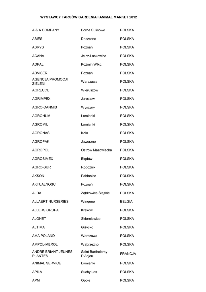 WYSTAWCY TARGÓW GARDENIA I ANIMAL MARKET 2012 A & A COMPANY Borne Sulinowo POLSKA ABIES Deszczno POLSKA ABRYS Poznań POLSKA ACANA Jelcz-Laskowice POLSKA ADPAL Koźmin Wlkp. POLSKA ADVISER Poznań POLSKA AGENCJA PROMOCJI ZIELENI Warszawa POLSKA AGRECOL Wieruszów POLSKA AGRIMPEX Jarosław POLSKA AGRO-DANMIS Wyszyny POLSKA AGROHUM Łomianki POLSKA AGROMIL Łomianki POLSKA AGRONAS Koło POLSKA AGROPAK Jaworzno POLSKA AGROPOL Ostrów Mazowiecka POLSKA AGROSIMEX Błędów POLSKA AGRO-SUR Rogoźnik POLSKA AKSON Pabianice POLSKA AKTUALNOŚCI Poznań POLSKA ALDA Ząbkowice Śląskie POLSKA ALLAERT NURSERIES Wingene BELGIA ALLERS GRUPA Kraków POLSKA ALONET Skierniewice POLSKA ALTIMA GiŜycko POLSKA AMA POLAND Warszawa POLSKA AMPOL-MEROL Wąbrzeźno POLSKA ANDRE BRIANT JEUNES PLANTES Saint Barthelemy D'Anjou FRANCJA ANIMAL SERVICE Łomianki POLSKA APILA Suchy Las POLSKA APM Opole POLSKA AQUAEL Warszawa POLSKA AQUA-SZUT Wrocław POLSKA ARGI Mirsk POLSKA ARIES POWER EQUIPMENT Warszawa POLSKA ARTKRIS Ruda Śląska POLSKA AVANT POLSKA Przybysławice POLSKA A-Z DECOR Nadarzyn POLSKA AZAN Radom POLSKA BADIS Warszawa POLSKA BAJA Zabrze POLSKA BANASIAK SZKÓŁKA KRZEWÓW OZDOBNYCH Góra Św. Małgorzaty POLSKA BARCIKOWSKI Pakość POLSKA BARENBRUG POLSKA Tarnowo Podgórne POLSKA BARTEX śagań POLSKA BAYER Warszawa POLSKA BAZKAR Inowrocław POLSKA BEAPHAR Reda POLSKA BELLOTA HERRAMIENTAS Legazpi (Guipuzcoa) HISZPANIA BEN GARDEN Deszczno POLSKA BENEX GARDENS Chrzypsko Wielkie POLSKA BENEX GARDENS Chrzypsko Wielkie POLSKA BEPPE Zawiercie POLSKA BEREZIŃSCY Tuszyn POLSKA BEST-PEST Jaworzno POLSKA BIO-PRODUKTY Szczecin POLSKA BIOVITA Tenczynek POLSKA BIO-WORLD Brudzew POLSKA BLOEMISTERIJ LEYBAERT BVBA Moerbeke-Waas BELGIA BODNAR Strzegom POLSKA BOGUSZYCKIE MIODY Szczecin POLSKA BONITA Poznań POLSKA BOOMKWEKERIJ Em Eefde HOLANDIA BÓR SZKÓŁKA DRZEW I KRZEWÓW OZDOBNYCH Sędziszów POLSKA BRADAS Olesno POLSKA BRINKMAN POLSKA Tychy POLSKA BROS Poznań POLSKA BROWAR EDI Wschowa POLSKA BRUNO NEBELUNG Everswinkel NIEMCY BUKANO Baniocha POLSKA BUSZREM Piotrków Trybunalski POLSKA BYCZKOWSKI Kostrzyn Wlkp. POLSKA CANIFEL Puszczykowo POLSKA CASTING K.S. POLAND Bydgoszcz POLSKA CELL-FAST Stalowa Wola POLSKA CENTER PLAST Jemielnica POLSKA CENTNAS Krotoszyn POLSKA CENTRUM TECHNIKI ROLNICZEJ Środa Wlkp. POLSKA CERAMIK- ART Lublin POLSKA CERAMIKA Lutomiersk POLSKA CERAMIKA SZAMOTOWA Świerzawa POLSKA CERES INTERNATIONAL Pyzdry POLSKA CERTECH Niedomice POLSKA CHOMIK Gdów POLSKA CHRISTOPHER GROENVERZORGING Lienden HOLANDIA CHRONOS Komorów POLSKA CHWIEDUK JAKUB Bygdoszcz POLSKA CICCOLELLA Honselersdijk HOLANDIA CIEPŁUCHA Konstantynów Łódzki POLSKA CLEMATIS Pruszków POLSKA CLEMATISY Kolincz POLSKA CNOS-GARDEN Komorniki POLSKA COMECO Płock POLSKA COMPO POLSKA Poznań POLSKA CONICA śory POLSKA COVAL Gdynia POLSKA CSF Rzeszów POLSKA CTH Zabrze POLSKA DĄBRÓWKA Lgota Wielka POLSKA DE MARTELAER BVBA Zelzate BELGIA DE MOLENPOL Opheusden HOLANDIA DECO- FLORA Michałów-Regionów POLSKA DEFORCHE CONSTRUCT Izegem BELGIA DELIS ARTUR FERENC Zabrze POLSKA DENDROFARMA Szadek POLSKA DOMINO Poznań POLSKA DOMINO Warszawa POLSKA DON PLAST Kraków POLSKA DON-KWIAT Kraśnik POLSKA DRAGO Gdańsk POLSKA DREWSMOL Lędziny POLSKA DUDA - CARS Poznań POLSKA DURPETA Kupiskis LITWA DZIALKOWIEC Warszawa POLSKA EASYPET Wyględy POLSKA EBA Krosno POLSKA ECO-LAND Barwice POLSKA EDEN GARDEN Goleniów POLSKA EKOBAT Łódź POLSKA EKO-BORD SYSTEM Komorniki POLSKA EKOBRASS Kłomnice POLSKA EKONAW Poznań POLSKA EKO-PARK Bydgoszcz POLSKA ELDRUT Wadowice Górne POLSKA ELKNER-SERVICE Skierniewice POLSKA ELWA-KONAR Gorzów Wlkp. POLSKA EMMA Poznań POLSKA ERBIS Wrocław POLSKA EUROFLORA Kalisz POLSKA EUROSYSTEM Przywory POLSKA EUROWIT Jarocin POLSKA EWAX Wrocław POLSKA EWENEMENT Wrocław POLSKA EXTECH Kraków POLSKA FARMER Bochnia POLSKA Michałowice POLSKA Plewiska POLSKA FIRMA OGRODNICZA Dankowice POLSKA FISKARS Słupsk POLSKA FLORALAND Nieporęt POLSKA FLORAMEDIA POLSKA Skierniewice POLSKA FLORENSIS POLSKA Warszawa POLSKA FLORIBRAS Śrem POLSKA FLORTOM Bydgoszcz POLSKA FOKUS Sulechów POLSKA FOKUS Sulechów POLSKA FORMA - CERAMIKA Białe Błota POLSKA FOSFAN Szczecin POLSKA FRITZ KAUSEK Mittenwalde NIEMCY GALA PRODUKT Oborniki Wielkopolskie POLSKA GALDA Gdańsk POLSKA GARDENIS Kaunas LITWA GARDEX Września POLSKA GARTE Swarzędz POLSKA GASTRO PLUS Poznań POLSKA GEO Imielin POLSKA GEOTABO Wrocław POLSKA GIS Czarny Bór POLSKA Baranowo POLSKA Baranowo POLSKA Słomniki POLSKA GOSPODARSTWO OGRODNICZE Owińska LABORATORIUM KULTUR TKANKOWYCH GRZEGORZ GRABARKIEWICZ POLSKA FARMINA PET FOODS POLSKA FIMTEC-POLSKA BELLDECO GLOBAL GARDEN PRODUKTS GLOBAL GARDEN PRODUKTS GOSPODARSTWO OGRODNICZE KUSIBABWYKA ALEKSANDRA GOSPODARSTWO OGRODNICZOSZKÓŁKARSKIE Kostrzyn Wlkp. POLSKA GOSPODARSTWO SZKÓŁKARSKIE Świerklaniec POLSKA GOSPODARSTWO SZKÓŁKARSKIE MARCINKÓW Bralin POLSKA GÓRALEKS-D Grębów POLSKA GRAFICOM Gdańsk POLSKA GRANDE FINALE Gdańsk POLSKA GRANUM Wodzierady POLSKA GREEN FINGERS Szczecin POLSKA GREEN-LAND Michalowice POLSKA GRUDZIŃSKI Sompolno POLSKA H.G. BRAUNE Jawor POLSKA HAIFA Mechelen BELGIA HANDELSKWEKERIJ G. HOOGENRAAD Ederveen HOLANDIA HAPPET Luboń POLSKA HIMAL Łódź POLSKA HOLLAS Pasłęk POLSKA HORTICO Wrocław POLSKA HORTMASZ Skierniewice POLSKA HORTNAS Góra POLSKA HORTPRESS Warszawa POLSKA HYDROKOMPLET Poczesna POLSKA IGLAK Osuchów POLSKA IMAGO Imielin POLSKA INFOMAX Kielce POLSKA INKLUZ Poznań POLSKA INTERGRAN Gorzów Śląski POLSKA INTERMAG Olkusz POLSKA INTERMAS POLSKA Poznań POLSKA INTERPLAST PLASTIC PRODUCTS Bytom POLSKA J.R. MOTOR SERVICES Sopot POLSKA JAAR Poznań POLSKA JAAR Poznań POLSKA JADORNA Poznań POLSKA JAF POLSKA Rokietnica POLSKA JOHN DEERE POLSKA Suchy Las POLSKA JOKER Poznań POLSKA JOSERA POLSKA Nowy Tomyśl POLSKA JUWEL Rybnik POLSKA KAMIENIARSTWO Mrągowo POLSKA KAPIAS Goczałkowice Zdrój POLSKA KD MEDIA Gdynia POLSKA KETTLER Wieleń POLSKA KIK KRAJEWSCY Leśniakowizna POLSKA KLINK Olsztyn POL