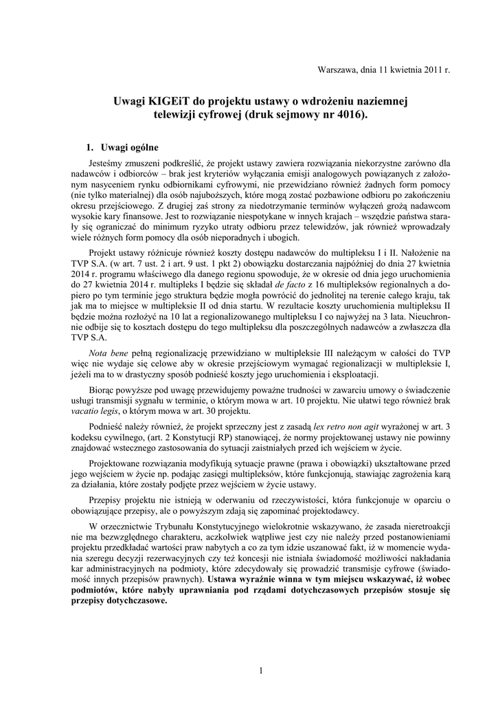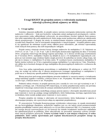 Warszawa, dnia 11 kwietnia 2011 r. Uwagi KIGEiT do projektu ustawy o wdroŜeniu naziemnej telewizji cyfrowej (druk sejmowy nr 4016). 1. Uwagi ogólne Jesteśmy zmuszeni podkreślić, Ŝe projekt ustawy zawiera rozwiązania niekorzystne zarówno dla nadawców i odbiorców – brak jest kryteriów wyłączania emisji analogowych powiązanych z załoŜonym nasyceniem rynku odbiornikami cyfrowymi, nie przewidziano równieŜ Ŝadnych form pomocy (nie tylko materialnej) dla osób najuboŜszych, które mogą zostać pozbawione odbioru po zakończeniu okresu przejściowego. Z drugiej zaś strony za niedotrzymanie terminów wyłączeń groŜą nadawcom wysokie kary finansowe. Jest to rozwiązanie niespotykane w innych krajach – wszędzie państwa starały się ograniczać do minimum ryzyko utraty odbioru przez telewidzów, jak równieŜ wprowadzały wiele róŜnych form pomocy dla osób nieporadnych i ubogich. Projekt ustawy róŜnicuje równieŜ koszty dostępu nadawców do multipleksu I i II. NałoŜenie na TVP S.A. (w art. 7 ust. 2 i art. 9 ust. 1 pkt 2) obowiązku dostarczania najpóźniej do dnia 27 kwietnia 2014 r. programu właściwego dla danego regionu spowoduje, Ŝe w okresie od dnia jego uruchomienia do 27 kwietnia 2014 r. multipleks I będzie się składał de facto z 16 multipleksów regionalnych a dopiero po tym terminie jego struktura będzie mogła powrócić do jednolitej na terenie całego kraju, tak jak ma to miejsce w multipleksie II od dnia startu. W rezultacie koszty uruchomienia multipleksu II będzie moŜna rozłoŜyć na 10 lat a regionalizowanego multipleksu I co najwyŜej na 3 lata. Nieuchronnie odbije się to kosztach dostępu do tego multipleksu dla poszczególnych nadawców a zwłaszcza dla TVP S.A. Nota bene pełną regionalizację przewidziano w multipleksie III naleŜącym w całości do TVP więc nie wydaje się celowe aby w okresie przejściowym wymagać regionalizacji w multipleksie I, jeŜeli ma to w drastyczny sposób podnieść koszty jego uruchomienia i eksploatacji. Biorąc powyŜsze pod uwagę przewidujemy powaŜne trudności w zawarciu umowy o świadczenie usługi transmisji sygnału w terminie, o którym mowa w art. 10 projektu. Nie ułatwi tego równieŜ brak vacatio legis, o którym mowa w art. 30 projektu. Podnieść naleŜy równieŜ, Ŝe projekt sprzeczny jest z zasadą lex retro non agit wyraŜonej w art. 3 kodeksu cywilnego, (art. 2 Konstytucji RP) stanowiącej, Ŝe normy projektowanej ustawy nie powinny znajdować wstecznego zastosowania do sytuacji zaistniałych przed ich wejściem w Ŝycie. Projektowane rozwiązania modyfikują sytuacje prawne (prawa i obowiązki) ukształtowane przed jego wejściem w Ŝycie np. podając zasięgi multipleksów, które funkcjonują, stawiając zagroŜenia karą za działania, które zostały podjęte przez wejściem w Ŝycie ustawy. Przepisy projektu nie istnieją w oderwaniu od rzeczywistości, która funkcjonuje w oparciu o obowiązujące przepisy, ale o powyŜszym zdają się zapominać projektodawcy. W orzecznictwie Trybunału Konstytucyjnego wielokrotnie wskazywano, Ŝe zasada nieretroakcji nie ma bezwzględnego charakteru, aczkolwiek wątpliwe jest czy nie naleŜy przed postanowieniami projektu przedkładać wartości praw nabytych a co za tym idzie uszanować fakt, iŜ w momencie wydania szeregu decyzji rezerwacyjnych czy teŜ koncesji nie istniała świadomość moŜliwości nakładania kar administracyjnych na podmioty, które zdecydowały się prowadzić transmisje cyfrowe (świadomość innych przepisów prawnych). Ustawa wyraźnie winna w tym miejscu wskazywać, iŜ wobec podmiotów, które nabyły uprawniania pod rządami dotychczasowych przepisów stosuje się przepisy dotychczasowe. 1 2. Definicje ustawowe Nasze największe zastrzeŜenia budzi definicja odbiornika cyfrowego, wprowadzana do ustawy Prawo telekomunikacyjne, a więc na stałe. Zakres sprzętu odbiorczego objęty tą definicją ma kluczowe znaczenie dla rynku, poniewaŜ termin ten jest przywoływany w projekcie ustawy wielokrotnie i moŜe nawet wpływać na cenę odbiorników cyfrowych. UwaŜamy, Ŝe definicja odbiornika cyfrowego powinna zostać ograniczona wyłącznie do transmisji naziemnych. Proponujemy ponadto zamianę wyrazu „wysokiej” na „wielkiej” i usunięcie nawiasu (iDTV). Uzasadnienie. Definicję odbiornika cyfrowego wprowadza art. 22 pkt 1 lit. b projektu ustawy dodając w art. 2 ustawy Prawo telekomunikacyjne nowy pkt 20a w brzmieniu: „20a) odbiornik cyfrowy – urządzenie konsumenckie słuŜące do odbioru cyfrowych transmisji telewizyjnych zawierające co najmniej tuner (obejmujący głowicę wysokiej częstotliwości i demodulator), demultiplekser i dekodery odbieranych usług oraz wyświetlacz obrazu (iDTV) albo niezawierające takiego wyświetlacza obrazu;” PowyŜsza definicja jest niedokładnym przeniesieniem definicji odbiornika cyfrowego z rozporządzenia Ministra Infrastruktury z dnia 18 grudnia 2009 r. wydanego na podstawie delegacji art. 132 ust. 3 Prawa telekomunikacyjnego. Definicja z rozporządzenia brzmi (podkreślenie wskazuje na zasadniczą róŜnicę): 3.1. Odbiornik cyfrowy – urządzenie konsumenckie słuŜące do odbioru cyfrowych naziemnych transmisji telewizyjnych zawierające co najmniej tuner (obejmujący głowicę w.cz. i demodulator), demultiplekser i dekodery odbieranych usług oraz wyświetlacz obrazu (iDTV) albo nie zawierające wyświetlacza obrazu (STB). Całe rozporządzenie, w tym powyŜsza definicja, jest kompromisem pomiędzy wszystkimi uczestnikami rynku osiągniętym po kilku latach negocjacji. Chodziło głównie o to aby ustawa Pt i rozporządzenie nie wkraczały w inne sposoby dostarczania sygnału telewizyjnego niŜ rozpowszechnianie bezprzewodowe naziemne. Znalazło to równieŜ odzwierciedlenie w uzasadnieniu do ww. rozporządzenia: […] Wychodząc z analogicznych przesłanek odstąpiono od określania wymagana technicznoeksploatacyjnych dla innych platform nad