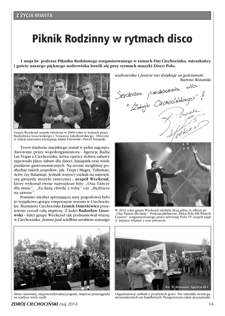 Z ˚YCIA MIASTA Piknik Rodzinny w rytmach disco 1 maja br. podczas Pikniku Rodzinnego zorganizowanego w ramach Dni Ciechocinka, mieszkaƒcy i goÊcie naszego pi´knego uzdrowiska bawili si´ przy rytmach muzyki Disco Polo. uzdrowiska i jeszcze raz dzi´kuj´ za goÊcinnoÊç. Bartosz Ró˝aƒski Grupa Weekend zosta∏a za∏o˝ona w 2000 roku w Sejnach przez Rados∏awa Liszewskiego i Tomasza Jakubowskiego. Obecnie w sekcji tanecznej wyst´pujà Adam ¸azowski i Pawe∏ Nitupski. Teren stadionu miejskiego zosta∏ w pe∏ni zagospodarowany przez wspó∏organizatora - Agencj´ Radia Las Vegas z Ciechocinka, która oprócz dobrej zabawy zapewni∏a place zabaw dla dzieci, lunapark oraz wiele punktów gastronomicznych. Na scenie mogliÊmy pos∏uchaç takich zespo∏ów, jak: Terpi i Magra, Talizman, Acive czy Balantajs. Jednak wszyscy czekali na najwi´kszà gwiazd´ muzyki tanecznej - zespó∏ Weekend, który wykona∏ swoje najwi´ksze hity: „Ona Taƒczy dla mnie’’, ,,Za ka˝à chwil´ z tobà’’ czy ,,B´dziesz na zawsze’’. Pomimo niezbyt sprzyjajàcej aury pogodowej by∏o to wyjàtkowo goràce rozpocz´cie sezonu w Ciechocinku. Burmistrz Ciechocinka Leszek Dzier˝ewicz pozytywnie oceni∏ ca∏à imprez´. Z kolei Rados∏aw Liszewski - lider grupy Weekend tak podsumowa∏ wizyt´ w Ciechocinku: Jestem pod wielkim urokiem waszego W 2012 roku grupa Weekend zdoby∏a z∏otà p∏yt´ za album pt: ,,Ona Taƒczy dla mnie’’. Podczas plebiscytu „Disco Polo Hit Wszech Czasów” zorganizowanego przez telewizj´ Polo TV zespó∏ zajà∏ 2. miejsce w∏aÊnie z tym utworem. fot. B. Ró˝aƒski, Agencja RLV Mimo zmiennej, nieprzewidywalnej pogody, impreza przyciàgn´∏a na stadion wiele osób. ZDRÓJ CIECHOCI¡SKI maj 2014 Organizatorzy zadbali o przyby∏ych goÊci. Nie zabrak∏o stoisk gastronomicznych czy handlowych. Przygotowano tak˝e pocz´stunki. 14
