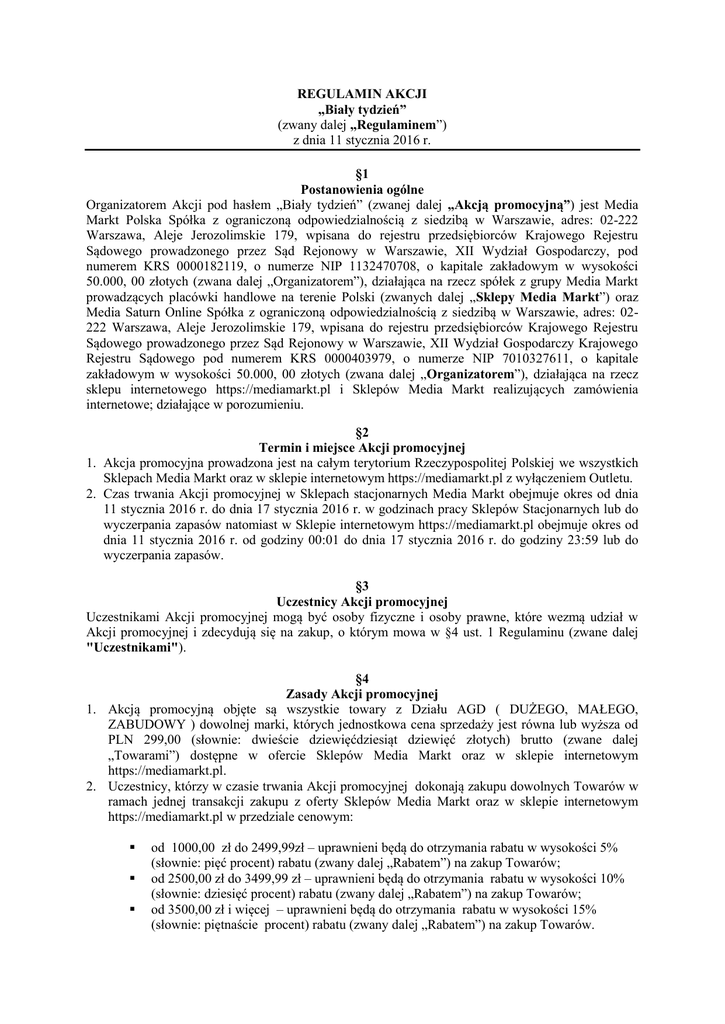 REGULAMIN AKCJI „Biały tydzień” (zwany dalej „Regulaminem”) z dnia 11 stycznia 2016 r. §1 Postanowienia ogólne Organizatorem Akcji pod hasłem „Biały tydzień” (zwanej dalej „Akcją promocyjną”) jest Media Markt Polska Spółka z ograniczoną odpowiedzialnością z siedzibą w Warszawie, adres: 02-222 Warszawa, Aleje Jerozolimskie 179, wpisana do rejestru przedsiębiorców Krajowego Rejestru Sądowego prowadzonego przez Sąd Rejonowy w Warszawie, XII Wydział Gospodarczy, pod numerem KRS 0000182119, o numerze NIP 1132470708, o kapitale zakładowym w wysokości 50.000, 00 złotych (zwana dalej „Organizatorem”), działająca na rzecz spółek z grupy Media Markt prowadzących placówki handlowe na terenie Polski (zwanych dalej „Sklepy Media Markt”) oraz Media Saturn Online Spółka z ograniczoną odpowiedzialnością z siedzibą w Warszawie, adres: 02222 Warszawa, Aleje Jerozolimskie 179, wpisana do rejestru przedsiębiorców Krajowego Rejestru Sądowego prowadzonego przez Sąd Rejonowy w Warszawie, XII Wydział Gospodarczy Krajowego Rejestru Sądowego pod numerem KRS 0000403979, o numerze NIP 7010327611, o kapitale zakładowym w wysokości 50.000, 00 złotych (zwana dalej „Organizatorem”), działająca na rzecz sklepu internetowego https://mediamarkt.pl i Sklepów Media Markt realizujących zamówienia internetowe; działające w porozumieniu. §2 Termin i miejsce Akcji promocyjnej 1. Akcja promocyjna prowadzona jest na całym terytorium Rzeczypospolitej Polskiej we wszystkich Sklepach Media Markt oraz w sklepie internetowym https://mediamarkt.pl z wyłączeniem Outletu. 2. Czas trwania Akcji promocyjnej w Sklepach stacjonarnych Media Markt obejmuje okres od dnia 11 stycznia 2016 r. do dnia 17 stycznia 2016 r. w godzinach pracy Sklepów Stacjonarnych lub do wyczerpania zapasów natomiast w Sklepie internetowym https://mediamarkt.pl obejmuje okres od dnia 11 stycznia 2016 r. od godziny 00:01 do dnia 17 stycznia 2016 r. do godziny 23:59 lub do wyczerpania zapasów. §3 Uczestnicy Akcji promocyjnej Uczestnikami Akcji promocyjnej mogą być osoby fizyczne i osoby prawne, które wezmą udział w Akcji promocyjnej i zdecydują się na zakup, o którym mowa w §4 ust. 1 Regulaminu (zwane dalej "Uczestnikami"). §4 Zasady Akcji promocyjnej 1. Akcją promocyjną objęte są wszystkie towary z Działu AGD ( DUŻEGO, MAŁEGO, ZABUDOWY ) dowolnej marki, których jednostkowa cena sprzedaży jest równa lub wyższa od PLN 299,00 (słownie: dwieście dziewięćdziesiąt dziewięć złotych) brutto (zwane dalej „Towarami”) dostępne w ofercie Sklepów Media Markt oraz w sklepie internetowym https://mediamarkt.pl. 2. Uczestnicy, którzy w czasie trwania Akcji promocyjnej dokonają zakupu dowolnych Towarów w ramach jednej transakcji zakupu z oferty Sklepów Media Markt oraz w sklepie internetowym https://mediamarkt.pl w przedziale cenowym: od 1000,00 zł do 2499,99zł – uprawnieni będą do otrzymania rabatu w wysokości 5% (słownie: pięć procent) rabatu (zwany dalej „Rabatem”) na zakup Towarów; od 2500,00 zł do 3499,99 zł – uprawnieni będą do otrzymania rabatu w wysokości 10% (słownie: dziesięć procent) rabatu (zwany dalej „Rabatem”) na zakup Towarów; od 3500,00 zł i więcej – uprawnieni będą do otrzymania rabatu w wysokości 15% (słownie: piętnaście procent) rabatu (zwany dalej „Rabatem”) na zakup Towarów. 3. Organizator zastrzega, że Akcją promocyjną nie są objęte usługi kwalifikowane i niekwalifikowane (np.: Gwarancja Plus, Power Service, dostawa itp.) oraz produkty z Outletu. 4. Uczestnikom nie przysługuje prawo do zastrzeżenia szczególnych cech Towarów objętych Akcją promocyjną. 5. Uczestnikom Akcji promocyjnej nie przysługuje prawo do otrzymania ekwiwalentu pieniężnego w wysokości udzielanego Rabatu. 6. Uczestnik dokona odbioru Towaru zakupionego zgodnie z ust. 2 w dniu sprzedaży lub w późniejszym terminie w wypadku uzgodnienia późniejszego terminu odbioru, jednakże nie dłuższego niż 30 dni od daty sprzedaży. W wypadku bezskutecznego upływu uzgodnionego terminu odbioru Towaru, Sklep Media Markt może pobierać opłatę za magazynowanie Towaru według obowiązujących na danym rynku stawek. 7. W przypadku sklepu internetowego https://mediamarkt.pl Rabat jest jednorazowy tzn. że przysługuje wyłącznie jeden (1) raz i jedynie w czasie trwania Akcji promocyjnej oraz Rabat nie może być przyznany na zakup produktów po zakończeniu Akcji promocyjnej. O zakupie w promocyjnej cenie w sklepie internetowym https://mediamarkt.pl decyduje data złożenia zamówienia. 8. W przypadku Sklepów Stacjonarnych Uczestnik może brać udział w Akcji promocyjnej wielokrotnie, pod warunkiem każdorazowego spełnienia warunków przewidzianych w Regulaminie. 9. Akcja promocyjna nie może być łączona z innymi Akcjami promocyjnymi, w tym kodami rabatowymi otrzymanymi w ramach programu Konto Premium. 1. 2. 1. 2. 3. 4. 5. §5 Odpowiedzialność Odpowiedzialność Organizatora wobec Uczestnika z tytułu roszczeń związanych z uprawnieniami przyznanymi Uczestnikowi w Regulaminie ograniczona jest do wysokości jednostkowej ceny Towaru z rabatem w trakcie Akcji promocyjnej, którego to roszczenie dotyczy. Powyższe ograniczenie nie wyłącza uprawnień przyznanych Uczestnikom na mocy przepisów prawnych. §6 Reklamacje i wymiana Towarów Reklamacje dotyczące sposobu przeprowadzenia Akcji promocyjnej powinny być zgłaszane w trakcie trwania Akcji promocyjnej oraz przez 21 (dwadzieścia jeden) dni od jej zakończenia w Sklepie Media Markt, w którym Uczestnik dokonał zakupu Towaru, pod adresem e-mail: [email protected] z tematem wiadomości „Reklamacja - Biały tydzień” lub pod numerem Infolinii 799 35 35 35 * (* opłata zgodnie z taryfą operatora), czynna w dni powszednie w godzinach 9:00 - 21:00. Reklamacje składane w formie pisemnej w Sklepie Media Markt, w którym dokonano zakupu Towaru z rabatem powinny za
