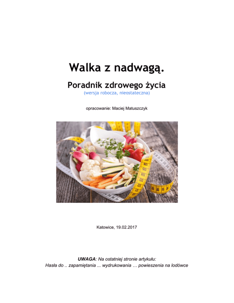 Walka z nadwagą. Poradnik zdrowego życia (wersja robocza, nieostateczna) opracowanie: Maciej Matuszczyk Katowice, 19.02.2017 UWAGA: Na ostatniej stronie artykułu: Hasła do .. zapamiętania ... wydrukowania … powieszenia na lodówce Rozdział 0. O Czym jest ten poradnik? Wstęp ogólny Skoro czytasz ten tekst oznacza, że masz problem z utrzymaniem prawidłowej masy ciała. I to nie od paru dni, raczej od miesięcy lub lat. Najważniejsze pytanie jest takie: Czy na pewno chcesz COŚ z tym zrobić? Tak? Super! Ale pamiętaj: nie ma na to prostego i szybkiego sposobu, żadnej cudownej pigułki, diety czy urządzenia. I co czytasz dalej? Jeśli chcesz faktycznie coś zmienić musisz przyjąć do wiadomości 2 fakty: 1. Nie ma powrotu do przeszłości Czyli do schematu funkcjonowania, w którym dominowało zjadanie zbyt wielu kalorii i zbyt małe ich spalanie poprzez niewielką aktywność fizyczną. Ta zmiana musi być trwała, tj. do końca życia, inaczej będzie JOJO. 2. Ta zmiana może być fajna Mniej słodyczy, pieczywa, kolorowych napojów i więcej ruchu to może być sposób na życie. Wiele osób, którym się udało, nie wyobraża sobie potem innego modelu. Choć na początku, ta zmiana na pewno będzie trudna dla Ciebie drogi czytelniku, ale też dla ludzi z Twojego otoczenia. W poradniku opisuję metody, które pomogą Ci w walce z nadwagą. Ważne, aby zrozumieć, że do celu nie prowadzi jedna droga (dieta cud, pigułka, zestaw ćwiczeń), ale cały zespół działań, które z jednej strony obniżą bilans energetyczny, z drugiej utrzymają wysoki poziom motywacji do zmiany. Ale uwaga! Zanim zaczniesz, idź do swojego lekarza rodzinnego, aby sprawdzić, czy poza otyłością nie chorujesz na poważną chorobę. Na pewno warto wykonać panel podstawowych badań laboratoryjnych. Pamiętaj! Nie jesteś sam/a. Pomogą Ci dietetycy, lekarze, psycholodzy, trenerzy czy psycholodzy. Ale też - inne osoby starające się zrzucić wagę. Wystarczy się rozejrzeć. Na pewno znajdziesz podobnych do siebie. Ludzi, którzy korzystają z pomocy dietetyka, chodzą z kijami czy na zajęcia fitnessowe. Ale jak Ci się nic nie chce i widzisz tylko czarną przyszłość, pamiętaj są spece od “psyche” - Oni wiedzą jak poprawić nastrój. Maciej Matuszczyk: Walka z nadwagą. Poradnik zdrowego życia 2 Wstęp trochę osobisty W tym opracowaniu chciałbym podzielić się swoimi spostrzeżeniami z własnego odchudzania, a teraz z procesu utrzymania optymalnej masy ciała. Do swoich wniosków dochodziłem początkowo metodą eksperymentu, a potem zacząłem weryfikować te doświadczenia w książkach, czasopismach oraz podczas szkoleń. Celem tego poradnika jest przekazanie mojej wiedzy na temat zdrowego stylu życia. Jego adresatami są moi pacjenci, ale także znajomi i rodzina, bo ciągle otrzymuję pytania jak mi się udało schudnąć i utrzymać niższą masę ciała. Chcę pokazać, że odchudzanie, a szerzej zdrowy tryb życia (pierwszego nie ma bez drugiego), to nie może być epizod, po zakończeniu którego człowiek wraca do starych zwyczajów. Równie ważna jest świadomość, że do celu nie da się dojść tylko jedną metodą, tj. tylko dietą, albo wysiłkiem fizycznym, czy cudowną pigułką. Ten proces jest efektywny, jeśli zmiana dotyczy wielu obszarów życia. Czyli jemy mniej i to tych zdrowszych kalorii. Robimy to w odpowiednich odstępach czasu. Dodajemy, ile się da, wysiłku fizycznego (np. schody, a nie winda; do pobliskiego sklepu piechotą, a nie autem itp.), zmieniamy przyzwyczajenia, np. podczas oglądania TV, nie chipsy, ale ścinki marchewki, ogórka czy papryki i nie na kanapie, tylko na rowerku treningowym. Przesadzam? Ale czemu nie? Wyrzucamy z zasięgu wzroku i rąk wszelkie przekąski, bo one kuszą, a po co testować siłę woli. Szukając informacji dotyczących odchudzania, trafiłem na książki pisane przez byłych kulturystów, a obecnie trenerów personalnych. Autorzy ci zmienili moje myślenie nt. odchudzania. I faktycznie, kulturyści to specjaliści od najbardziej efektywnej redukcji tkanki tłuszczowej i budowy mięśni w jak najkrótszym czasie. W tym momencie część grubasów zapewne powie, przecież ja nie chcę wyglądać jak Arnold. Oczywiście, nie o to chodzi. Inna rzecz, że on stosował koks. Myślę tu o tzw. kulturystach naturalnych, czyli nieużywających niezdrowych wspomagaczy wzrostu masy mięśniowej. Najciekawsze moim zdaniem źródła podaję na końcu tekstu. Polecam też poradniki na youtube, np. “kulturystyki100pro”. Ten poradnik ma pełnić też motywacyjną rolę dla mnie samego. Zakładam ciągłą pracę nad jego udoskonalaniem, a dzięki temu będę sobie przypominać, co trzeba robić, aby nie wpaść w jojo. To jest bardzo ważne, bo zawsze po okresach motywacji i podejmowania wysiłku, przychodzi chwila "zapomnienia". Mnie wtedy zdarza się postępować wbrew własnym zaleceniom. Albo pozwalam sobie na zbytnie obżarstwo, albo odpuszczam na jakiś czas dni treningi. Ważne jest to, aby takie "przerwy" trwały jak najkrócej. Bo jeśli dłużej, to może to zniweczyć wszelkie wcześniejsze wysiłki. Trzeba pamiętać, że powrót do formy sprzed tej "przerwy", może zająć 2-3 x więcej czasu niż trwał okres “przyjemności”. Z góry dziękuję za wszelkie uwagi do mojego opracowania. Proszę także o propozycje tematów, które powinienem omówić. Mój adres to [email protected]. Tyle wstępu. Teraz chciałbym zdefiniować pojęcia nadwagi i otyłości, wskazać na ich przyczyny oraz skutki za dużej masy ciała dla zdrowia. Maciej Matuszczyk: Walka z nadwagą. Poradnik zdrowego życia 3 Rozdział 1. Czym jest nadwaga? Nadwaga to masa ciała większa niż norma. Czym w takim razie jest norma? Jest kilka umownie przyjętych zakresów normy. Tu chciałbym się skupić na 2 najbardziej popularnych: BMI i obwód w talii. Są łatwe do oceny, a wartości poszczególnych przedziałów są związane ze
