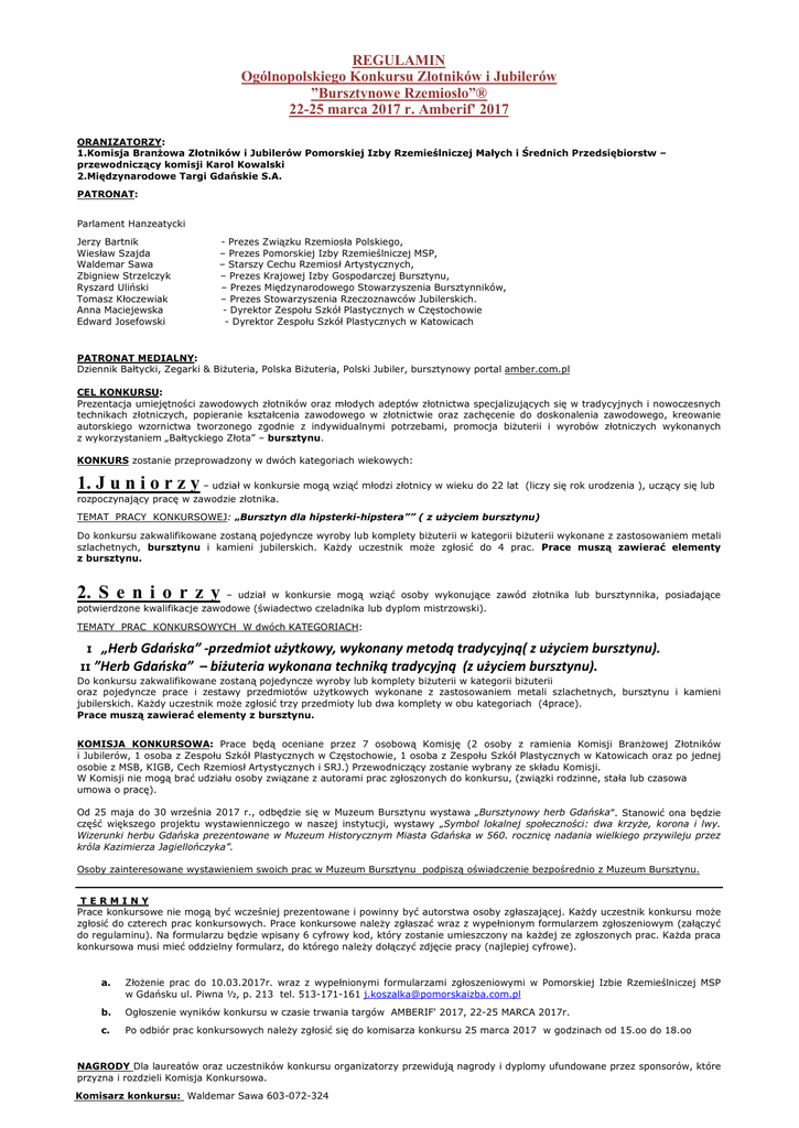 REGULAMIN Ogólnopolskiego Konkursu Złotników i Jubilerów ”Bursztynowe Rzemiosło”® 22-25 marca 2017 r. Amberif' 2017 ORANIZATORZY: 1.Komisja Branżowa Złotników i Jubilerów Pomorskiej Izby Rzemieślniczej Małych i Średnich Przedsiębiorstw – przewodniczący komisji Karol Kowalski 2.Międzynarodowe Targi Gdańskie S.A. PATRONAT: Parlament Hanzeatycki Jerzy Bartnik Wiesław Szajda Waldemar Sawa Zbigniew Strzelczyk Ryszard Uliński Tomasz Kłoczewiak Anna Maciejewska Edward Josefowski - Prezes Związku Rzemiosła Polskiego, – Prezes Pomorskiej Izby Rzemieślniczej MSP, – Starszy Cechu Rzemiosł Artystycznych, – Prezes Krajowej Izby Gospodarczej Bursztynu, – Prezes Międzynarodowego Stowarzyszenia Bursztynników, – Prezes Stowarzyszenia Rzeczoznawców Jubilerskich. - Dyrektor Zespołu Szkół Plastycznych w Częstochowie - Dyrektor Zespołu Szkół Plastycznych w Katowicach PATRONAT MEDIALNY: Dziennik Bałtycki, Zegarki & Biżuteria, Polska Biżuteria, Polski Jubiler, bursztynowy portal amber.com.pl CEL KONKURSU: Prezentacja umiejętności zawodowych złotników oraz młodych adeptów złotnictwa specjalizujących się w tradycyjnych i nowoczesnych technikach złotniczych, popieranie kształcenia zawodowego w złotnictwie oraz zachęcenie do doskonalenia zawodowego, kreowanie autorskiego wzornictwa tworzonego zgodnie z indywidualnymi potrzebami, promocja biżuterii i wyrobów złotniczych wykonanych z wykorzystaniem „Bałtyckiego Złota” – bursztynu. KONKURS zostanie przeprowadzony w dwóch kategoriach wiekowych: 1. J u n i o r z y – udział w konkursie mogą wziąć młodzi złotnicy w wieku do 22 lat (liczy się rok urodzenia ), uczący się lub rozpoczynający pracę w zawodzie złotnika. TEMAT PRACY KONKURSOWEJ: „Bursztyn dla hipsterki-hipstera”” ( z użyciem bursztynu) Do konkursu zakwalifikowane zostaną pojedyncze wyroby lub komplety biżuterii w kategorii biżuterii wykonane z zastosowaniem metali szlachetnych, bursztynu i kamieni jubilerskich. Każdy uczestnik może zgłosić do 4 prac. Prace muszą zawierać elementy z bursztynu. 2. S e n i o r z y – udział w konkursie mogą wziąć osoby wykonujące zawód złotnika lub bursztynnika, posiadające potwierdzone kwalifikacje zawodowe (świadectwo czeladnika lub dyplom mistrzowski). TEMATY PRAC KONKURSOWYCH W dwóch KATEGORIACH: „Herb Gdańska” -przedmiot użytkowy, wykonany metodą tradycyjną( z użyciem bursztynu). II ”Herb Gdańska” – biżuteria wykonana techniką tradycyjną (z użyciem bursztynu). I Do konkursu zakwalifikowane zostaną pojedyncze wyroby lub komplety biżuterii w kategorii biżuterii oraz pojedyncze prace i zestawy przedmiotów użytkowych wykonane z zastosowaniem metali szlachetnych, bursztynu i kamieni jubilerskich. Każdy uczestnik może zgłosić trzy przedmioty lub dwa komplety w obu kategoriach (4prace). Prace muszą zawierać elementy z bursztynu. KOMISJA KONKURSOWA: Prace będą oceniane przez 7 osobową Komisję (2 osoby z ramienia Komisji Branżowej Złotników i Jubilerów, 1 osoba z Zespołu Szkół Plastycznych w Częstochowie, 1 osoba z Zespołu Szkół Plastycznych w Katowicach oraz po jednej osobie z MSB, KIGB, Cech Rzemiosł Artystycznych i SRJ.) Przewodniczący zostanie wybrany ze składu Komisji. W Komisji nie mogą brać udziału osoby związane z autorami prac zgłoszonych do konkursu, (związki rodzinne, stała lub czasowa umowa o pracę). Od 25 maja do 30 września 2017 r., odbędzie się w Muzeum Bursztynu wystawa „Bursztynowy herb Gdańska”. Stanowić ona będzie część większego projektu wystawienniczego w naszej instytucji, wystawy „Symbol lokalnej społeczności: dwa krzyże, korona i lwy. Wizerunki herbu Gdańska prezentowane w Muzeum Historycznym Miasta Gdańska w 560. rocznicę nadania wielkiego przywileju przez króla Kazimierza Jagiellończyka”. Osoby zainteresowane wystawieniem swoich prac w Muzeum Bursztynu podpiszą oświadczenie bezpośrednio z Muzeum Bursztynu. TERMINY Prace konkursowe nie mogą być wcześniej prezentowane i powinny być autorstwa osoby zgłaszającej. Każdy uczestnik konkursu może zgłosić do czterech prac konkursowych. Prace konkursowe należy zgłaszać wraz z wypełnionym formularzem zgłoszeniowym (załączyć do regulaminu). Na formularzu będzie wpisany 6 cyfrowy kod, który zostanie umieszczony na każdej ze zgłoszonych prac. Każda praca konkursowa musi mieć oddzielny formularz, do którego należy dołączyć zdjęcie pracy (najlepiej cyfrowe). a. Złożenie prac do 10.03.2017r. wraz z wypełnionymi formularzami zgłoszeniowymi w Pomorskiej Izbie Rzemieślniczej MSP w Gdańsku ul. Piwna ½, p. 213 tel. 513-171-161 [email protected] b. Ogłoszenie wyników konkursu w czasie trwania targów AMBERIF' 2017, 22-25 MARCA 2017r. c. Po odbiór prac konkursowych należy zgłosić się do komisarza konkursu 25 marca 2017 w godzinach od 15.oo do 18.oo NAGRODY Dla laureatów oraz uczestników konkursu organizatorzy przewidują nagrody i dyplomy ufundowane przez sponsorów, które przyzna i rozdzieli Komisja Konkursowa. Komisarz konkursu: Waldemar Sawa 603-072-324