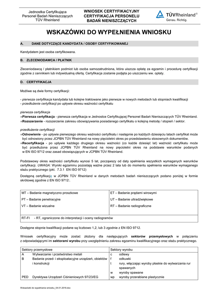 Jednostka Certyfikująca Personel Badań Nieniszczących TÜV Rheinland WNIOSEK CERTYFIKACYJNY CERTYFIKACJA PERSONELU BADAŃ NIENISZCZĄCYCH WSKAZÓWKI DO WYPEŁNIENIA WNIOSKU A. DANE DOTYCZĄCE KANDYDATA / OSOBY CERTYFIKOWANEJ Kandydatem jest osoba certyfikowana. B. ZLECENIODAWCA / PŁATNIK Zleceniodawcą / płatnikiem podmiot lub osoba samozatrudniona, która uiszcza opłatę za egzamin i procedurę certyfikacji zgodnie z cennikiem lub indywidualną ofertą. Certyfikacja zostanie podjęta po uiszczeniu ww. opłaty. D. CERTYFIKACJA Możliwe są dwie formy certyfikacji: - pierwsza certyfikacja kandydata lub kolejne traktowane jako pierwsze w nowych metodach lub stopniach kwalifikacji - przedłużenie certyfikacji po upływie okresu ważności certyfikatu pierwsza certyfikacja • Pierwsza certyfikacja - pierwsza certyfikacja w Jednostce Certyfikującej Personel Badań Nieniszczących TÜV Rheinland. • Rozszerzenie - rozszerzenie zakresu obowiązywania posiadanego certyfikatu o kolejną metodę / stopień / sektor. przedłużenie certyfikacji • Odnowienie - po upływie pierwszego okresu ważności certyfikatu i następnie po każdych dziesięciu latach certyfikat może być odnowiony przez JCPBN TÜV Rheinland na nowy pięcioletni okres po przedstawieniu stosownych dokumentów. • Recertyfikacja - po upływie każdego drugiego okresu ważności (co każde dziesięć lat) ważność certyfikatu może być przedłużona przez JCPBN TÜV Rheinland na nowy pięcioletni okres na podstawie warunków podanych w EN ISO 9712 oraz zasad obowiązujących w JCPBN TÜV Rheinland. Podstawowy okres ważności certyfikatu wynosi 5 lat, począwszy od daty spełnienia wszystkich wymaganych warunków certyfikacji. UWAGA: Wyniki egzaminu pozostają ważne przez 2 lata lub do momentu spełnienia warunków wymaganego stażu praktycznego (pkt. 7.3.1 EN ISO 9712) Dostępną certyfikację w JCPBN TÜV Rheinland w danych metodach badań nieniszczących podano poniżej w formie skrótowej zgodnie z EN ISO 9712:. MT – Badanie magnetyczno proszkowe ET – Badanie prądami wirowymi PT – Badanie penetracyjne UT – Badanie ultradźwiękowe VT – Badanie wizualne RT – Badanie radiograficzne RT-FI - RT, ograniczone do interpretacji i oceny radiogramów Dostępne stopnie kwalifikacji podane są liczbowo 1,2, lub 3 zgodnie z EN ISO 9712. Wniosek certyfikacyjny może zostać złożony dla następujących sektorów przemysłowych w połączeniu z odpowiadającymi im sektorami wyrobu przy uwzględnieniu zakresu egzaminu kwalifikacyjnego oraz stażu praktycznego. Sektory przemysłowe A Wytwarzanie i przetwórstwo metali B Badanie przed- i eksploatacyjne urządzeń, obiektów i konstrukcji PED Dyrektywa Urządzeń Ciśnieniowych 97/23/EG Wskazówki do wypełniania wniosku_04.01.2016.doc Sektory wyrobu c odlewy f odkuwki t rury, włączając wyroby płaskie do wytwarzania rur spawanych w wyroby spawane wp wyroby przerabiane plastycznie KOSZTY Cena egzaminu zawiera przeprowadzenie procesu certyfikacji oraz wystawianie certyfikatu. Cena procedury odnowienia podana jest w cenniku dostępnym na .www.akademia.tuv.pl w zakładce certyfikacja. POTWIERDZENIE STAŻU PRAKTYCZNEGO / DOŚWIADCZENIA W BADANIACH / CIĄGŁOŚCI W BADANIACH Pierwsza certyfikacja W tablicy podano wymagania podstawowe dla stażu praktycznego w NDT w miesiącach. Metoda MT, PT, VT RT, UT, ET RT-FI Stopień 1. Stopień 2. 1 3 - 3 9 6 Stopień 2. bezpośrednio 4 12 - Stopień 3. *) 12 18 - *) Stopień 3 - podane czasy odnoszą się do kandydata który ma wykształcenie techniczne lub zaliczył min. 2 lata studiów inżynierskich lub z zakresu nauk ścisłych lub przyrodniczych. Jeżeli kandydat nie spełnia ww. wymagań wykształcenia, podaną liczbę miesięcy mnoży się przez 2 ( zgodnie z pkt. 7.3.2 EN ISO 9712) - wymagana liczba miesięcy stażu praktycznego dla kandydata na 3 stopień dotyczy stażu, jaki zgromadził posiadając certyfikat 2 stopnia. Jeżeli kandydat ma być certyfikowany bezpośrednio na 3 stopień (bez posiadania certyfikatu 2 stopnia) wymagana liczba miesięcy składa się z sumy dla 2 i 3 stopnia. W tym przypadku nie obowiązują żadne redukcje wymaganego stażu praktycznego. Staż praktyczny przed egzaminem – dotyczy każdego stopnia kwalifikacji Jednostka certyfikująca TÜV Rheinland zgodnie z pkt. 7.3.1 EN ISO 9712 zdefiniowała minimalny czas stażu praktycznego wymaganego przed egzaminem kwalifikacyjnym. W tablicy podano minimalne wymagania stażu praktycznego przed egzaminem. Metoda VT, MT, PT RT, UT RT-FI Stopień 1. Stopień 2. 5 dni 10 dni - 10 dni 20 dni - Stopień 2. bezpośrednio 15 dni 30 dni 15 dni Stopień 3. Stopień 3. bezpośrednio Certyfikat 2 stopnia Certyfikat 2 stopnia 2 miesiące doświadczenia w stopniu 2 3 miesiące doświadczenia w stopniu 2 Rzeczywista część sumarycznego czasu stażu praktycznego uzyskana przed egzaminem, spełniająca powyższe minimalne wymagania, musi być podana w załączniku nr 1 wniosku o certyfikat. Przez staż praktyczny dla kandydatów do pierwszej certyfikacji w danej metodzie i stopniu rozumie się: - pomoc w wykonywaniu badań (praca pod nadzorem), - praca w grupie projektowej gdzie przygotowuje się i wykonuje czynności NDT, - praca z dokumentacją NDT, instrukcjami, normami, - zaznajomienie się z obsługą techniczną sprzętu i środków NDT; w przypadku kandydatów na 2 stopień posiadających certyfikat 1 stopnia: - wykonywanie badań oraz innych czynności, do których jest dopuszczony personel 1 stopnia; W przypadku kandydatów na 3 stopień posiadających certyfikat 2 stopnia: - wykonywanie badań oraz innych czynności, do których jest dopuszczony personel 2 stopnia; Przedłużenie certyfikacji Przy odnowieniu certyfikatu oraz w przypadku recertyfikacji musi zostać potwierdzona ciągłość praktyki w danej metodzie i stopniu NDT. Za ciągłość praktyki NDT uważa się wykonywanie badań w danej metodzie stopniu i sektorze bez istotnych przerw w prze