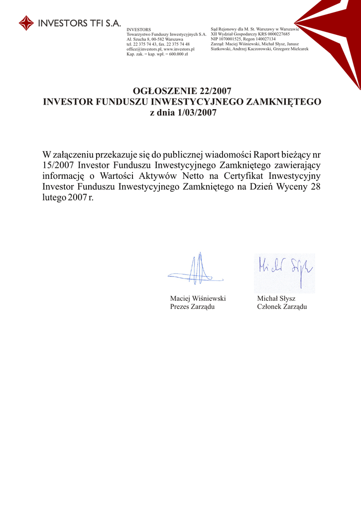 INVESTORS Towarzystwo Funduszy Inwestycyjnych S.A. Al. Szucha 8, 00-582 Warszawa tel. 22 375 74 43, fax. 22 375 74 48 [email protected], www.investors.pl Kap. zak. = kap. wp³. = 600.000 z³ S¹d Rejonowy dla M. St. Warszawy w Warszawie XII Wydzia³ Gospodarczy KRS 0000227685 NIP 1070001525, Regon 140027134 Zarz¹d: Maciej Wiœniewski, Micha³ S³ysz, Janusz Siatkowski, Andrzej Kaczorowski, Grzegorz Mielcarek OG£OSZENIE 22/2007 INVESTOR FUNDUSZU INWESTYCYJNEGO ZAMKNIÊTEGO z dnia 1/03/2007 W za³¹czeniu przekazuje siê do publicznej wiadomoœci Raport bie¿¹cy nr 15/2007 Investor Funduszu Inwestycyjnego Zamkniêtego zawieraj¹cy informacjê o Wartoœci Aktywów Netto na Certyfikat Inwestycyjny Investor Funduszu Inwestycyjnego Zamkniêtego na Dzieñ Wyceny 28 lutego 2007 r. Maciej Wiœniewski Prezes Zarz¹du Micha³ S³ysz Cz³onek Zarz¹du INVESTOR FIZ WANCI-E_3_07_06 korekta KOMISJA NADZORU FINANSOWEGO Raport bieżący nr 15 / 2007 (kolejny numer raportu / rok) Temat raportu: Informacja o wycenie wartości aktywów netto funduszu przypadającej na certyfikat inwestycyjny Podstawa prawna: § 43 ust. 1 pkt 9 Rozporządzenia Ministra Finansów z dnia 19 października 2005 r. w sprawie informacji bieżących i okresowych przekazywanych przez emitentów papierów wartościowych (Dz. U. z 2005 r. Nr 209 Poz. 1744) Data przekazania: 2007-03-01 INVESTOR FUNDUSZ INWESTYCYJNY ZAMKNIĘTY (pełna nazwa funduszu) INVESTOR FIZ Investors TFI S.A. (skróc ona nazwa funduszu) (nazwa towarzystwa) 00-582 Warszawa (kod pocztowy) (miejsc owość ) SZUCHA 8 (ulica) ( numer) 375 74 47 375 74 48 (telefon) [email protected] (fax) 1070002766 (e-mail) 140242602 (NIP) www.investors.pl (REGON) (WWW) KOREKTA RAPORTU: Plik Opis TREŚĆ RAPORTU: Określenie waluty Pozycja danych Data wyceny Wartość aktywów netto PLN bieżąca 2007-02-28 215 491 046,30 poprzednia 2007-01-31 203 101 124,23 Komisja Nadzoru Finansowego 1 INVESTOR FIZ WANCI-E_3_07_06 Wartość aktywów netto funduszu przypadająca na certyfikat inwestycyjny 2 150,24 2 026,51 PODPISY OSÓB REPREZENTUJĄCYCH PODMIOT Data Imię i Nazwisko Stanowisko / Funkcja 2007-03-01 Maciej Wiśniewski Prezes Zarządu 2007-03-01 Mic hał Słysz Członek Zarządu Podpis Komisja Nadzoru Finansowego 2