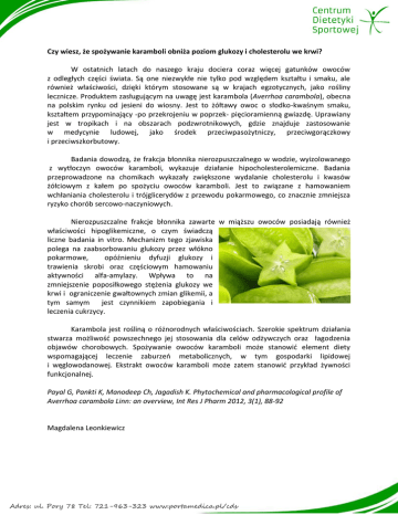 Czy wiesz, że spożywanie karamboli obniża poziom glukozy i cholesterolu we krwi? W ostatnich latach do naszego kraju dociera coraz więcej gatunków owoców z odległych części świata. Są one niezwykłe nie tylko pod względem kształtu i smaku, ale również właściwości, dzięki którym stosowane są w krajach egzotycznych, jako rośliny lecznicze. Produktem zasługującym na uwagę jest karambola (Averrhoa carambola), obecna na polskim rynku od jesieni do wiosny. Jest to żółtawy owoc o słodko-kwaśnym smaku, kształtem przypominający -po przekrojeniu w poprzek- pięcioramienną gwiazdę. Uprawiany jest w tropikach i na obszarach podzwrotnikowych, gdzie znajduje zastosowanie w medycynie ludowej, jako środek przeciwpasożytniczy, przeciwgorączkowy i przeciwszkorbutowy. Badania dowodzą, że frakcja błonnika nierozpuszczalnego w wodzie, wyizolowanego z wytłoczyn owoców karamboli, wykazuje działanie hipocholesterolemiczne. Badania przeprowadzone na chomikach wykazały zwiększone wydalanie cholesterolu i kwasów żółciowym z kałem po spożyciu owoców karamboli. Jest to związane z hamowaniem wchłaniania cholesterolu i trójglicerydów z przewodu pokarmowego, co znacznie zmniejsza ryzyko chorób sercowo-naczyniowych. Nierozpuszczalne frakcje błonnika zawarte w miąższu owoców posiadają również właściwości hipoglikemiczne, o czym świadczą liczne badania in vitro. Mechanizm tego zjawiska polega na zaabsorbowaniu glukozy przez włókno pokarmowe, opóźnieniu dyfuzji glukozy i trawienia skrobi oraz częściowym hamowaniu aktywności alfa-amylazy. Wpływa to na zmniejszenie poposiłkowego stężenia glukozy we krwi i ograniczenie gwałtownych zmian glikemii, a tym samym jest czynnikiem zapobiegania i leczenia cukrzycy. Karambola jest rośliną o różnorodnych właściwościach. Szerokie spektrum działania stwarza możliwość powszechnego jej stosowania dla celów odżywczych oraz łagodzenia objawów chorobowych. Spożywanie owoców karamboli może stanowić element diety wspomagającej leczenie zaburzeń metabolicznych, w tym gospodarki lipidowej i węglowodanowej. Ekstrakt owoców karamboli może zatem stanowić przykład żywności funkcjonalnej. Payal G, Pankti K, Manodeep Ch, Jagadish K. Phytochemical and pharmacological profile of Averrhoa carambola Linn: an overview, Int Res J Pharm 2012, 3(1), 88-92 Magdalena Leonkiewicz Adres: ul. Pory 78 Tel: 721-963-323 www.portamedica.pl/cds