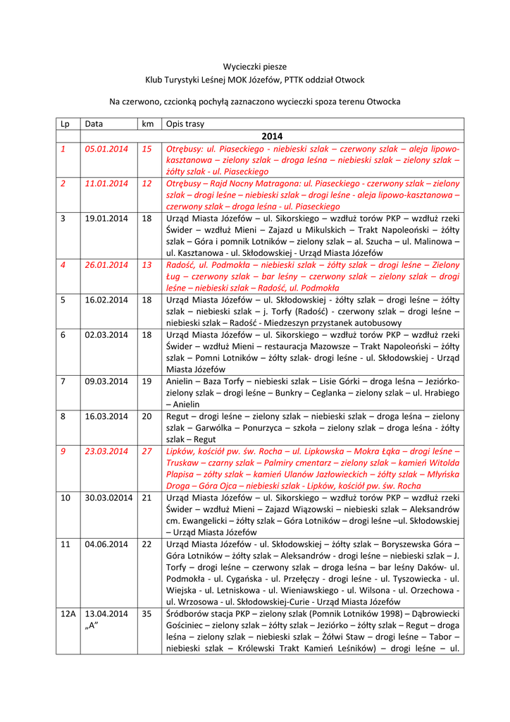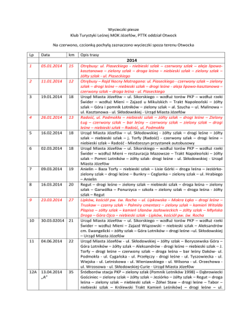 Wycieczki piesze Klub Turystyki Leśnej MOK Józefów, PTTK oddział Otwock Na czerwono, czcionką pochyłą zaznaczono wycieczki spoza terenu Otwocka Lp Data km Opis trasy 2014 1 05.01.2014 15 2 11.01.2014 12 3 19.01.2014 18 4 26.01.2014 13 5 16.02.2014 18 6 02.03.2014 18 7 09.03.2014 19 8 16.03.2014 20 9 23.03.2014 27 10 30.03.02014 21 11 04.06.2014 22 12A 13.04.2014 „A” 35 Otrębusy: ul. Piaseckiego - niebieski szlak – czerwony szlak – aleja lipowokasztanowa – zielony szlak – droga leśna – niebieski szlak – zielony szlak – żółty szlak - ul. Piaseckiego Otrębusy – Rajd Nocny Matragona: ul. Piaseckiego - czerwony szlak – zielony szlak – drogi leśne – niebieski szlak – drogi leśne - aleja lipowo-kasztanowa – czerwony szlak – droga leśna - ul. Piaseckiego Urząd Miasta Józefów – ul. Sikorskiego – wzdłuż torów PKP – wzdłuż rzeki Świder – wzdłuż Mieni – Zajazd u Mikulskich – Trakt Napoleoński – żółty szlak – Góra i pomnik Lotników – zielony szlak – al. Szucha – ul. Malinowa – ul. Kasztanowa - ul. Skłodowskiej - Urząd Miasta Józefów Radość, ul. Podmokła – niebieski szlak – żółty szlak – drogi leśne – Zielony Ług – czerwony szlak – bar leśny – czerwony szlak – zielony szlak – drogi leśne – niebieski szlak – Radość, ul. Podmokła Urząd Miasta Józefów – ul. Skłodowskiej - żółty szlak – drogi leśne – żółty szlak – niebieski szlak – j. Torfy (Radość) - czerwony szlak – drogi leśne – niebieski szlak – Radość - Miedzeszyn przystanek autobusowy Urząd Miasta Józefów – ul. Sikorskiego – wzdłuż torów PKP – wzdłuż rzeki Świder – wzdłuż Mieni – restauracja Mazowsze – Trakt Napoleoński – żółty szlak – Pomni Lotników – żółty szlak- drogi leśne - ul. Skłodowskiej - Urząd Miasta Józefów Anielin – Baza Torfy – niebieski szlak – Lisie Górki – droga leśna – Jeziórkozielony szlak – drogi leśne – Bunkry – Ceglanka – zielony szlak – ul. Hrabiego – Anielin Regut – drogi leśne – zielony szlak – niebieski szlak – droga leśna – zielony szlak – Garwólka – Ponurzyca – szkoła – zielony szlak – droga leśna - żółty szlak – Regut Lipków, kościół pw. św. Rocha – ul. Lipkowska – Mokra Łąka – drogi leśne – Truskaw – czarny szlak – Palmiry cmentarz – zielony szlak – kamień Witolda Plapisa – zółty szlak – kamień Ulanów Jazłowieckich – żółty szlak – Młyńska Droga – Góra Ojca – niebieski szlak - Lipków, kościół pw. św. Rocha Urząd Miasta Józefów – ul. Sikorskiego – wzdłuż torów PKP – wzdłuż rzeki Świder – wzdłuż Mieni – Zajazd Wiązowski – niebieski szlak – Aleksandrów cm. Ewangelicki – żółty szlak – Góra Lotników – drogi leśne –ul. Skłodowskiej – Urząd Miasta Józefów Urząd Miasta Józefów - ul. Skłodowskiej – żółty szlak – Boryszewska Góra – Góra Lotników – żółty szlak – Aleksandrów - drogi leśne – niebieski szlak – J. Torfy – drogi leśne – czerwony szlak – droga leśna – bar leśny Daków- ul. Podmokła - ul. Cygańska - ul. Przełęczy - drogi leśne - ul. Tyszowiecka - ul. Wiejska - ul. Letniskowa - ul. Wieniawskiego - ul. Wilsona - ul. Orzechowa ul. Wrzosowa - ul. Skłodowskiej-Curie - Urząd Miasta Józefów Śródborów stacja PKP – zielony szlak (Pomnik Lotników 1998) – Dąbrowiecki Gościniec – zielony szlak – żółty szlak – Jeziórko – żółty szlak – Regut – droga leśna – zielony szlak – niebieski szlak – Żółwi Staw – drogi leśne – Tabor – niebieski szlak – Królewski Trakt Kamień Leśników) – drogi leśne – ul. 12B 13.04.2014 „B” 25 13 27.04.2014 21 14 01.05.2014 16 15 11.05.2014 21 16 18.05.2014 22 17 25.05.2014 19 18 08.06.2014 18 19 15.06.2014 22 Bernardyńska – ul. Wojskiego – ul. Armii Krajowej - Śródborów stacja PKP Śródborów stacja PKP – zielony szlak (Pomnik Lotników 1998) – Dąbrowiecki Gościniec – zielony szlak – żółty szlak – Jeziórko – żółty szlak – Regut – Żółwi Staw – drogi leśne – Tabor – niebieski szlak – Królewski Trakt Kamień Leśników) – drogi leśne – ul. Bernardyńska – ul. Wojskiego – ul. Armii Krajowej - Śródborów stacja PKP Urząd Miasta Józefów – ul. Sikorskiego – wzdłuż torów PKP – wzdłuż rzeki Świder – wzdłuż Mieni – Zajazd u Mikulskich – niebieski szlak – droga leśna – czerwony szlak – drogi leśne – Aleksandrów – żółty szlak – Góra Lotników – drogi leśne – ul. Skłodowskiej – Urząd Miasta Józefów Wycieczka nocna: Urząd Miasta Józefów – ul. Skłodowskiej – ul. Jesionowa – żółty szlak – Pomnik Lotników – drogi leśne – niebieski szlak – drogi leśne – żółty szlak – Góra Lotników - Boryszewska Góra – drogi leśne - ul. Skłodowskiej – Urząd Miasta Józefów Anielin – cmentarz żydowski – czarny szlak – Baza Torfy – niebieski szlak – droga leśna – Bunkry Biała Góra – Ceglanka – Pomnik żołnierzy AK – Pogorzel – Mszar Pogorzelski – drogi leśne – ul. Skrzyneckiego – ul. Zaściankowa – ul. Protazego – ul. Hrabiego – Anielin Urząd Miasta Józefów – ul. Sikorskiego – wzdłuż torów PKP – wzdłuż rzeki Świder – wzdłuż Mieni – Zajazd Wiązowski – Trakt Napoleoński – niebieski szlak – Biały Ług – drogi leśne – Aleksandrów – czarny szlak – żółty szlak – Góra Lotników – drogi leśne – ul. Skłodowskiej – Urząd Miasta Józefów Urząd Miasta Józefów – ul. Sikorskiego – Otwock, wzdłuż rzeki Świder – ul. Mlądzka - wzdłuż Mieni – Zajazd Wiązowski – drogi leśne – pomnik Lotników – drogi leśne - ul. Skłodowskiej – Urząd Miasta Józefów Urząd Miasta Józefów – ul. Sikorskiego – wzdłuż torów PKP – wzdłuż rzeki Św