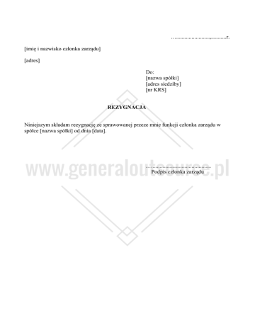 …........................,...........r. [imię i nazwisko członka zarządu] [adres] Do: [nazwa spółki] [adres siedziby] [nr KRS] REZYGNACJA Niniejszym składam rezygnację ze sprawowanej przeze mnie funkcji członka zarządu w spółce [nazwa spółki] od dnia [data]. .….......................................... Podpis członka zarządu