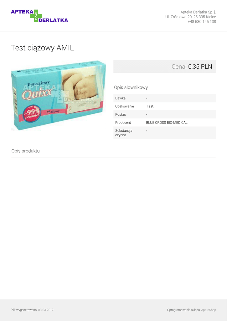 Apteka Derlatka Sp. j. Ul. Źródłowa 20, 25-335 Kielce +48 530 145 138 Test ciążowy AMIL Cena: 6,35 PLN Opis słownikowy Dawka - Opakowanie 1 szt. Postać - Producent BLUE CROSS BIO-MEDICAL Substancja czynna - Opis produktu Plik wygenerowano: 03-03-2017 Powered by TCPDF (www.tcpdf.org) Oprogramowanie sklepu: AptusShop