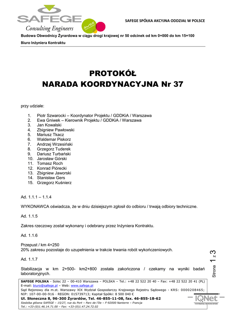 SAFEGE SPÓŁKA AKCYJNA ODDZIAŁ W POLSCE Budowa Obwodnicy Żyrardowa w ciągu drogi krajowej nr 50 odcinek od km 0+000 do km 15+100 Biuro Inżyniera Kontraktu PROTOKÓŁ NARADA KOORDYNACYJNA Nr 37 przy udziale: 1. 2. 3. 4. 5. 6. 7. 8. 9. 10. 11. 12. 13. 14. 15. Piotr Szwarocki – Koordynator Projektu / GDDKiA / Warszawa Ewa Gniwek – Kierownik Projektu / GDDKiA / Warszawa Jan Kowalski Zbigniew Pawłowski Mariusz Tkacz Waldemar Piskorz Andrzej Wrzesiński Grzegorz Tuderek Dariusz Turbański Jarosław Górski Tomasz Roch Konrad Piórecki Zbigniew Jaworski Stanisław Gers Grzegorz Kuśnierz Ad. 1.1.1 – 1.1.4 WYKONAWCA oświadcza, że w dniu dzisiejszym zgłosił do odbioru / trwają odbiory techniczne. Ad. 1.1.5 Zakres rzeczowy został wykonany i odebrany przez Inżyniera Kontraktu. Ad. 1.1.7 Stabilizacja w km 2+500- km2+800 została zakończona / czekamy na wyniki badań laboratoryjnych. SAFEGE POLSKA - Solec 22 – 00-410 Warszawa – POLSKA – Tel.: +48 22 522 20 40 – Fax: +48 22 522 20 41 (PL) E-mail: [email protected] – Web: www.safege.pl Sąd Rejonowy dla m.st. Warszawy XIX Wydział Gospodarczy Krajowego Rejestru Sądowego - KRS: 00002 08465; NIP: 107-00-00-916 · REGON: 015739713; Kapitał Spółki: 8 500 040 € Ul. Słoneczna 8, 96-300 Żyrardów, Tel. 46-855-11-08, fax. 46-855-18-62 Siedziba główna SAFEGE – 15/27, rue du Port – Parc de l’Ile – F-92000 Nanterre – Francja Tel.: +33-(0)1.46.14.71.00 – Fax: +33-(0)1.47.24.72.02 Strona Przepust / km 4+250 20% zakresu pozostaje do uzupełnienia w trakcie trwania robót wykończeniowych. 1z3 Ad. 1.1.6 SAFEGE SPÓŁKA AKCYJNA ODDZIAŁ W POLSCE Budowa Obwodnicy Żyrardowa w ciągu drogi krajowej nr 50 odcinek od km 0+000 do km 15+100 Biuro Inżyniera Kontraktu Ad. 1.3 Roboty branżowe. Km 1+350 do km 1+390 kolizja ze światłowodem. Gestor mediów / sieci / TP S.A. wyraził zgodę na przełączenie w dniu 4/5.Sierpień 2010 / w nocy. Punkt nr 2 Ad. 2.1. do 2.11 Zakres rzeczowy jest realizowany na bieżąco. Opóźnienia nadrobione będą w miarę możliwości przez drugą zmianę. Odbiory techniczne są w trakcie. Ad. 2.12 Zakres rzeczowy pozostaje do potwierdzenia. 2.13 DK 50 / przepust do instalacji / km 2+440 / nie wykonano 2.14 Przepust zostanie wykonany do końca bieżącego tygodnia. 2.15 Zbrojenie nasypów WD-2 warstwa nr 7 km 3+880 do km 3+980 i warstwa nr 5 km 3+980 do 4+136, warstwa nr 4 km 4+255 do km 4+380 WD-4 warstwa nr 6 rzędna 122 po str. Malejącej i 123 po str. Rosnącej. 2.16 Staw retencyjny nr 14 / trwa 2.17 wykreślamy 2.18 prace trwają 2.19 z powodu braku dokumentów sprzedażowych odbiór przesunął się na dzień dzisiejszy. 2.20 czekamy na protokół z badań. Geodezja jest gotowa. PODSUMOWANIE Opóźnienia wynikają m.in.: z potrzeby usunięcia szkód spowodowanych intensywnym opadem deszczu. Punkt nr 3 Ad. 3 Inżynier Kontraktu jest w trakcie weryfikacji harmonogramu postępu robót z dnia 29.Lipiec 2010. Strona 2z3 Ad. 4 Wykonawca zamieni Wystąpienie nr 402 z dnia 30.07.2010 na pismo przewodnie z informacją o podziale robót dla poszczególnych partnerów Konsorcjum w rozbiciu na branże i asortymenty robót. W terminie do dnia środa, 04. Sierpień 2010 SAFEGE POLSKA - Solec 22 – 00-410 Warszawa – POLSKA – Tel.: +48 22 522 20 40 – Fax: +48 22 522 20 41 (PL) E-mail: [email protected] – Web: www.safege.pl Sąd Rejonowy dla m.st. Warszawy XIX Wydział Gospodarczy Krajowego Rejestru Sądowego - KRS: 00002 08465; NIP: 107-00-00-916 · REGON: 015739713; Kapitał Spółki: 8 500 040 € Ul. Słoneczna 8, 96-300 Żyrardów, Tel. 46-855-11-08, fax. 46-855-18-62 Siedziba główna SAFEGE – 15/27, rue du Port – Parc de l’Ile – F-92000 Nanterre – Francja Tel.: +33-(0)1.46.14.71.00 – Fax: +33-(0)1.47.24.72.02 SAFEGE SPÓŁKA AKCYJNA ODDZIAŁ W POLSCE Budowa Obwodnicy Żyrardowa w ciągu drogi krajowej nr 50 odcinek od km 0+000 do km 15+100 Biuro Inżyniera Kontraktu Ad. 5 / 6 / 7 Stanowisko Zamawiającego nie uległo zmianie. Zapisy w SST pozostają bez zmian. Strona formalna, brak odbiorów GWN. Strona finansowa, skutkuje brakiem zapłaty za wykonane wyżej warstwy, mimo składanych dokumentów sprzedażowych wg Zamawiającego i Zespołu Inżyniera Kontraktu / nie spełniających wymagań SST. Strona techniczna: Na podstawie wyjaśnienia Projektanta / pismo Zamawiającego z dnia 26.07.2010 / GDDKiA.O /WA-R.1/OŻ/363/10 / które Wykonawca otrzymał w dniu 29.07.2010, w sprawie warstwy stabilizacji cementowej o wytrzymałości na ściskanie = 2,5 [MPa]. Projektant stwierdza, że w-wa ta stanowi podbudowę pomocniczą. Wykonawca stwierdza, że wstrzymuje wykonanie warstw powyżej GWN od dnia dzisiejszego. Potwierdzenie nastąpi w Dzienniku Budowy w dniu dzisiejszym. Powodem jest zbyt mała wytrzymałość zaprojektowanej w-wy jako podbudowa pomocnicza niezgodna z Polskimi Normami oraz takie wyjaśnienie jest niezgodne z Projektem Budowlanym i Wykonawczym. Zgłoszone przez Wykonawcę problemy mogą spowodować zatrzymanie wykonania części robót. Kierownik Projektu potwierdza, dotychczasowe stanowisko Zamawiającego, które nie uległo zmianie. Wykonawca nie otrzymał do dnia dzisiejszego odpowiedzi na swoje wystąpienie. Ad. 8 Ad. 9. Wykonawca uaktualni w dniu dzisiejszym informacje o frontach robót, na których prowadzone są roboty na dwie zmiany. Ad. 10 / 11 / 13 zostaje wyłączone do Protokołu miesięcznego najbliższej RADY BUDOWY. Ad. 12 Do zespołu geodetów doszły dwie osoby. Wykonawca zgłasza problem braku możliwości dojazdu w rejon obiektu WD-2, gdzie dojazd możliwy jest tylko drogą gminną. Nastąpiła blokada drogi przez lokalną społeczność. Trwają negocjacje. Ustala się następny termin narady na dzień: Strona Protokółował / Inżynier Rezydent ds. Drogowych ……… Otrzymują : ………………………………………………… piątek i wtorek 06 i 10. Sierpień 2010, godz. 10.00 Mariusz Tkacz uczestnicy narady wg listy obecności 3z