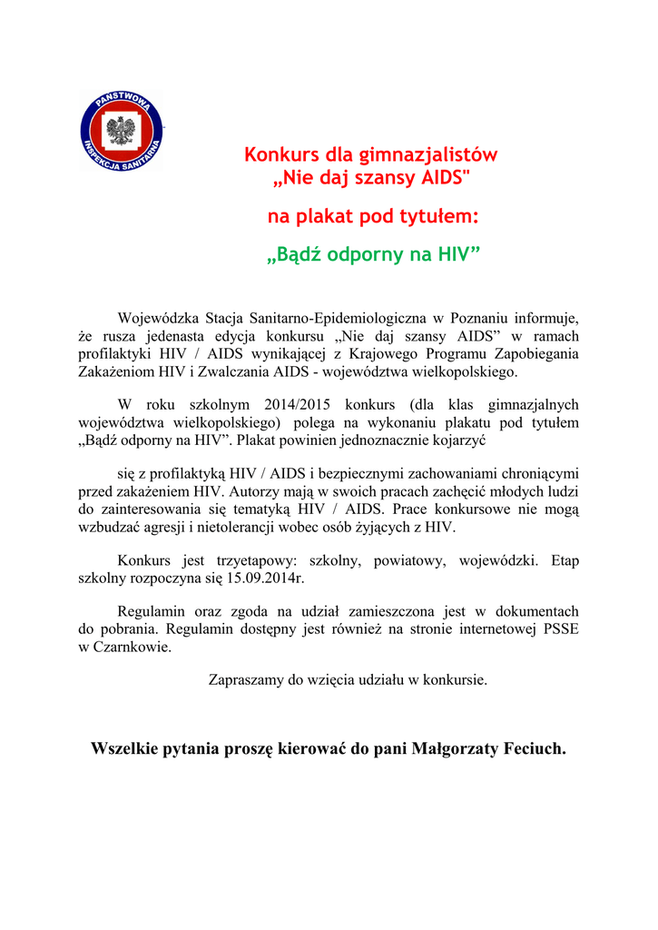 Konkurs dla gimnazjalistów „Nie daj szansy AIDS" na plakat pod tytułem: „Bądź odporny na HIV” Wojewódzka Stacja Sanitarno-Epidemiologiczna w Poznaniu informuje, że rusza jedenasta edycja konkursu „Nie daj szansy AIDS” w ramach profilaktyki HIV / AIDS wynikającej z Krajowego Programu Zapobiegania Zakażeniom HIV i Zwalczania AIDS - województwa wielkopolskiego. W roku szkolnym 2014/2015 konkurs (dla klas gimnazjalnych województwa wielkopolskiego) polega na wykonaniu plakatu pod tytułem „Bądź odporny na HIV”. Plakat powinien jednoznacznie kojarzyć się z profilaktyką HIV / AIDS i bezpiecznymi zachowaniami chroniącymi przed zakażeniem HIV. Autorzy mają w swoich pracach zachęcić młodych ludzi do zainteresowania się tematyką HIV / AIDS. Prace konkursowe nie mogą wzbudzać agresji i nietolerancji wobec osób żyjących z HIV. Konkurs jest trzyetapowy: szkolny, powiatowy, wojewódzki. Etap szkolny rozpoczyna się 15.09.2014r. Regulamin oraz zgoda na udział zamieszczona jest w dokumentach do pobrania. Regulamin dostępny jest również na stronie internetowej PSSE w Czarnkowie. Zapraszamy do wzięcia udziału w konkursie. Wszelkie pytania proszę kierować do pani Małgorzaty Feciuch.