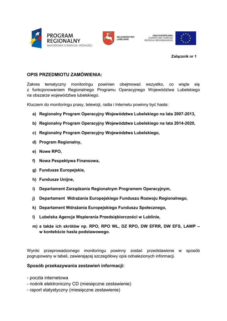 Załącznik nr 1 OPIS PRZEDMIOTU ZAMÓWIENIA: Zakres tematyczny monitoringu powinien obejmować wszystko, co wiąże się z funkcjonowaniem Regionalnego Programu Operacyjnego Województwa Lubelskiego na obszarze województwa lubelskiego. Kluczem do monitoringu prasy, telewizji, radia i Internetu powinny być hasła: a) Regionalny Program Operacyjny Województwa Lubelskiego na lata 2007-2013, b) Regionalny Program Operacyjny Województwa Lubelskiego na lata 2014-2020, c) Regionalny Program Operacyjny Województwa Lubelskiego, d) Program Regionalny, e) Nowe RPO, f) Nowa Pespektywa Finansowa, g) Fundusze Europejskie, h) Fundusze Unijne, i) Departament Zarządzania Regionalnym Programem Operacyjnym, j) Departament Wdrażania Europejskiego Funduszu Rozwoju Regionalnego, k) Departament Wdrażania Europejskiego Funduszu Społecznego, l) Lubelska Agencja Wspierania Przedsiębiorczości w Lublinie, m) a także ich skrótów np. RPO, RPO WL, DZ RPO, DW EFRR, DW EFS, LAWP – w kontekście hasła podstawowego. Wyniki przeprowadzonego monitoringu powinny zostać przedstawione w pogrupowany w tabeli, zawierającej szczegółowy opis odnalezionych informacji. Sposób przekazywania zestawień informacji: - poczta internetowa - nośnik elektroniczny CD (miesięczne zestawienie) - raport statystyczny (miesięczne zestawienie) sposób Cykl przekazywania danych: codzienny Zakres prowadzonych obserwacji powinien objąć w szczególności: 1. *Dzienniki o charakterze ogólnokrajowym*: Gazeta Wyborcza, Dziennik Gazeta Prawna, Rzeczpospolita, Puls Biznesu. 2. *Dzienniki o charakterze lokalnym: *Gazeta Wyborcza Lublin, Dziennik Wschodni, Polska Kurier Lubelski. 3. *Prasa lokalna:* Głos Świdnika, Nowa gazeta Biłgorajska, Tygodnik Zamojski, Kresy Tygodnik Chełmski, Super Tydzień Chełmski, Nowy Tydzień Tygodnik Lokalny, Słowo Podlasia, Kronika Tygodnia (Zamość). 4. *Prasę specjalistyczną, obejmujące tematykę funduszy unijnych:* dwumiesięcznik Fundusze Europejskie, Tygodnik Samorządu Terytorialnego "Wspólnota". 5. *Rozgłośnie radiowe lokalne*: Polskie Radio Lublin, Radio eR, Akademickie Radio Centrum, Radio Złote Przeboje Lublin, Radio Złote Przeboje Zamość, Radio eska Lublin, Radio eska Zamość, Radio FREE w Lublinie, Radio BON TON w Chełmie. 6. *Rozgłośnie radiowe ogólnopolskie*: Polskie Radio (Jedynka, Dwójka, Trójka), Radio Zet, Radio RMF. 7. *Internet: *ogólnokrajowe fora oraz portale* *informacyjne ze wskazaniem na województwo lubelskie. Z wykluczeniem konta Zamawiającego w portalu społecznościowym Facebook. 8. *Stacje telewizyjne*: TVP 1, TVP 2, TVP info, TVP Lublin, TVN, TVN24, TVN Biznes i Świat, TVN Style, Polsat, Polsat News, Polsat News 2. Wykonawca musi być uprawniony do przetwarzania i zwielokrotniania artykułów prasowych oraz wszelkich innych materiałów użytych do realizacji umowy, mających cechy utworu, a także do ich udostępniania i przekazywania Zamawiającemu w formie przygotowanych przez Wykonawcę zestawień własnego autorstwa, zgodnie z licencją. Opis Przedmiotu Zamówienia Strona 2