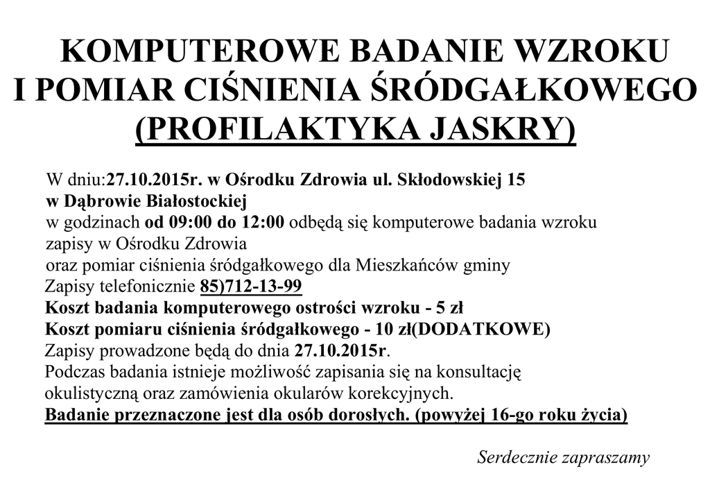 KOMPUTEROWE BADANIE WZROKU I POMIAR CIŚNIENIA ŚRÓDGAŁKOWEGO (PROFILAKTYKA JASKRY) W dniu:27.10.2015r. w Ośrodku Zdrowia ul. Skłodowskiej 15 w Dąbrowie Białostockiej w godzinach od 09:00 do 12:00 odbędą się komputerowe badania wzroku zapisy w Ośrodku Zdrowia oraz pomiar ciśnienia śródgałkowego dla Mieszkańców gminy Zapisy telefonicznie 85)712-13-99 Koszt badania komputerowego ostrości wzroku - 5 zł Koszt pomiaru ciśnienia śródgałkowego - 10 zł(DODATKOWE) Zapisy prowadzone będą do dnia 27.10.2015r. Podczas badania istnieje możliwość zapisania się na konsultację okulistyczną oraz zamówienia okularów korekcyjnych. Badanie przeznaczone jest dla osób dorosłych. (powyżej 16-go roku życia) Serdecznie zapraszamy