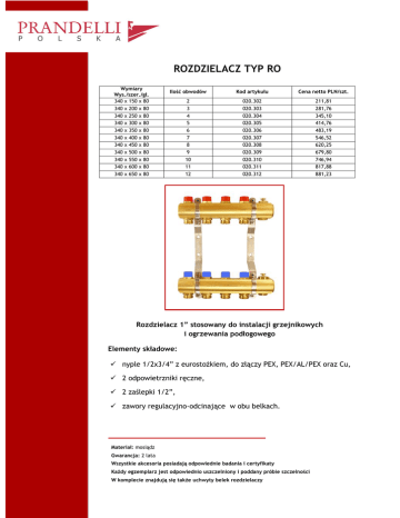 ROZDZIELACZ TYP RO Wymiary Wys./szer./gł. 340 x 150 x 80 340 x 200 x 80 340 x 250 x 80 340 x 300 x 80 340 x 350 x 80 340 x 400 x 80 340 x 450 x 80 340 x 500 x 80 340 x 550 x 80 340 x 600 x 80 340 x 650 x 80 Ilość obwodów Kod artykułu Cena netto PLN/szt. 2 3 4 5 6 7 8 9 10 11 12 020.302 020.303 020.304 020.305 020.306 020.307 020.308 020.309 020.310 020.311 020.312 211,81 281,76 345,10 414,76 483,19 546,52 620,25 679,80 746,94 817,88 881,23 Rozdzielacz 1” stosowany do instalacji grzejnikowych i ogrzewania podłogowego Elementy składowe: nyple 1/2x3/4” z eurostożkiem, do złączy PEX, PEX/AL/PEX oraz Cu, 2 odpowietrzniki ręczne, 2 zaślepki 1/2”, zawory regulacyjno-odcinające w obu belkach. Materiał: mosiądz Gwarancja: 2 lata Wszystkie akcesoria posiadają odpowiednie badania i certyfikaty Każdy egzemplarz jest odpowiednio uszczelniony i poddany próbie szczelności W komplecie znajdują się także uchwyty belek rozdzielaczy