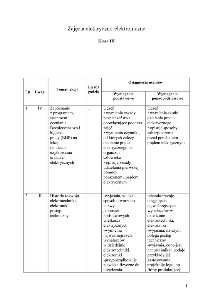Zajęcia elektryczno-elektroniczne Klasa III Osiągnięcia uczniów Lp Uwagi Temat lekcji Liczba godzin Wymagania podstawowe Wymagania ponadpodstawowe 1 IV Zapoznanie z programem, systemem oceniania. Bezpieczeństwo i higiena pracy (BHP) na lekcji i podczas użytkowania urządzeń elektrycznych 1 Uczeń: • wymienia zasady bezpieczeństwa obowiązujące podczas zajęć • wymienia czynniki, od których zależy działanie prądu elektrycznego na organizm człowieka • opisuje zasady udzielania pierwszej pomocy porażonemu prądem elektrycznym Uczeń: • wymienia skutki działania prądu elektrycznego • opisuje sposoby zabezpieczenia przed porażeniem prądem elektrycznym 2 II Historia rozwoju elektrotechniki, elektroniki – postęp techniczny 1 -wyjaśnia, w jaki sposób utworzono nazwy jednostek podstawowych wielkości elektrycznych -wymienia najważniejszych wynalazców w dziedzinie elektrotechniki, elektroniki -przyporządkowuje zjawiska fizyczne do urządzenia -charakteryzuje osiągnięcia najważniejszych wynalazców w dziedzinie elektrotechniki, elektroniki -wyjaśnia, na czym polega postęp techniczny -wyjaśnia, co to jest nanotechnika i podaje przykłady jej zastosowania projektuje logo, np. firmy produkującej 1 technicznego w sposób ekologiczny energię elektryczną 3 I Charakteryzowanie 1 sposobów wytwarzania energii elektrycznej -wymienia rodzaje ogniw elektrochemicznych -opisuje budowę, zasadę działania ogniwa elektrochemicznego -wymienia rodzaje prądu elektrycznego (stały, przemienny, zmienny) -wymienia sposoby wytwarzania energii elektrycznej, w tym sposoby ekologiczne -rozpoznaje rodzaj elektrowni, analizując jej zalety i wady -wyjaśnia, w jaki sposób odbywa się przesyłanie energii elektrycznej do odbiorców -wyjaśnia związek między ładowaniem baterii, akumulatorów, oszczędzaniem energii elektrycznej a zanieczyszczeniem środowiska przyrodniczego 4 I Analizowanie, rysowanie schematów elektrycznych 1 - wymienia elementy Pomiary w obwodach elektrycznych 1 - wyjaśnia, na czym polega przepływ prądu elektrycznego w obwodzie elektrycznym - analizuje schematy szeregowe, równoległe, szeregoworównoległe - rysuje schematy szeregowe, równoległe, szeregowo-równoległe - rysuje schemat obwodu elektrycznego z odbiornikiem, na którego podstawie można zmierzyć napięcie elektryczne - dokonuje pomiaru wielkości fizycznych 5 IV obwodu elektrycznego - rysuje symbole graficzne elementów obwodu elektrycznego -wymienia wielkości fizyczne związane z przepływem prądu elektrycznego w obwodzie oraz jednostki, w których się je podaje -buduje obwód elektryczny z miernikiem na podstawie schematu 2 1 -wyjaśnia rolę rezystora w obwodzie prądu elektrycznego -wymienia rodzaje rezystorów -wymienia parametry rezystora -rysuje symbole graficzne rezystorów (natężenie prądu, napięcie elektryczne, rezystancja) w różnego typu obwodach elektrycznych -rysuje symbole graficzne rezystorów, termistora, fotorezystora -odczytuje wartości rezystancji w oznaczeniu cyfrowo-literowym, kodem barwnym -rysuje, analizuje schemat obwodu z rezystorem 6 I Opornik (rezystor) – rola, rodzaje, parametry, odczytywanie oporu (rezystancji) 7 I Kondensator – rola, 1 rodzaje, odczytywanie parametrów -opisuje budowę kondensatora -wymienia rodzaje kondensatorów -wyjaśnia rolę kondensatora w obwodzie prądu elektrycznego -rysuje symbole graficzne kondensatorów -rysuje schemat obwodu z kondensatorem -odczytuje parametry kondensatora w oznaczeniu cyfrowo-literowym 8 I Dioda półprzewodnikowa – rola, rodzaje, odczytywanie parametrów 1 -opisuje budowę diody -wymienia rodzaje diod -wyjaśnia rolę diody w obwodzie prądu elektrycznego -rysuje symbole diod -odczytuje parametry diody w oznaczeniu literowo-cyfrowym -rysuje schemat obwodu z diodą -wyjaśnia, na czym polega katalogowanie diod 9 I Tranzystor – rola, rodzaje, rozpoznawanie elektrod, odczytywanie parametrów 1 -opisuje budowę tranzystora -wymienia rodzaje tranzystorów -wymienia nazwy elektrod w tranzystorze -rysuje symbole tranzystorów -rysuje schemat obwodu z tranzystorem -rozpoznaje elektrody tranzystora -odczytuje parametry tranzystora w oznaczeniu literowo-cyfrowym 3 -wyjaśnia rolę tranzystora w obwodzie prądu elektrycznego 10 I Zwojnica – rola, rodzaje, odczytywanie parametrów 1 -opisuje budowę zwojnicy -wymienia rodzaje zwojnic wyjaśnia, dlaczego rdzeń zwojnicy wykonany jest ze stali magnetycznie miękkiej -rysuje symbole zwojnic -rysuje schemat obwodu ze zwojnicą -wyjaśnia, na czym polega i od czego zależy indukcyjność 11 II Elektromagnes – sporządzanie rysunku złożeniowego, wykonawczego 2 -wyjaśnia zasady wykonywania rysunku złożeniowego -wyjaśnia zasady wykonywania rysunku wykonawczego -sporządza rysunek złożeniowy elektromagnesu -sporządza rysunek wykonawczy elektromagnesu 12 III Transformator – budowa, działanie, projektowanie 1 -określa budowę transformatora -rysuje symbol graficzny transformatora -wymienia urządzenia, w których znalazł zastosowanie transformator -wyjaśnia zasadę działania transformatora -projektuje transformator 13 I, IV Lutownica transformatorowa – budowa, działanie, lutowanie 1 -wymienia elementy budowy lutownicy transformatorowej -wyjaśnia zasady BHP obowiązujące podczas lutowania -wyjaśnia, na czym polega lutowanie -ustala kolejność obowiązującą przy wymianie grotu -rysuje schemat elektryczny lutownicy transformatorowej -sprawdza możliwość lutowania różnych metali -odczytuje informacje na tabliczce znamionowej -odczytuje klasy zabezpieczeń 14 II Konstruowanie elektronicznego modelu np. choinki – 1 -rozwiązuje założony problem -analizuje funkcję, jaką musi spełniać podstawkę pod choinkę -sporządza rysunek 4 wykonanie urządzenia – metoda projektu 15 16 I 17 II, III urządzenie -analizuje rysunek poglądowy przedstawiający choinkę -określa odpowiednie materiały, narzędzia, przyrządy pomiarowe -omawi