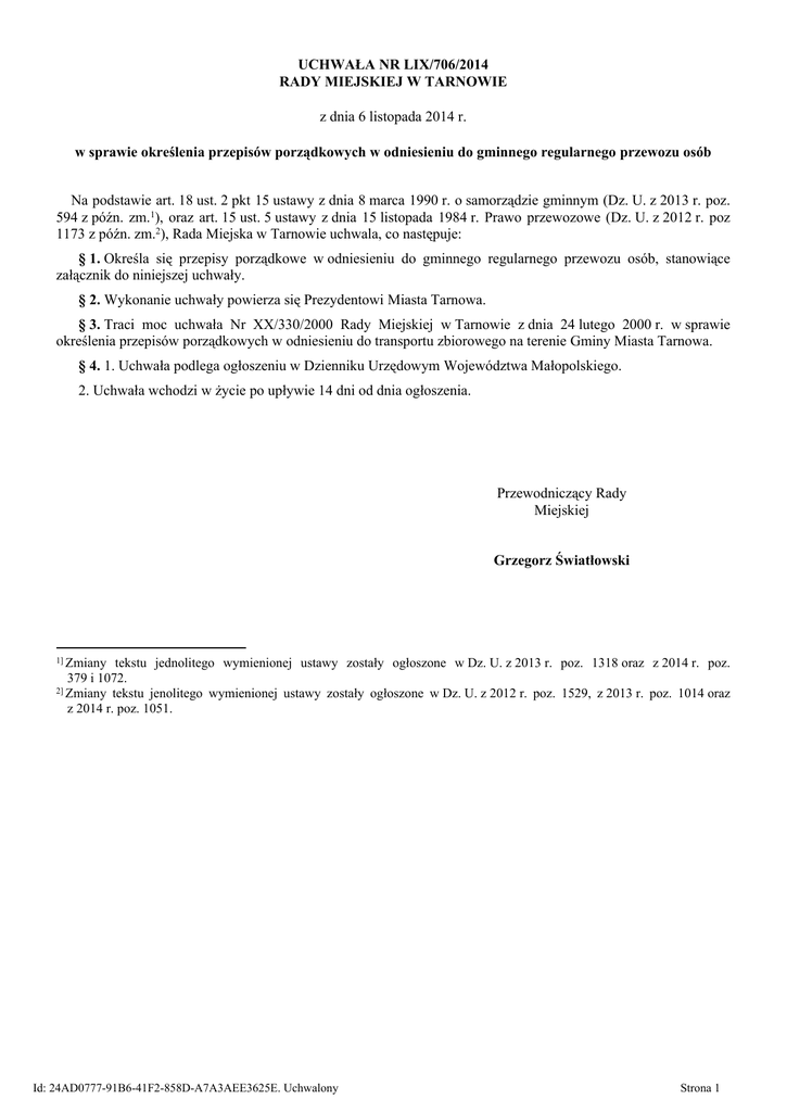 UCHWAŁA NR LIX/706/2014 RADY MIEJSKIEJ W TARNOWIE z dnia 6 listopada 2014 r. w sprawie określenia przepisów porządkowych w odniesieniu do gminnego regularnego przewozu osób Na podstawie art. 18 ust. 2 pkt 15 ustawy z dnia 8 marca 1990 r. o samorządzie gminnym (Dz. U. z 2013 r. poz. 594 z późn. zm.1), oraz art. 15 ust. 5 ustawy z dnia 15 listopada 1984 r. Prawo przewozowe (Dz. U. z 2012 r. poz 1173 z późn. zm.2), Rada Miejska w Tarnowie uchwala, co następuje: § 1. Określa się przepisy porządkowe w odniesieniu do gminnego regularnego przewozu osób, stanowiące załącznik do niniejszej uchwały. § 2. Wykonanie uchwały powierza się Prezydentowi Miasta Tarnowa. § 3. Traci moc uchwała Nr XX/330/2000 Rady Miejskiej w Tarnowie z dnia 24 lutego 2000 r. w sprawie określenia przepisów porządkowych w odniesieniu do transportu zbiorowego na terenie Gminy Miasta Tarnowa. § 4. 1. Uchwała podlega ogłoszeniu w Dzienniku Urzędowym Województwa Małopolskiego. 2. Uchwała wchodzi w życie po upływie 14 dni od dnia ogłoszenia. Przewodniczący Rady Miejskiej Grzegorz Światłowski 1] Zmiany tekstu jednolitego wymienionej ustawy zostały ogłoszone w Dz. U. z 2013 r. poz. 1318 oraz z 2014 r. poz. 379 i 1072. 2] Zmiany tekstu jenolitego wymienionej ustawy zostały ogłoszone w Dz. U. z 2012 r. poz. 1529, z 2013 r. poz. 1014 oraz z 2014 r. poz. 1051. Id: 24AD0777-91B6-41F2-858D-A7A3AEE3625E. Uchwalony Strona 1 Załącznik do Uchwały Nr LIX/706/2014 Rady Miejskiej w Tarnowie z dnia 6 listopada 2014 r. Przepisy porządkowe w odniesieniu do gminnego regularnego przewozu osób § 1. Przepisy porządkowe określają warunki przewozu osób środkami publicznego transportu zbiorowego w gminnych przewozach pasażerskich organizowanych przez Gminę Miasta Tarnowa na obszarze miasta Tarnów oraz gmin, które zawarły stosowne porozumienia międzygminne. § 2. Użyte w niniejszych przepisach określenia oznaczają: 1) środek transportu – pojazd (autobus) wykorzystywany przez operatora w publicznym transporcie zbiorowym; 2) operator – przedsiębiorca uprawniony do prowadzenia działalności gospodarczej w zakresie przewozu osób, który zawarł z organizatorem umowę o świadczenie usług w zakresie publicznego transportu zbiorowego; 3) organizator przewozów – Gmina Miasta Tarnowa; 4) podróżny – osoba korzystającą z usług przewozu; 5) kierowca – osoba uprawniona do kierowania środkiem transportu; 6) kontroler – osoba uprawniona do kontroli na mocy upoważnień organizatora. § 3. Do przestrzegania przepisów porządkowych w transporcie obowiązany jest podróżny kierowca oraz kontroler. § 4. Zabrania się przewozu: 1) przedmiotów, o wymiarach przekraczających wielkości ustalone przez organizatora przewozów; 2) przedmiotów, które ze względu na swoje właściwości mogą stanowić zagrożenie dla jego posiadacza lub innych podróżnych, a w szczególności niezabezpieczonych odpowiednio: przedmiotów o ostrych krawędziach, łatwopalnych, wybuchowych, substancji żrących, trujących itp.; 3) przedmiotów, które ze względu na swoje właściwości mogą budzić odrazę u innych podróżnych lub mogą spowodować zanieczyszczenie pojazdu; 4) zwierząt, które ze względu na rozmiary nie mogą być przewożone tego rodzaju pojazdem; 5) zwierząt, które mogą być niebezpieczne lub uciążliwe dla podróżnych ze względu na swoje cechy osobnicze i brak należytego zabezpieczenia. § 5. W czasie jazdy zabrania się: 1) odwracania uwagi kierowcy od spraw związanych z prowadzeniem środka transportu; 2) opierania się o drzwi środka transportu oraz ich otwierania; 3) wychylania się ze środka transportu; 4) zajmowania miejsca lub zachowywania się w sposób ograniczający kierowcy widoczność lub w inny sposób utrudniający prowadzenie środka transportu. § 6. Wewnątrz środka transportu, zarówno na postoju jak i w czasie jazdy zabrania się: 1) spożywania napojów alkoholowych oraz środków odurzających; 2) palenia wyrobów tytoniowych oraz używania tzw. e-papierosów; Id: 24AD0777-91B6-41F2-858D-A7A3AEE3625E. Uchwalony Strona 2 3) wyrzucania ze środka transportu jakichkolwiek przedmiotów; 4) zanieczyszczania i zaśmiecania lub niszczenia urządzeń i wyposażenia środka transportu; 5) spożywania żywności lub napojów mogących spowodować zanieczyszczenie pojazdu lub zabrudzenie innych podróżnych; 6) grania na instrumentach muzycznych lub korzystania z urządzeń nagłaśniających bez zgody organizatora przewozów; 7) przebywania w łyżworolkach lub wrotkach, używania deskorolek, rowerów i innego sprzętu sportowego; 8) umieszczania przedmiotów lub zwierząt w miejscach przeznaczonych do siedzenia lub w miejscach utrudniających poruszanie się wewnątrz środka transportu innym podróżnym; 9) żebrania i sprzedaży obnośnej; 10) kwestowania, nalepiania plakatów i ogłoszeń, rozrzucania i rozdawania ulotek oraz materiałów reklamowych bez zgody organizatora przewozów. § 7. W środkach transportu pasażerowie zajmujący pozycję stojącą obowiązani są w czasie jazdy trzymać się poręczy i uchwytów. § 8. Wsiadanie i wysiadanie ze środka transportu może odbywać się tylko po całkowitym jego zatrzymaniu i tylko w miejscach do tego przeznaczonych. § 9. Podróżni wsiadający do środka transportu mają obowiązek ustąpić pierwszeństwa osobom z niego wysiadającym. § 10. 1. Podróżny ma obowiązek zabezpieczyć rzeczy lub zwierzęta, które przewozi pod swoim nadzorem w taki sposób, aby nie powodowały zagrożenia bezpieczeństwa dla niego oraz dla innych podróżnych. 2. Dopuszcza się przewożenie w środkach transportu: 1) małych zwierząt domowych, jeżeli nie są uciążliwe dla pasażerów i są umieszczone w odpowiednim dla zwierzęcia koszu, skrzynce, klatce itp., zapewniającym bezpieczeństwo pasażerów i zwierząt; 2) psów, pod warunkiem, że nie zachowują się agresywnie, nie są uciążliwe dla pasażerów