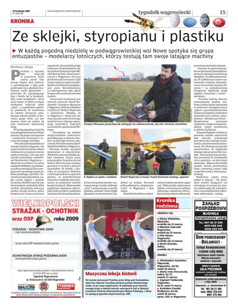 10 kwietnia 2009 nr wyd. 85 www.wagrowiec.naszemiasto.pl 15 tygodnik wągrowiecki KRONIKA Ze sklejki, styropianu i plastiku FOT.BARBARAJURGA Grzegorz Messyasz prezentuje jak obsługuje się radiową konsolę, aby móc sterować samolotem K. Kędzior ze swoim z modelem Robert Napierała (z lewej) i Paweł Kozłowski montują „piperka” Teraz testuję dwa modele: styropianowego, bardzo lekkiego „orła” i wykonanego z metalu iplastiku„polarisa”,którydzięki pływakom może startować i lą- dować na wodzie. Pierwsze próby odbywał na„księżym kacerku” w Wągrowcu i były udane. Paweł Kozłowski jest właści- cielemmodelusamolotu„piper cup”.Żółtymodel,wykonanyze sklejki, z elementami z włókna szklanego, napędzany silniczkiem benzynowym odkosiarki, Kronika rodzinna prezentuje się bardzo okazale. - Samolot w częściach kupiłemwinternecieiprzezkilkazimowych miesięcy mozolnie go sklejałem. To solidna konstrukcja. W najbliższym czasie w samolociku zostanie zainstalowana internetowa kamera filmowa i za pośrednictwem komputera będziemy mogli oglądać transmisje z lotów opowiada. - Ponadto kończę obecnie wykonywanie modelu szybowca, który będzie wzlatywał w powietrze wyciągany przez „pipera”,apowyhaczeniuzliny holowniczej będzie swobodnie szybował pod niebem samodzielnie - zdradza pan Paweł. Modelarstwo uprawiam oddziecka,swegoczasuprowadziłem nawet modelarnię w szkole w Gołańczy. KrzysztofKędziorzGołańczy pierwsze modele samolotów jako dziecko wykonywał pod okiem ojca, którego modelarskie zainteresowania kontynuuje. Do Nowego przyjechał samochodem, na bagażniku którego zamocowane były modele. Parol policji mnie po drodze zatrzymał, bo zaciekawiły ich te samoloty - ze śmiechem opowiada.–Mamwdomukilka modeli, dzisiaj przywiozłem biało – czerwoną „cessnę” i taki model bez nazwy, własną konstrukcję. Modelarze często biorą udział w zlotach. - Na zawodach modeli latających nie startujemy, bo to jest już wyższa szkoła jazdy dla zawodowców, a my modelarstwo traktujemy rekreacyjnie - mówią. OGŁOSZENIE 0230789/00 OGŁOSZENIE 0260373/00 URODZILI SIĘ: Oliwia Widzińska, Mieścisko urodziła się 24 marca; a Nikodem Sajewski Wągrowiec, urodził się 25 marca; a Pola Mosor, Wągrowiec urodziła się 23 marca; a Marta Gruszka, Żelice, urodziła się 26 marca; a FOT.ARKADIUSZ DEMBIŃSKI P ierwszy z murawy łąki wzleciał w powietrze biało czarny „orzeł”. Gdy zaczął krążyć pod niebem, z sąsiadującego z łąką pola poderwało się z głośnym krakaniem stado gawronów – poleciało do sąsiadującego lasu i skryło się w krzakach. Gdy orzeł wylądował i skrył się w trawie, w niebo z cichym warkotem wzleciał żółty „piper”, a uspokojone gawrony powróciły do żerowania na świeżo zaoranym polu, bacznie jednak zerkały w kierunku grupy ludzi, czy aby czasem znów nie pojawi się pod chmurami szponiasty wróg. W każdą pogodną niedzielę w podwągrowieckiej wsi Nowe spotyka się grupa entuzjastów – modelarzy lotniczych i testuje swe latające machiny. - Wcześniej korzystaliśmy ze starego lotniska w Łęgowie. Ale nasze modele sterowane falami radiowymi na tamtym terenie miały trudności. Coś tam jest nie tak z tymi falami - mówi Paweł Kozłowski z Wągrowca. – Może ktoś w okolicy ma silny nadajnik CB Radio i są zakłócenia albo powoduje je linia energetyczna wysokiego napięcia, która przebiega w pobliżu. Samoloty leciały pod niebem, nagle traciły sygnał i spadały na ziemię. Rozbiło nam się tam lub poważnie uszkodziło kilka modeli. Zaczęliśmy wówczas szukać innego miejsca, gdzie bezpiecznie można puszczać samolociki. Zauważyliśmy łąkę w Nowem. Dowiedzieliśmy się, że jej właścicielem jest pan Michał Borowiński, lekarz weterynarii z Wągrowca. Od razu pozwolił nam korzystać z łąki i teraz tutaj jest nasze lotnisko. Bardzo chcielibyśmy podziękować panu Borowińskiemu za udostępnienie łąki, gdzie bezpiecznie możemy testować modele. Lotniczych modelarzy jest obecnie czterech: Paweł Kozłowski i Grzegorz Messyasz z Wągrowca, Krzysztof Kędzior z Gołańczy i Robert Napierała z Gołaszewa. Wiedzą, że w Wągrowcu i okolicach jest więcej pasjonatów lotniczego modelarstwa i dlatego zapraszają wszystkich chętnych na niedzielne spotkania do Nowego. - Poznaliśmy się właśnie dzięki modelom - mówi Grzegorz Messyasz, z zawodu inżynier technologii drewna, pracownik Wielobranżowej SpółdzielniInwalidówwWągrowcu. - Pierwsze modele zacząłem wykonywać w dzieciństwie. Właściwie cały czas kleiłem jakieś samoloty. Często pracę przerywałem, by potem do niej wrócić. Obecnie mam w domu gotowych 8 modeli z różnych materiałów. Ze sklejki, z plastiku, ze styropianu. Niektóre z nich kupowałem w częściach gotowe, za pośrednictwem internetu, a niektóre sam wycinałem na podstawie planów konstrukcyjnych. Moje modele są głównie napędzane silniczkamielektrycznymi,zasilanymi bateriami lub akumulatorkami. FOT.BARBARAJURGA Barbara Jurga FOT.BARBARAJURGA b W każdą pogodną niedzielę w podwągrowieckiej wsi Nowe spotyka się grupa entuzjastów – modelarzy lotniczych, którzy testują tam swoje latające machiny Muzyczna lekcja historii Od czasów pierwszych Piastów, przez bitwę pod Grunwaldem, dalej lata zaborów i burzliwą pierwszą połowę dwudziestego wieku, aż po czasy współczesne. W wędrówkę przez historię naszego kraju w sobotni wieczór zebranych w hali w Skokach przeniosła Orkiestra Reprezentacyjna Wojska Polskiego, z którą na występ przyjechał zespół taneczny. ADE ZMARLI: Włodzimierz Kazimierz Filipowski, Wągrowiec, lat 66, zmarł 26 marca; a Maria Irena Owczarzak, Łekno, lat 47, zmarła 27 marca; a Zygmunt Tomkowiak, Wągrowiec, lat 61, zmarł 27 marca; a Kazimierz Pawlak Redgoszcz, lat 68, zmarł 30 marca; oprac. USC w Wągrowcu a