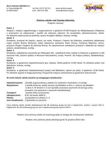 Biuro Podróży ARKONA S.C. ul. Konarskiego 40 62-600 KOŁO tel./fax 63 27 20 113 kom. 601 572 585 www.arkona.org.pl [email protected] Zielona szkoła nad Zatoką Gdańską Program ramowy Dzień 1 Wyjazd z miejsca uzgodnionego z organizatorem o godzinie 07.00.Przejazd do Władysławowa Chłapowa z przerwami na odpoczynek i posiłki we własnym zakresie. Po przyjeździe zakwaterowanie, obiad. Po obiedzie odpoczynek po podróży, spacer brzegiem Bałtyku, kolacja, nocleg. Dzień 2 Śniadanie, przejazd do Sopotu, spacer, po molo. Przejazd z Sopotu do Gdańska, zwiedzanie zabytkowej części miasta; Brama Wyżynna, wieża więzienna, katownia, Dwór Artusa, Fontanna Neptuna, ratusz, przejście Długim Targiem do Zielonej Bramy. Po zakończonym zwiedzaniu przejazd z Gdańska do miejsca pobytu, obiadokolacja, nocleg. Dzień 3 Śniadanie, całodzienna wycieczka po Półwyspie Hel, zwiedzanie Helu ( pobyt w fokarium o godzinie 11.00 karminie fok), Jastarni (pobyt w Muzeum Kaszubskim), Juraty. Powrót do miejsca pobytu, obiadokolacja, nocleg. Dzień 4 Śniadanie, w godzinach dopołudniowych gry, zabawy. Około godziny 13.00 obiad. Po obiedzie pobyt nad Bałtykiem, kolacja, nocleg. Dzień 5 Śniadanie, w godzinach dopołudniowych pobyt nad Bałtykiem, spacer po plaży. O godzinie 13.00 obiad. Po obiedzie wyjazd w drogę powrotną. Przyjazd do miejsca zamieszkania w godzinach wieczornych. W cenie zielone szkoły zawarte są następujące świadczenia: Zakwaterowanie: ośrodek wypoczynkowy, pokoje 4,5 osobowe z łazienkami, 4 noclegi Wyżywienie: 3 posiłki dziennie, pobyt zaczyna się obiadem w dniu 1 i kończy się obiadem w dniu 5. W dniach 2 i 3 na II posiłek uczestnicy wycieczki otrzymują suchy prowiant a po powrocie z wycieczki obiadokolację. Transport: autokar klasy turystycznej Ubezpieczenie: N.W. do kwoty 3000 zł. Pilotaż: przewodnicy w dniach 2 i 3 Inne świadczenia: 1 dyskoteka na życzenie Cena zielonej szkoły została skalkulowana dla 48 osobowej grupy (w tym 4 opiekunów gratis) i wynosi 410 zł. Odpłatność dla 38 osobowej grupy (w tym 3 opiekunów gratis) wynosi 440 zł. Podane ceny zielonej szkoły nie zawierają opłat za wstępy do zwiedzanych obiektów. Podane ceny zielonej szkoły obowiązują do 31 grudnia 2016 roku.