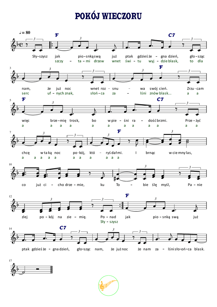 POKÓJ WIECZORU = 80 F 3 Sły szysz 3 C7 3 jak szczy pio snkąswą ta mi drzew 3 że uf F 5 gdzieś że tu wyj gna dzień, dzie blask, 7 snu za wa swój cień. lśni znów blask... Zrzu cam a a C7 3 bo a w pie a śni ra a a w ta ką noc a a a po kój, a a któ a dość brzmi. a a ryś dał mi. a a a Prze żyć a a I brnąc 10 w cie mny las, 3 co już ci cho drze mie, ku To 3 3 zlej po mię. kój na zie Po Sły nad szysz gna dzień, gło sząc pio snką swą 3 że już noc C nie że nam już za lśni sło oń ca blask. nam, myśl, 3 3 3 17 Pa jak ptak gdzieś że bie ślę C7 14 3 F 12 3 F 3 3 3 a 3 wnet roz słoń ca brze mię trosk, a a a gło sząc to dla F już noc nych znak, więc a chcę a ptak świ 3 już wnet 3 3 nam, serc 3