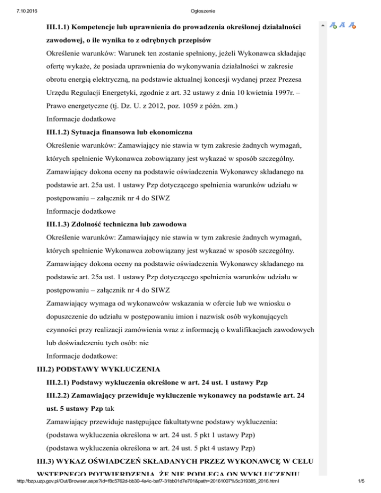 7.10.2016 Ogłoszenie III.1.1) Kompetencje lub uprawnienia do prowadzenia określonej działalności zawodowej, o ile wynika to z odrębnych przepisów Określenie warunków: Warunek ten zostanie spełniony, jeżeli Wykonawca składając ofertę wykaże, że posiada uprawnienia do wykonywania działalności w zakresie obrotu energią elektryczną, na podstawie aktualnej koncesji wydanej przez Prezesa Urzędu Regulacji Energetyki, zgodnie z art. 32 ustawy z dnia 10 kwietnia 1997r. – Prawo energetyczne (tj. Dz. U. z 2012, poz. 1059 z późn. zm.) Informacje dodatkowe III.1.2) Sytuacja finansowa lub ekonomiczna Określenie warunków: Zamawiający nie stawia w tym zakresie żadnych wymagań, których spełnienie Wykonawca zobowiązany jest wykazać w sposób szczególny. Zamawiający dokona oceny na podstawie oświadczenia Wykonawcy składanego na podstawie art. 25a ust. 1 ustawy Pzp dotyczącego spełnienia warunków udziału w postępowaniu – załącznik nr 4 do SIWZ Informacje dodatkowe III.1.3) Zdolność techniczna lub zawodowa Określenie warunków: Zamawiający nie stawia w tym zakresie żadnych wymagań, których spełnienie Wykonawca zobowiązany jest wykazać w sposób szczególny. Zamawiający dokona oceny na podstawie oświadczenia Wykonawcy składanego na podstawie art. 25a ust. 1 ustawy Pzp dotyczącego spełnienia warunków udziału w postępowaniu – załącznik nr 4 do SIWZ Zamawiający wymaga od wykonawców wskazania w ofercie lub we wniosku o dopuszczenie do udziału w postępowaniu imion i nazwisk osób wykonujących czynności przy realizacji zamówienia wraz z informacją o kwalifikacjach zawodowych lub doświadczeniu tych osób: nie Informacje dodatkowe: III.2) PODSTAWY WYKLUCZENIA III.2.1) Podstawy wykluczenia określone w art. 24 ust. 1 ustawy Pzp III.2.2) Zamawiający przewiduje wykluczenie wykonawcy na podstawie art. 24 ust. 5 ustawy Pzp tak Zamawiający przewiduje następujące fakultatywne podstawy wykluczenia: (podstawa wykluczenia określona w art. 24 ust. 5 pkt 1 ustawy Pzp) (podstawa wykluczenia określona w art. 24 ust. 5 pkt 4 ustawy Pzp) III.3) WYKAZ OŚWIADCZEŃ SKŁADANYCH PRZEZ WYKONAWCĘ W CELU WSTĘPNEGO POTWIERDZENIA, ŻE NIE PODLEGA ON WYKLUCZENIU http://bzp.uzp.gov.pl/Out/Browser.aspx?id=f8c5762dbb304a4cbaf731bb01d7e701&path=20161007%5c319385_2016.html 1/5 7.10.2016 Ogłoszenie WSTĘPNEGO POTWIERDZENIA, ŻE NIE PODLEGA ON WYKLUCZENIU ORAZ SPEŁNIA WARUNKI UDZIAŁU W POSTĘPOWANIU ORAZ SPEŁNIA KRYTERIA SELEKCJI Oświadczenie o niepodleganiu wykluczeniu oraz spełnianiu warunków udziału w postępowaniu tak Oświadczenie o spełnianiu kryteriów selekcji nie III.4) WYKAZ OŚWIADCZEŃ LUB DOKUMENTÓW , SKŁADANYCH PRZEZ WYKONAWCĘ W POSTĘPOWANIU NA WEZWANIE ZAMAWIAJACEGO W CELU POTWIERDZENIA OKOLICZNOŚCI, O KTÓRYCH MOWA W ART. 25 UST. 1 PKT 3 USTAWY PZP: W celu wykazania spełnienia warunku udziału w postępowaniu dotyczącego braku podstaw do wykluczenia z postępowania o udzielenie zamówienia Wykonawcy w okolicznościach, o których mowa w art. 24 ust. 1 oraz ust 5 pkt 1,4 ustawy Pzp, należy złożyć następujące dokumenty: 1. Oświadczenie o braku podstaw do wykluczenia – załącznik nr 4 do SIWZ, załącznik nr 5 do SIWZ (przynależność lub brak przynależności do grupy) 2. Aktualny odpis z właściwego rejestru lub z centralnej ewidencji i informacji o działalności gospodarczej, jeżeli odrębne przepisy wymagają wpisu do rejestru lub ewidencji, w celu wykazania braku podstaw do wykluczenia na podstawie art. 24. ust. 5 pkt. 1 ustawy Pzp Dokumenty o których mowa w ppkt 2. powinny być wystawione nie wcześniej niż 6 miesięcy przed upływem terminu składania ofert albo wniosków o dopuszczenie do udziału w postępowaniu. Jeżeli Wykonawca ma siedzibę lub miejsce zamieszkania poza terytorium Rzeczypospolitej Polskiej, zamiast dokumentów, o których mowa w powyżej: A. ppkt 2. składa dokument lub dokumenty wystawione w kraju, w którym Wykonawca ma siedzibę lub miejsce zamieszkania potwierdzając, że nie otwarto w stosunku do niego likwidacji ani nie ogłoszono upadłości, B. składa oświadczenia, o których mowa w ppkt 1. Dokumenty o których mowa w ppkt 1 oraz ppkt A powinny być wystawione nie wcześniej niż 6 miesięcy przed upływem terminu składania ofert albo wniosków o dopuszczenie do udziału w postępowaniu. W przypadku wskazania przez Wykonawcę dostępności oświadczeń lub dokumentów, o których mowa powyżej, w formie elektronicznej pod określonymi adresami internetowymi ogólnodostępnych i bezpłatnych baz danych, Zamawiający pobiera samodzielnie z tych baz danych wskazane przez wykonawcę oświadczenia lub dokumenty. W przypadku wskazania przez Wykonawcę oświadczeń lub dokumentów, o których mowa powyżej, które http://bzp.uzp.gov.pl/Out/Browser.aspx?id=f8c5762dbb304a4cbaf731bb01d7e701&path=20161007%5c319385_2016.html 2/5 7.10.2016 Ogłoszenie przez Wykonawcę oświadczeń lub dokumentów, o których mowa powyżej, które znajdują się w posiadaniu Zamawiającego, w szczególności oświadczeń lub dokumentów przechowywanych przez Zamawiającego zgodnie z art. 97 ust. 1 ustawy Pzp, Zamawiający w celu potwierdzenia okoliczności, o których mowa w art. 25 ust. 1 pkt 1 i 3 ustawy Pzp, korzysta z posiadanych oświadczeń lub dokumentów, o ile są one aktualne. Wykonawca, który podlega wykluczeniu na podstawie art. 24 ust. 1 pkt 13 i 14 oraz 1620 lub ust. 5 ustawy Pzp, może przedstawić dowody na to, że podjęte przez niego środki są wystarczające do wykazania jego rzetelności, w szczególności udowodnić naprawienie szkody wyrządzonej przestępstwem lub przestępstwem skarbowym, zadośćuczynienie pieniężne za doznaną krzywdę lub naprawienie szkody, wyczerpujące wyjaśnienie stanu faktycznego oraz współpracę z organami ścigania oraz podjęcie konkretnych środków technicznych, organizacyjnych i kadrowych, które są odpowiednie dla zapobiegania dalszym przestępstwom 