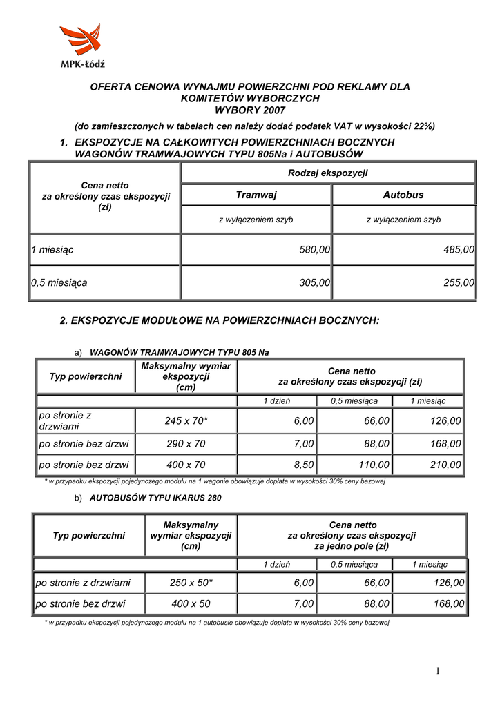 OFERTA CENOWA WYNAJMU POWIERZCHNI POD REKLAMY DLA KOMITETÓW WYBORCZYCH WYBORY 2007 (do zamieszczonych w tabelach cen naleŜy dodać podatek VAT w wysokości 22%) 1. EKSPOZYCJE NA CAŁKOWITYCH POWIERZCHNIACH BOCZNYCH WAGONÓW TRAMWAJOWYCH TYPU 805Na i AUTOBUSÓW Rodzaj ekspozycji Cena netto za określony czas ekspozycji (zł) Tramwaj Autobus z wyłączeniem szyb z wyłączeniem szyb 1 miesiąc 580,00 485,00 0,5 miesiąca 305,00 255,00 2. EKSPOZYCJE MODUŁOWE NA POWIERZCHNIACH BOCZNYCH: a) WAGONÓW TRAMWAJOWYCH TYPU 805 Na Typ powierzchni Maksymalny wymiar ekspozycji (cm) Cena netto za określony czas ekspozycji (zł) 1 dzień 0,5 miesiąca 1 miesiąc po stronie z drzwiami 245 x 70* 6,00 66,00 126,00 po stronie bez drzwi 290 x 70 7,00 88,00 168,00 po stronie bez drzwi 400 x 70 8,50 110,00 210,00 * w przypadku ekspozycji pojedynczego modułu na 1 wagonie obowiązuje dopłata w wysokości 30% ceny bazowej b) AUTOBUSÓW TYPU IKARUS 280 Typ powierzchni Maksymalny wymiar ekspozycji (cm) Cena netto za określony czas ekspozycji za jedno pole (zł) 1 dzień 0,5 miesiąca 1 miesiąc po stronie z drzwiami 250 x 50* 6,00 66,00 126,00 po stronie bez drzwi 400 x 50 7,00 88,00 168,00 * w przypadku ekspozycji pojedynczego modułu na 1 autobusie obowiązuje dopłata w wysokości 30% ceny bazowej 1 3. EKSPOZYCJE NA TYLNYCH I BOCZNYCH POWIERZCHNIACH AUTOBUSÓW: Cena netto za określony czas ekspozycji (zł) Typ powierzchni 1 dzień 0,5 miesiąca 1 miesiąc szyba tylna 8,50 110,00 210,00 powierzchnia tylna poniŜej szyby 8,50 110,00 210,00 21,00 276,00 525,00 20,00 265,00 504,00 11,00 147,00 280,00 8,50 110,00 210,00 powierzchnia boczna po stronie bez drzwi („tramboard”) powierzchnia boczna po stronie bez drzwi („busboard”) powierzchnia boczna po stronie bez drzwi („partside”) dwustronny plakat na tylnej szybie autobusów umieszczony od wewnątrz * w przypadku plakatów papierowych wymagamy dostarczenia dwustronnej taśmy klejącej; cena zawiera koszt umieszczenia i usunięcia plakatu 4. EKSPOZYCJE WEWNĄTRZ POJAZDÓW: a) PLAKATY NA SZYBACH WAGONÓW TRAMWAJOWYCH TYPU 805 Na i AUTOBUSÓW* Okres ekspozycji Cena netto (zł/plakat A5) Cena netto (zł/plakat A4) Cena netto (zł/plakat A3) 1 miesiąc 18,00 30,00 50,00 0,5 miesiąca 11,00 18,00 30,00 1,00 1,50 2,50 1 dzień * plakat papierowy lub przygotowany w formie naklejki; w przypadku plakatów papierowych wymagamy dostarczenia dwustronnej taśmy klejącej; cena zawiera koszt umieszczenia i usunięcia plakatu i dotyczy reklamy o treści zawartej na jednej stronie uwaga: plakaty umieszczane są wyłącznie na niedzielonych szybach wyjścia awaryjnego, w łącznej liczbie max 2 szt./ pojazd; MPK-Łódź Spółka z o.o. zastrzega sobie prawo odmowy przyjęcia zamówienia na ekspozycję w przypadku wykorzystania wszystkich dostępnych powierzchni szyb; umieszczenie plakatu w formacie większym niŜ A3 wymaga indywidualnych uzgodnień b) RAMKI POD PLAKATY W WAGONACH TRAMWAJOWYCH TYPU 805 Na* Okres ekspozycji Cena netto za określony czas ekspozycji (zł/ plakat) 1 miesiąc 28,00 0,5 miesiąca 15,00 1 dzień 1,50 * w jednej ramce są umieszczone 2 plakaty; wielkość plakatu winna wynosić: 33,5 cm x 37 cm (szer. x wys.), widoczny format plakatu 32 cm x 35 cm 2 c) KASETKI NA ULOTKI W WAGONACH TRAMWAJOWYCH TYPU 805 Na* Okres ekspozycji (zł netto/kasetka) 1 miesiąc 28,00 0,5 miesiąca 15,00 1 dzień 1,50 * wymiar kasetki 22,5 cm x 20 cm (szer. x wys.) 5. WYNAJEM POJAZDU W CELU PRZEPROWADZENIA AKCJI (NP. ROZDAWANIE ULOTEK) Typ pojazdu Wagon tramwajowy Autobus Cena bazowa netto (zł/ godz.) cityrunner 805 Na 5N przegubowy jednoczłonowy 300,00 200,00 220,00 180,00 120,00 6. POWIERZCHNIE NA TERENIE NIERUCHOMOŚCI MPK-Łódź Spółka z o. o. UDOSTĘPNIONE POD BANERY REKLAMOWE I TABLICE Z PLAKATAMI * Okres ekspozycji Cena netto (zł/m² baneru/ tablicy) 1 miesiąc 20,00 0,5 miesiąca 10,00 1 dzień 1,00 *proponowane powierzchnie: pod banery –elewacje budynków, pod tablice z plakatami – ogrodzenia obiektów; szczegółowy wykaz moŜliwych lokalizacji udostępnia Sekcja Marketingu Działu Obsługi Spółki; cena nie zawiera montaŜu; sposób mocowania wymaga dodatkowych uzgodnień 7. UWAGI KOŃCOWE 1. Klient odpowiada za wszelkie szkody w mieniu MPK - Łódź Spółka z o.o. powstałe przy wykonaniu, zmianie, odnawianiu, naprawie oraz usunięciu reklamy. Podstawą ustalenia rodzaju i rozmiaru szkody jest poz. 10 formularza „Zlecenie wykonania prac - Protokół odbioru pojazdu”. 2. Przez usunięcie reklamy rozumie się przywrócenie udostępnionym pojazdom barw firmowych MPK - Łódź Spółka z o.o. tj. Ŝółto – czerwonych, zgodnie z 3 3. 4. 5. 6. 7. kodami kolorów przyjętymi dla barw firmowych: kolor Ŝółty RAL 1004, kolor czerwony RAL 3003. Z chwilą rozwiązania umowy reklama zostanie usunięta poprzez przywrócenie pojazdów do barw firmowych łącznie z uzupełnieniem powłoki lakierniczej, jeśli uległa uszkodzeniu w trakcie usuwania reklamy. Klient udziela MPK - Łódź Spółka z o.o. 12-miesięcznej gwarancji na wykonane prace lakiernicze w zakresie przywrócenia pojazdu do barw firmowych MPK - Łódź Spółka z o.o. W przypadku stwierdzenia zastrzeŜeń do wykonanych prac związanych z usunięciem reklamy i niewykonaniem poprawek w terminie 14 od daty podpisania Zlecenia wykonania prac, MPK – Łódź Spółka z o.o. wykona prace polegające na właściwym przywróceniu powłoki lakierniczej, a kosztami ww. prac obciąŜy Klienta. W przypadku umowy na obsługę kompleksową Klient zobowiązany jest do zapłaty dodatkowego wynagrodzenia za wykonanie poprawek na podstawie kalkulacji przedstawionej przez MPK – Łódź Spółka z o.o. MPK - Łódź Spółka z o.o moŜe udostępniać pod reklamy pozostałe powierzchnie pojazdów nieobjęte umową innym kontrahentom, bez prawa roszczeń ze strony Klienta. KOSZTY WYKONANIA REKLAMY NALEśY SKALKULOWAĆ WEDŁUG CENNIKA PODSTAWOWEGO WYKONANIA REKLAMY. WSZYSTKIE REKLAMY Z ZEWNĘTRZNYCH L