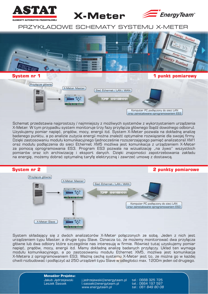EnergyTeam X-Meter PRZYKŁADOWE SCHEMATY SYSTEMU X-METER System nr 1 1 punkt pomiarowy Przyłącze główne X-Meter Master Sieć Ethernet / LAN / WAN Komputer PC podłączony do sieci LAN oraz zainstalowane oprogramowaniem ES3 Schemat przedstawia najprostszy / najmniejszy z możliwych systemów z wykorzystaniem urządzenia X-Meter. W tym przypadku system monitoruje trzy fazy przyłącza głównego (bądź dowolnego odbioru). Uzyskujemy pomiar napięć, prądów, mocy, energii itd. System X-Meter pozwala na dokładną analizę badanego punktu, a po analizie zużycia energii można znaleźć optymalne rozwiązanie dla swojej firmy. Dzięki zastosowaniu modułu komunikacyjnego (jednocześnie rozszerzającego pamięć analizatora) XM1 oraz modułu podłączenia do sieci Ethernet XM5 możliwa jest komunikacja z urządzeniem X-Meter za pomocą oprogramowania ES3. Program ES3 pozwala na wizualizację „na żywo” wszystkich pomiarów oraz ich archiwizację i eksport danych. Dzięki znajomości zapotrzebowania zakładu na energię, możemy dobrać optymalną taryfę elektryczną i zawrzeć umowę z dostawcą. System nr 2 2 punkty pomiarowe Przyłącze główne X-Meter Master Sieć Ethernet / LAN / WAN Komputer PC podłączony do sieci LAN oraz zainstalowane oprogramowaniem ES3 X-Meter Slave System składający się z dwóch analizatorów X-Meter połączonych ze sobą. Jeden z nich jest urządzeniem typu Master, a drugie typu Slave. Oznacza to, że możemy monitorować dwa przyłącza główne lub dwa odbiory które szczególnie nas interesują w firmie. Również tutaj uzyskujemy pomiar napięć, prądów, mocy, energii itd. Mamy dokładną analizę badanych przyłączy. Układ ten wymaga modułu komunikacyjnego, a po zastosowaniu modułu Ethernet XM5, możliwa jest komunikacja X-Metera z oprogramowaniem ES3. Ważną cechą systemu X-Meter jest to, ze można go w każdej chwili rozbudować i podłączyć aż 250 urządzeń typu Slave w odległości max. 1200m jeden od drugiego. Menadżer Projektu: Jakub Jędrzejewski Leszek Sassek [email protected] [email protected] www.energyteam.pl tel.: 0668 325 725 tel.: 0664 197 597 tel.: 061 849 80 08 EnergyTeam X-Meter PRZYKŁADOWE SCHEMATY SYSTEMU X-METER System nr 3 9 punktów pomiarowych Przyłącze główne X-Meter Master Sieć Ethernet / LAN / WAN Komputer PC podłączony do sieci LAN oraz zainstalowane oprogramowaniem ES3 Liczniki trójfazowe System składający się z jednego analizatora X-Meter oraz podłączonych ośmiu liczników trójfazowych z wyjściem inpulsowym. System ten pozwala na dogłębną analizę sieci przez urządzenie X-Meter oraz pomiar zużytej energii elektrycznej. Dzięki ośmiu wejściom impulsowym, oprócz liczników energii możemy podłączyć przepływomierze wody, gazu, sprężonego powietrza, ciepła itd. Układ ten wymaga modułu komunikacyjnego, oraz modułu wejść impulsowych XM3, a po zastosowaniu modułu Ethernet XM5, możliwa jest komunikacja X-Metera z oprogramowaniem ES3. Układ ten możemy stosować tam, gdzie chcemy tylko pomiar zużytej energii, a nie analizę wszystkich parametrów sieci, a urządzenie X-Meter zainstalowane na przyłączu bądź na szczególnie ważnym odbiorze pokaże dokładnie jakość energii. Menadżer Projektu: Jakub Jędrzejewski Leszek Sassek [email protected] [email protected] www.energyteam.pl tel.: 0668 325 725 tel.: 0664 197 597 tel.: 061 849 80 08 X-Meter EnergyTeam PRZYKŁADOWE SCHEMATY SYSTEMU X-METER System nr 4 18 punktów pomiarowych Sieć Ethernet / LAN / WAN Komputer PC podłączony do sieci LAN oraz zainstalowane oprogramowaniem ES3 Przyłącze główne X-Meter Slave X-Meter Master Liczniki trójfazowe System składający się z dwóch analizatorów X-Meter połączonych ze sobą. Jeden z nich jest urządzeniem typu Master, a drugie typu Slave. Dzięki modułowi ośmiu wejść impulsowych do każdego z urządzeń X-Meter podłączono po osiem prostych liczników trójfazowych wyposażonych w wyjście impulsowe. System ten pozwala na dogłębną analizę sieci przez urządzenie X-Meter oraz pomiar zużytej energii elektrycznej z prostych liczników. Oczywiście zamiast liczników energii możemy podłączyć przepływomierze wody, gazu, sprężonego powietrza, ciepła itd. Układ ten wymaga modułu komunikacyjnego, oraz modułu ośmiu wejść impulsowych XM8, a po zastosowaniu modułu Ethernet XM5, możliwa jest komunikacja X-Metera z oprogramowaniem ES3. Układ ten możemy stosować tam, gdzie chcemy tylko pomiar zużytej energii, a nie analizę wszystkich parametrów sieci. Ważną cechą systemu X-Meter jest to, ze można go w każdej chwili rozbudować i podłączyć aż 250 urządzeń typu Slave w odległości max. 1200m jeden od drugiego... Menadżer Projektu: Jakub Jędrzejewski Leszek Sassek [email protected] [email protected] www.energyteam.pl tel.: 0668 325 725 tel.: 0664 197 597 tel.: 061 849 80 08 EnergyTeam X-Meter DODATKOWE OPCJE I MODUŁY System X-Meter jest niezwykle wszechstronny i prosty w rozbudowie. Dzięki ośmiu wejściom impulsowym można podłączyć proste liczniki energii elektrycznej, przepływomierze do gazu, wody, sprężonego powietrza, ciepła; ponadto możemy podłączyć czujniki ciśnienia, wilgotności oraz wiele innych. A Dzięki modułowi XM8, zamieniającemu sygnał z wyjść analogowych na impulsowe, możemy wykorzystać mierniki już eksploatowane w danym przedsiębiorstwie. POWIETRZE GAZ WODA TEMPERATURA CIEPŁO Menadżer Projektu: Jakub Jędrzejewski Leszek Sassek [email protected] [email protected] www.energyteam.pl tel.: 0668 325 725 tel.: 0664 197 597 tel.: 061 849 80 08 EnergyTeam X-Meter DODATKOWE OPCJE I MODUŁY XM1 - Moduł komunikacyjny oraz pamięci. Zawiera pamięć wewnętrzną oraz moduł komunikacyjny, umożliwia rejestrację do 250 dni z 15 minutowym uśrednianiem następujących wielkości: napięć fazowych i międzyfazowych, prądów fazowych, mocy fazowych (moc czynna, bierna i pozorna), współczynnika mocy 