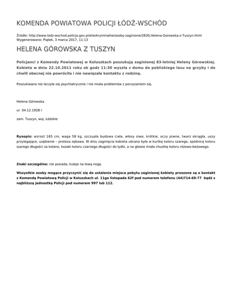 KOMENDA POWIATOWA POLICJI ŁÓDŹ-WSCHÓD Źródło: http://www.lodz-wschod.policja.gov.pl/elw/kryminalne/osoby-zaginione/2830,Helena-Gorowska-z-Tuszyn.html Wygenerowano: Piątek, 3 marca 2017, 11:13 HELENA GÓROWSKA Z TUSZYN Policjanci z Komendy Powiatowej w Koluszkach poszukują zaginionej 83-letniej Heleny Górowskiej. Kobieta w dniu 22.10.2011 roku ok godz 11:30 wyszła z domu do pobliskiego lasu na grzyby i do chwili obecnej nie powróciła i nie nawiązała kontaktu z rodziną. Poszukiwana nie leczyła się psychiatrycznie i nie miała problemów z poruszaniem się. Helena Górowska ur. 04.12.1928 r zam. Tuszyn, woj. Łódzkie Rysopis: wzrost 165 cm, waga 58 kg, szczupła budowa ciała, włosy siwe, krótkie, oczy piwne, twarz okrągła, uszy przylegające, uzębienie – proteza zębowa. W dniu zaginięcia kobieta ubrana była w kurtkę koloru szarego, spódnicę koloru szarego długości za kolano, kozaki koloru czarnego długości do łydki, a na głowie miała chustkę koloru różowo-beżowego. Znaki szczególne: nie posiada, kuleje na lewą nogę. Wszystkie osoby mogące przyczynić się do ustalenia miejsca pobytu zaginionej kobiety proszone są o kontakt z Komendą Powiatową Policji w Koluszkach ul. 11go listopada 62f pod numerem telefonu (44)714-69-77 bądź z najbliższą jednostką Policji pod numerem 997 lub 112. Ocena: 0/5 (0) Tweetnij