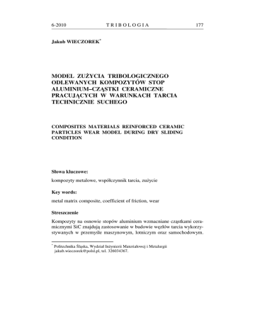 6-2010 TRIBOLOGIA 177 Jakub WIECZOREK* MODEL ZUŻYCIA TRIBOLOGICZNEGO ODLEWANYCH KOMPOZYTÓW STOP ALUMINIUM–CZĄSTKI CERAMICZNE PRACUJĄCYCH W WARUNKACH TARCIA TECHNICZNIE SUCHEGO COMPOSITES MATERIALS REINFORCED CERAMIC PARTICLES WEAR MODEL DURING DRY SLIDING CONDITION Słowa kluczowe: kompozyty metalowe, współczynnik tarcia, zużycie Key words: metal matrix composite, coefficient of friction, wear Streszczenie Kompozyty na osnowie stopów aluminium wzmacniane cząstkami ceramicznymi SiC znajdują zastosowanie w budowie węzłów tarcia wykorzystywanych w przemyśle maszynowym, lotniczym oraz samochodowym. * Politechnika Śląska, Wydział Inżynierii Materiałowej i Metalurgii [email protected], tel. 326034367. 178 TRIBOLOGIA 6-2010 Rozmieszczenie cząstek zbrojących w osnowie, ich udział objętościowy, kształt oraz wielkość determinują strukturę, a zatem i właściwości materiału. W artykule przedstawiono możliwości kształtowania rozmieszczenia cząstek w odlewie poprzez zastosowanie odlewania ciśnieniowego. Badaniami objęto kompozyty na osnowie stopu AK12 zbrojonego cząstkami SiC o wielkości 10 µm, 25 µm, 50 µm oraz ich mieszaniną. Właściwości tribologiczne, w skojarzeniu żeliwo–kompozyt, badano w warunkach tarcia technicznie suchego, wykorzystując tester T-01. Na podstawie przeprowadzonych badań mikroskopowych i profilografometrycznych powierzchni kompozytów AK12–SiC po współpracy opisano zależność pomiędzy wielkością cząstek zbrojących a geometrią warstwy wierzchniej kompozytu. Przeprowadzone badania pozwoliły na opracowanie modelu zużycia tribologicznego kompozytu w zależności od wielkości cząstek zbrojących. WPROWADZENIE Postęp w zakresie technologii wytwarzania i kształtowania materiałów pozwala na projektowanie i wytwarzanie elementów części maszyn o właściwościach ściśle skorelowanych z warunkami pracy. Wiedzę na temat kompozytów i ich reakcji w złożonych systemach eksploatacyjnych, często skrajnie niekorzystnych, należy rozwijać, starając się możliwie w pełni określić zespół czynników wpływających na istotę i charakter pracy materiału. Wynika to ze złożoności czynników strukturalnych kształtujących ich właściwości eksploatacyjne. W projektowaniu kompozytu przeznaczonego do współpracy tribologicznej pod uwagę brane są zarówno czynniki zewnętrzne, tzn.: obciążenie, temperatura pracy, rodzaj smarowania lub jego brak, prędkość ruchu, obecność drgań, jak również cechy strukturalne, tzn.: rodzaj osnowy i fazy zbrojącej, udział, wielkość oraz morfologia zbrojenia [L. 1÷3]. Każdy z tych czynników oddziałuje bezpośrednio lub pośrednio na trwałość i niezawodność węzła tribologicznego [L. 4÷7]. BADANIA Badaniami objęto materiały kompozytowe na osnowie stopu aluminium AlSi12Cu2Ni2Mg4, zbrojonego cząstkami węglika krzemu SiC o wielkości 10 µm, 25 µm, 50 µm oraz mieszaniną tych cząstek (Tabela 1). Kompozyty wytworzono metodą mechanicznego mieszania i ukształto- 6-2010 TRIBOLOGIA 179 wano, stosując technikę odlewania ciśnieniowego, które przeprowadzono na maszynie ciśnieniowej pionowej, zimnokomorowej o sile zwierania 100 t w odlewni PRESS. Tabela 1. Skład fazowy kompozytów AK12–Al2O3 użytych w badaniach Table 1. Phase composition of tested AK12–Al2O3 composites Oznaczenie Stop osnowy S10 S25 S50 SM AlSi12Cu2Ni2Mg4 AlSi12Cu2Ni2Mg4 AlSi12Cu2Ni2Mg4 AlSi12Cu2Ni2Mg4 Rodzaj cząstek zbrojących SiC SiC SiC SiC Średnica cząstek zbrojących µm 10 30 50 25; 50; 100 Udział objętościowy cząstek zbrojących % 15% 15% 15% 5% + 5% + 5% Jest to technologia stosowana w produkcji seryjnej, pozwalająca na kształtowanie wyrobów o złożonej geometrii oraz gwarantująca powtarzalność rozkładu zbrojenia [L. 9–11]. Wyniki badań struktury odlewów ciśnieniowych wskazują, że struktura dobrze wykonanego odlewu jest bardzo korzystna, niezależnie od wielkości cząstek wzmacniających. Charakterystyczne dla odlewów ciśnieniowych jest równomierne rozmieszczenie zbrojenia. Kształt zastosowanej formy oraz strukturę uzyskanych odlewów przedstawiono na Rysunku 1. Rys. 1. Kształt badanego odlewu ciśnieniowego i mikrostruktura kompozytów S25 po odlewaniu Fig. 1. Shape of pressure casting used in the research and microstructure of composites S25 180 TRIBOLOGIA 6-2010 Dla określenia właściwości tribologicznych wykorzystano krążek z odlewu, którego powierzchnię szlifowano i polerowano. Tak przygotowaną powierzchnię poddano ścieraniu na testerze tribologicznym T-01 typu tarcza–trzpień. Przeciwpróbkę w kształcie trzpienia φ = 3 mm i długości 20 mm, wykonano z żeliwa EN-GJ200. Zastosowano: nacisk 5 MPa, prędkość obrotową 5 m/s, drogę tarcia 5000 m. W trakcie badania rejestrowano w sposób ciągły zmianę współczynnika tarcia. Powstały na powierzchni kompozytowego dysku ślad wytarcia poddano badaniom mikroskopowym i profilografometrycznym. Jak wynika z przeprowadzonych badań, współczynnik tarcia w badanym układzie tribologicznym powiększa się wraz ze zwiększeniem wymiarów cząstek zbrojących SiC (Rys. 2). 0,5 współczynnik tarcia, m 0,45 S50 0,4 SM 0,35 S25 0,3 S10 0,25 0 500 1000 1500 2000 2500 3000 droga, m 3500 4000 4500 5000 Rys. 2. Wykres współczynnika tarcia w funkcji drogi w warunkach tarcia technicznie suchego Fig. 2. Diagram of friction coefficient dependent on track in dry sliding condition Ślad wytarcia kompozytu zbrojonego cząstkami o średnicy 10 µm przedstawiony na Rysunku 3a wskazuje na łagodny przebieg procesu zużycia. Na powierzchni nie zaobserwowano żadnych wyraźnych oznak wyrywania cząstek zbrojących. Ślad wytarcia jest regularny, o czym świadczy mała wartość Ra = 2,25 µm. Analiza śladu wytarcia dla kompozytu zbrojonego cząstkami o średnicy 25 µm (Rys. 3b) wskazuje na podobny, jak w poprzednim przypadku, łagodny charakter zużywania. Zwiększa się jednak wartość parame