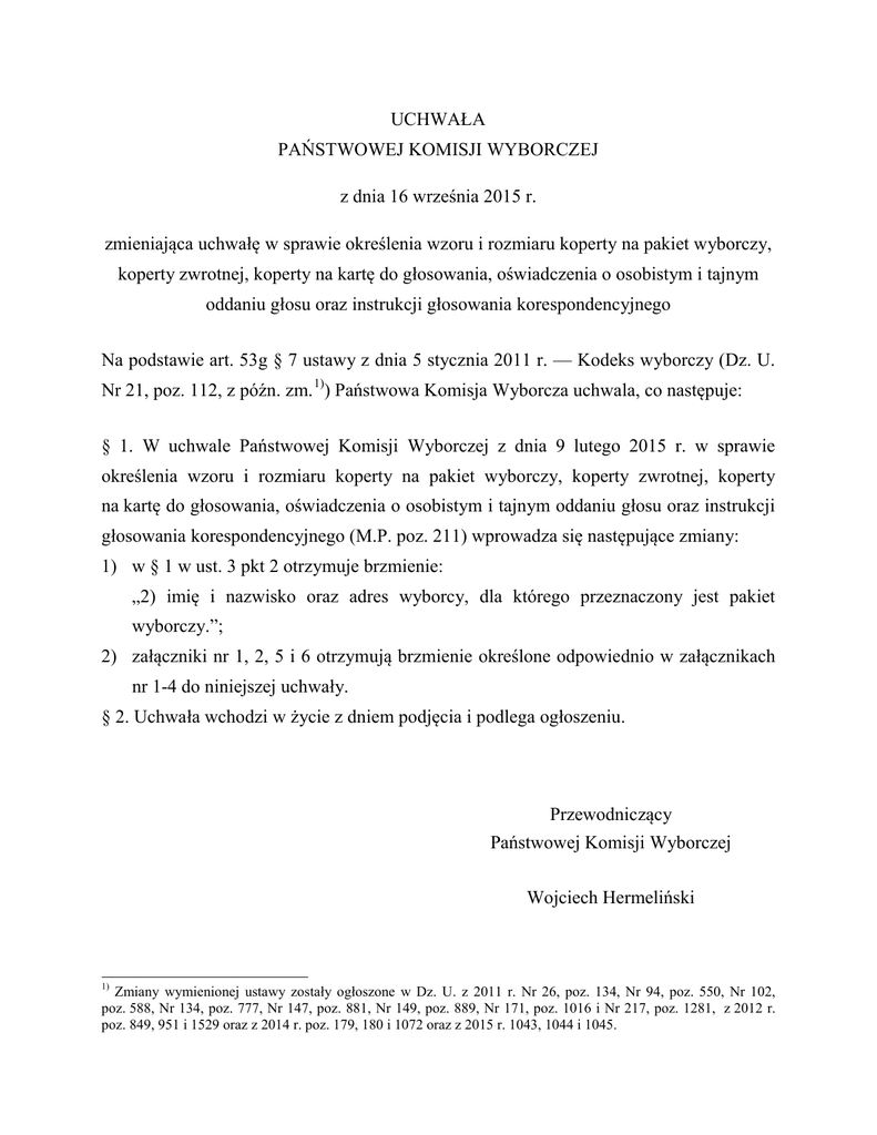 UCHWAŁA PAŃSTWOWEJ KOMISJI WYBORCZEJ z dnia 16 września 2015 r. zmieniająca uchwałę w sprawie określenia wzoru i rozmiaru koperty na pakiet wyborczy, koperty zwrotnej, koperty na kartę do głosowania, oświadczenia o osobistym i tajnym oddaniu głosu oraz instrukcji głosowania korespondencyjnego Na podstawie art. 53g § 7 ustawy z dnia 5 stycznia 2011 r. — Kodeks wyborczy (Dz. U. Nr 21, poz. 112, z późn. zm. 1)) Państwowa Komisja Wyborcza uchwala, co następuje: § 1. W uchwale Państwowej Komisji Wyborczej z dnia 9 lutego 2015 r. w sprawie określenia wzoru i rozmiaru koperty na pakiet wyborczy, koperty zwrotnej, koperty na kartę do głosowania, oświadczenia o osobistym i tajnym oddaniu głosu oraz instrukcji głosowania korespondencyjnego (M.P. poz. 211) wprowadza się następujące zmiany: 1) w § 1 w ust. 3 pkt 2 otrzymuje brzmienie: „2) imię i nazwisko oraz adres wyborcy, dla którego przeznaczony jest pakiet wyborczy.”; 2) załączniki nr 1, 2, 5 i 6 otrzymują brzmienie określone odpowiednio w załącznikach nr 1-4 do niniejszej uchwały. § 2. Uchwała wchodzi w życie z dniem podjęcia i podlega ogłoszeniu. Przewodniczący Państwowej Komisji Wyborczej Wojciech Hermeliński Zmiany wymienionej ustawy zostały ogłoszone w Dz. U. z 2011 r. Nr 26, poz. 134, Nr 94, poz. 550, Nr 102, poz. 588, Nr 134, poz. 777, Nr 147, poz. 881, Nr 149, poz. 889, Nr 171, poz. 1016 i Nr 217, poz. 1281, z 2012 r. poz. 849, 951 i 1529 oraz z 2014 r. poz. 179, 180 i 1072 oraz z 2015 r. 1043, 1044 i 1045. 1) Załączniki do uchwały Państwowej Komisji Wyborczej z dnia 16 września 2015 r. (poz. …) Załącznik nr 1 Wzór koperty na pakiet wyborczy (miejsce na pieczęć nagłówkową urzędu gminy lub konsula) Przesyłka zwolniona z opłaty pocztowej na podstawie art. 53k § 3 Kodeksu wyborczego (Dz. U. Nr 21, poz. 112, z późn. zm.)*),**) PRZESYŁKA WYBORCZA*) …………………………………. (imię i nazwisko wyborcy) ……………………………….… (adres wyborcy) …………………………………. …………………………………. *) Umieszcza się w głosowaniu korespondencyjnym w kraju **) Umieszczenie informacji nie jest konieczne w przypadku doręczania do wyborcy pakietu wyborczego przez upoważnionego pracownika urzędu gminy oraz w przypadku gdy wyborca zadeklarował osobisty odbiór pakietu wyborczego 3 Załącznik nr 2 Wzór koperty zwrotnej Przesyłka zwolniona z opłaty pocztowej na podstawie art. 53k § 3 Kodeksu wyborczego (Dz. U. Nr 21, poz. 112, z późn. zm.)*) PRZESYŁKA WYBORCZA*) Obwodowa Komisja Wyborcza Nr … w ……………………………………. …………………………….……...…. (adres obwodowej komisji wyborczej) …………………………….……...….*) ……………………………….……….. (adres konsula) ……………………………….……….. ……………………………….……….. (przesyłka dla Obwodowej Komisji Wyborczej Nr …)**) *) Umieszcza się w głosowaniu korespondencyjnym w kraju **) Umieszcza się w głosowaniu korespondencyjnym za granicą 4 Załącznik nr 3 Wzór instrukcji głosowania korespondencyjnego w wyborach do Sejmu Rzeczypospolitej Polskiej i do Senatu Rzeczypospolitej Polskiej, Prezydenta Rzeczypospolitej Polskiej oraz do Parlamentu Europejskiego Instrukcja głosowania korespondencyjnego 1. Wyborca otrzymuje pakiet wyborczy zawierający: 1) zaadresowaną kopertę zwrotną; 2) kartę do głosowania*)/karty do głosowania*); 3) kopertę na kartę do głosowania*)/na karty do głosowania*); 4) oświadczenie o osobistym i tajnym oddaniu głosu; 5) niniejszą instrukcję. **) Pakiet wyborczy, na żądanie wyborcy, może zawierać również nakładkę na kartę do głosowania sporządzoną w alfabecie Braille'a.**) 2. Na karcie do głosowania wyborca oddaje głos, w sposób określony w informacji znajdującej się w dolnej części karty do głosowania. Należy pamiętać, że znakiem „x” są dwie linie przecinające się w obrębie kratki przeznaczonej na oddanie głosu. 3. Po oddaniu głosu należy kartę do głosowania*)/karty do głosowania*) umieścić w kopercie oznaczonej „Koperta na kartę do głosowania” i kopertę tę zakleić. Niezaklejenie koperty na kartę*)/karty*) do głosowania spowoduje, że karta*)/karty*) do głosowania w niej się znajdująca*)/znajdujące*) nie będzie*)/będą*) uwzględniona*)/uwzględnione*) przy ustalaniu wyników głosowania. Do koperty na kartę do głosowania nie wkłada się oświadczenia o osobistym i tajnym oddaniu głosu. 4. Zaklejoną kopertę na kartę do głosowania należy włożyć do koperty zwrotnej zaadresowanej na adres obwodowej komisji wyborczej***)/konsula***). 5. Do koperty zwrotnej należy także włożyć oświadczenie o osobistym i tajnym oddaniu głosu. Przed włożeniem oświadczenia do koperty należy wpisać na nim miejscowość i datę jego sporządzenia oraz własnoręcznie je podpisać. Jeżeli wyborca nie może lub nie umie złożyć podpisu, oświadczenie podpisuje za niego inna osoba przez niego upoważniona, czyniąc o tym wzmiankę obok podpisu; w takim przypadku osoba upoważniona wpisuje również nazwę miejscowości i datę sporządzenia oświadczenia. Niewłożenie oświadczenia do koperty zwrotnej 5 lub niepodpisanie go spowoduje, że karta do głosowania nie będzie uwzględniona przy ustalaniu wyników głosowania. 6. Kopertę zwrotną należy zakleić i osobiście, okazując dokument tożsamości nadać w placówce Poczty Polskiej na adres obwodowej komisji wyborczej, najpóźniej: 1) w przedostatnim dniu roboczym poprzedzającym dzień, na który zarządzono wybory, tj. dnia ... ****) – w placówce Poczty Polskiej usytuowanej na obszarze gminy, w której wyborca ujęty jest w rejestrze wyborców; 2) w trzecim dniu roboczym poprzedzającym dzień, na który zarządzono wybory, tj. dnia ... ****) – w dowolnej placówce pocztowej Poczty Polskiej. 