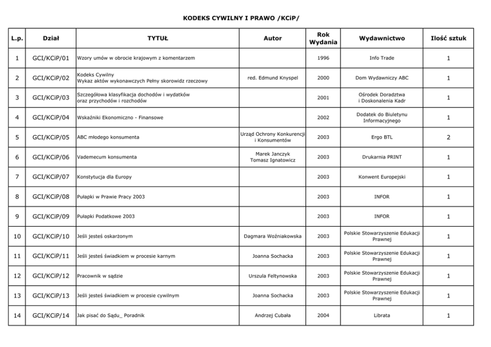 KODEKS CYWILNY I PRAWO /KCiP/ Rok Wydania Wydawnictwo Ilość sztuk 1996 Info Trade 1 2000 Dom Wydawniczy ABC 1 Szczegółowa klasyfikacja dochodów i wydatków oraz przychodów i rozchodów 2001 Ośrodek Doradztwa i Doskonalenia Kadr 1 GCI/KCiP/04 Wskaźniki Ekonomiczno - Finansowe 2002 Dodatek do Biuletynu Informacyjnego 1 5 GCI/KCiP/05 ABC młodego konsumenta Urząd Ochrony Konkurencji i Konsumentów 2003 Ergo BTL 2 6 GCI/KCiP/06 Vademecum konsumenta Marek Janczyk Tomasz Ignatowicz 2003 Drukarnia PRINT 1 7 GCI/KCiP/07 Konstytucja dla Europy 2003 Konwent Europejski 1 8 GCI/KCiP/08 Pułapki w Prawie Pracy 2003 2003 INFOR 1 9 GCI/KCiP/09 Pułapki Podatkowe 2003 2003 INFOR 1 10 GCI/KCiP/10 Jeśli jesteś oskarŜonym Dagmara Woźniakowska 2003 Polskie Stowarzyszenie Edukacji Prawnej 1 11 GCI/KCiP/11 Jeśli jesteś świadkiem w procesie karnym Joanna Sochacka 2003 Polskie Stowarzyszenie Edukacji Prawnej 1 12 GCI/KCiP/12 Pracownik w sądzie Urszula Feltynowska 2003 Polskie Stowarzyszenie Edukacji Prawnej 1 13 GCI/KCiP/13 Jeśli jesteś świadkiem w procesie cywilnym Joanna Sochacka 2003 Polskie Stowarzyszenie Edukacji Prawnej 1 14 GCI/KCiP/14 Jak pisać do Sądu_ Poradnik Andrzej Cubała 2004 Librata 1 L.p. Dział TYTUŁ 1 GCI/KCiP/01 Wzory umów w obrocie krajowym z komentarzem 2 GCI/KCiP/02 Kodeks Cywilny Wykaz aktów wykonawczych Pełny skorowidz rzeczowy 3 GCI/KCiP/03 4 Autor red. Edmund Knyspel Jacek Bogudziński Konrad Buczkowski Andrzej Kaznowski 2004 Wydawnictwo C. H. BECK 1 Lech Garlickiego 2004 Wydawnictwo C. H. BECK 1 Arkadiusz Szyszkowksi 2004 Wydawnictwo C. H. BECK 1 2004 Urząd Zamówień Publicznych 1 red. Barbara Porzecka 2005 Wydawnictwo C. H. BECK 1 red. Barbara Porzecka 2005 Wydawnictwo C. H. BECK 1 Kodeks Pracy 2005 Tadeusz Fijałkowski 2005 Wydawnictwo WGP 1 GCI/KCiP/22 Kodeks Pracy 2006 Jarosław Chałas Halina Kwiatkowska 2006 Gazeta Prawna INFOR 2 23 GCI/KCiP/23 Podręcznik samodzielnej nauki księgowania Barbara Gierusz 2007 Ośrodek Doradztwa i Doskonalenia Kadr 1 24 GCI/KCiP/24 Umowa o partnerstwie publiczno- prywatnymramy określające standardową zawartość Witold Grzybowski 2007 Ministerstwo Gospodarski 1 25 GCI/KCiP/25 Zakupy i podróŜe w Europie 2007 Europejskie Centrum Konsumenckie 20 26 GCI/KCiP/26 Kodeks Spółek Handlowych po zmianach z komentarzem ekspertów Jarosław Chałas Anna Bajerska 2007 INFOR 1 27 GCI/KCiP/27 Kodeks Pracy po zmianach 2007 Arkadiusz Sobczyk 2007 Gazeta Prawna INFOR 1 28 GCI/KCiP/28 Prawo Pracy bez tajemnic 2008 Stowarzyszenie Wspieranie Edukacji i Rynku Pracy 3 29 GCI/KCiP/29 Kodeks Pracy po zmianach 2008 Agnieszka Jesiotr Katarzyna ZbiegieńWłodarska 2008 Gazeta Prawna INFOR 1 30 GCI/KCiP/30 Encyklopedia PRAWO nie tylko dla prawników red. Marta Pawlus 2004 PPU Park 1 15 GCI/KCiP/15 Wzory umów i pism z CD 16 GCI/KCiP/16 Konstytucja RP 17 GCI/KCiP/17 Prawo zamówień publicznych z wprowadzeniem 18 GCI/KCiP/18 Ustawa z dn.29.01.2004r. Prawo zamówień Publicznych 19 GCI/KCiP/19 Kodeks Karny, Kodeks Postępowania Karnego, Kodeks Karny Wykonawczy oraz przepisy wprowadzające 20 GCI/KCiP/20 Kodeks Cywilny, Kodeks Postępowania Cywilnego, Kodeks Rodzinny i Opiekuńczy oraz przepisy wprowadzające 21 GCI/KCiP/21 22 31 GCI/KCiP/31 Prawo Gospodarcze w orzeczeniach i komentarzach 32 GCI/KCiP/32 Państwo i Prawo (miesięcznik) red.Grzegorz Borkowski Marek Grzybowski 2008 Oficyna a Wolters Kluwer business 1 red. Leszek Kubicki 2008 Polska Akademia Nauk 1