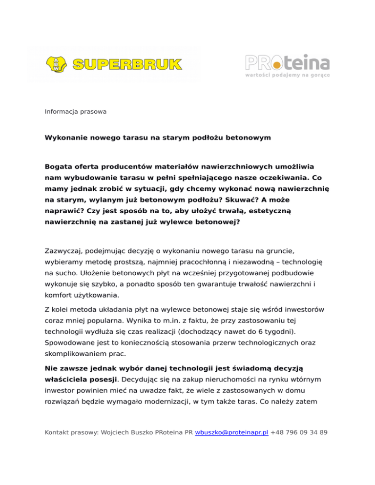 Informacja prasowa Wykonanie nowego tarasu na starym podłożu betonowym Bogata oferta producentów materiałów nawierzchniowych umożliwia nam wybudowanie tarasu w pełni spełniającego nasze oczekiwania. Co mamy jednak zrobić w sytuacji, gdy chcemy wykonać nową nawierzchnię na starym, wylanym już betonowym podłożu? Skuwać? A może naprawić? Czy jest sposób na to, aby ułożyć trwałą, estetyczną nawierzchnię na zastanej już wylewce betonowej? Zazwyczaj, podejmując decyzję o wykonaniu nowego tarasu na gruncie, wybieramy metodę prostszą, najmniej pracochłonną i niezawodną – technologię na sucho. Ułożenie betonowych płyt na wcześniej przygotowanej podbudowie wykonuje się szybko, a ponadto sposób ten gwarantuje trwałość nawierzchni i komfort użytkowania. Z kolei metoda układania płyt na wylewce betonowej staje się wśród inwestorów coraz mniej popularna. Wynika to m.in. z faktu, że przy zastosowaniu tej technologii wydłuża się czas realizacji (dochodzący nawet do 6 tygodni). Spowodowane jest to koniecznością stosowania przerw technologicznych oraz skomplikowaniem prac. Nie zawsze jednak wybór danej technologii jest świadomą decyzją właściciela posesji. Decydując się na zakup nieruchomości na rynku wtórnym inwestor powinien mieć na uwadze fakt, że wiele z zastosowanych w domu rozwiązań będzie wymagało modernizacji, w tym także taras. Co należy zatem Kontakt prasowy: Wojciech Buszko PRoteina PR [email protected] +48 796 09 34 89 zrobić, gdy chcemy mieć nowy taras w miejsce starego, który wykonany został na wylewce? W takiej sytuacji nie koniecznie musimy sięgać po ostateczne rozwiązanie, jakim jest skucie starego podkładu betonowego. Możliwe jest ułożenie płyt betonowych na zastanej wylewce. – Jeśli wylewka betonowa została wykonana prawidłowo i na właściwej wysokości, to jej skuwanie jest nieuzasadnione ekonomicznie. Warto wykorzystać to, co już mamy. Tym bardziej że płyty możemy również układać na wylewce powierzchniowo zniszczonej, z licznymi ubytkami. Jeśli podłoże jest stabilne, prawidłowo ułożony taras z trwałego materiału, jakim są betonowe płyty, gwarantuje długotrwałe i komfortowe jego użytkowanie – wyjaśnia Jarosław Fiedorowicz, kierownik budowy z firmy ABW Superbruk, renomowanego producenta wysokiej jakości kostek brukowych i płyt tarasowych. Przed rozpoczęciem prac ważne jest ustalenie kolejności ułożenia płyt. Unikniemy w ten sposób widocznych różnic w odcieniach barw. Następnie wykonujemy, bezpośrednio na betonowym podłożu, 3-4-centymetrową warstwę podsypki cementowo – piaskowej. Poszczególne elementy układamy w odstępach wynikających z dystansów użytych płyt lub kostek, a ewentualne różnice w poziomie nawierzchni niwelujemy za pomocą zagęszczarki wyposażonej w elastyczną płytę. - Układając płyty warto pamiętać o zachowaniu odpowiednich spadków na całej powierzchni tarasu. Nachylenie minimum 0,5% gwarantuje swobodny odpływ wody. Po ułożeniu nawierzchni możemy przystąpić do spoinowania szczelin pomiędzy płytami drobnym, płukanym piaskiem lub specjalnymi masami do fugowania nawierzchni – mówi ekspert firmy ABW Superbruk. Końcowy etap prac to impregnacja płyt tarasowych. Ich powierzchnia narażona jest nie tylko na działanie niekorzystnych czynników atmosferycznych, ale również na zabrudzenia, np. tłuszczem, kawą, sokami czy herbatą. Zabezpieczenie płyt uchroni je przed powstawaniem trwałych plam. Warto jednak pamiętać o tym, że niektóre impregnaty trwale zmieniają kolor płyt. Zanim więc przystąpimy do zabezpieczenia, dobrze jest na próbę zaimpregnować ścinki płyt lub niewielki fragment nawierzchni. Kontakt prasowy: Wojciech Buszko PRoteina PR [email protected] +48 796 09 34 89 O firmie: ABW SUPERBRUK Sp. z o.o. jest firmą o wieloletnim doświadczeniu w branży związanej z drogownictwem. Od 1992 roku zajmuje się produkcją betonowych elementów wibroprasowanych, a od 1995 roku świadczy również usługi w zakresie wykonywania nawierzchni drogowych z materiałów własnej produkcji. W regionie Polski północno-wschodniej jest największym producentem kostki brukowej. Zakład to cztery nowoczesne linie produkcyjne, wyposażone w maszyny światowych marek. System produkcji kontrolowany jest komputerowo, zapewniając pełną powtarzalność parametrów jakościowych produktów. W roku 2012 firma zakupiła i uruchomiła nowoczesną linię technologiczną do uszlachetniania kostki brukowej. Zastosowana technologia jest pierwszym tego typu wdrożeniem w Polsce. W procesie uszlachetniania kostka poddawana jest różnym etapom mechanicznej obróbki powierzchni, co nadaje jej estetyczny i naturalny wygląd. Oferta firmy ABW Superbruk wyróżnia się bogactwem kształtów i kolorów kostek brukowych i płyt, które są produktami mocnymi, trwałymi i odpornymi na działanie czynników zewnętrznych. Dzięki komputeryzacji procesów technologicznych, zastosowaniu wysokiej klasy materiałów i jednoczesnym stałym mikrofalowym kontrolowaniu wilgotności betonu asortyment spełnia normy europejskie. ABW Superbruk Sp. z o.o. Hryniewicze 75/5, 16-061 Juchnowiec Kościelny tel. +48 (85) 745 40 28 www.superbruk.com.pl Kontakt prasowy: Wojciech Buszko PRoteina PR [email protected] +48 796 09 34 89 Kontakt prasowy: Wojciech Buszko PRoteina PR [email protected] +48 796 09 34 89