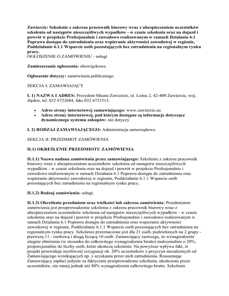 Zawiercie: Szkolenie z zakresu pracownik biurowy wraz z ubezpieczeniem uczestników szkolenia od następstw nieszczęśliwych wypadków - w czasie szkolenia oraz na dojazd i powrót w projekcie Profesjonalnie i zawodowo realizowanym w ramach Działania 6.1 Poprawa dostępu do zatrudnienia oraz wspieranie aktywności zawodowej w regionie, Poddziałanie 6.1.1 Wsparcie osób pozostających bez zatrudnienia na regionalnym rynku pracy. OGŁOSZENIE O ZAMÓWIENIU - usługi Zamieszczanie ogłoszenia: obowiązkowe. Ogłoszenie dotyczy: zamówienia publicznego. SEKCJA I: ZAMAWIAJĄCY I. 1) NAZWA I ADRES: Prezydent Miasta Zawiercie, ul. Leśna 2, 42-400 Zawiercie, woj. śląskie, tel. 032 6722684, faks 032 6721513. Adres strony internetowej zamawiającego: www.zawiercie.eu Adres strony internetowej, pod którym dostępne są informacje dotyczące dynamicznego systemu zakupów: nie dotyczy I. 2) RODZAJ ZAMAWIAJĄCEGO: Administracja samorządowa. SEKCJA II: PRZEDMIOT ZAMÓWIENIA II.1) OKREŚLENIE PRZEDMIOTU ZAMÓWIENIA II.1.1) Nazwa nadana zamówieniu przez zamawiającego: Szkolenie z zakresu pracownik biurowy wraz z ubezpieczeniem uczestników szkolenia od następstw nieszczęśliwych wypadków - w czasie szkolenia oraz na dojazd i powrót w projekcie Profesjonalnie i zawodowo realizowanym w ramach Działania 6.1 Poprawa dostępu do zatrudnienia oraz wspieranie aktywności zawodowej w regionie, Poddziałanie 6.1.1 Wsparcie osób pozostających bez zatrudnienia na regionalnym rynku pracy.. II.1.2) Rodzaj zamówienia: usługi. II.1.3) Określenie przedmiotu oraz wielkości lub zakresu zamówienia: Przedmiotem zamówienia jest przeprowadzenie szkolenia z zakresu pracownik biurowy wraz z ubezpieczeniem uczestników szkolenia od następstw nieszczęśliwych wypadków - w czasie szkolenia oraz na dojazd i powrót w projekcie Profesjonalnie i zawodowo realizowanym w ramach Działania 6.1 Poprawa dostępu do zatrudnienia oraz wspieranie aktywności zawodowej w regionie, Poddziałanie 6.1.1 Wsparcie osób pozostających bez zatrudnienia na regionalnym rynku pracy. Szkolenie przeznaczone jest dla 21 osób, podzielonych na 2 grupy pierwszą 11 - osobową i drugą liczącą 10 osób. Zamawiający zastrzega, że wynagrodzenie ulegnie obniżeniu (w stosunku do całkowitego wynagrodzenia brutto) maksymalnie o 20%, proporcjonalnie do liczby osób, które ukończą szkolenie. Na powyższe wpływa fakt, iż projekt przewiduje możliwość rezygnacji ok. 20% uczestników z przyczyn niezależnych od Zamawiającego wynikających np. z uzyskania przez nich zatrudnienia. Reasumując Zamawiający zapłaci jedynie za faktycznie przeprowadzone szkolenia, ukończone przez uczestników, nie mniej jednak niż 80% wynagrodzenia całkowitego brutto. Szkolenie zostanie przeprowadzone na terenie miasta Zawiercia. Wykonawca zobowiązany będzie do osobistego stawienia się każdorazowo na bezpośrednie wezwanie Lidera w biurze projektu lub innym wskazanym miejscu na terenie Zawiercia i Katowic. 1. Cele szkolenia. Zdobycie wiedzy z zakresu: obsługi pakietów biurowych, kontaktów interpersonalnych i asertywności, metod archiwizacji, obsługi urządzeń biurowych orz zarządzanie czasem. 2. Metodyka szkolenia: 1) wykorzystywanie aktywnych form prowadzenia zajęć (łączenie wykładów, ćwiczeń, dyskusji, burze mózgów, odwoływanie się do doświadczeń uczestników), 2) praca oparta na treningu interpersonalnym, 3) ćwiczenia indywidualne i grupowe, mające na celu zwiększyć wiarę w siebie i pomóc w znalezieniu pracy. 3. Materiały dotyczące realizacji szkolenia. Uczestnicy otrzymują komplet materiałów merytorycznych oraz certyfikaty zgodne ze wzorem MEN oraz dyplomy oznaczone zgodnie z wymogami wytycznych o promocji w Programie Operacyjnym Kapitał Ludzki. 4. Harmonogram realizacji szkolenia dla poszczególnych grup. Do przeszkolenia: 2 grupy - dwie składające się z 11 osób i jedna 10osobowa. Szkolenie trwa 100 godzin dydaktycznych dla każdej z grup. Zajęcia mogą się odbywać od trzech do pięciu razy w tygodniu (od poniedziałku do piątku, w możliwym przedziale godzinowym 8.00-18.00). Wykonawca przedstawi do akceptacji Zamawiającemu, w terminie 3 dni roboczych po podpisaniu umowy szczegółowy harmonogram zajęć dostosowany do szczegółowego programu szkolenia (zakresu tematycznego szkolenia). 5. Ramowy program szkolenia: 1) Prezentacja i sposób bycia. Biurowy savoir vivre; 2) Kontakty interpersonalne; 3) Asertywność; 4) Organizacja pracy nowoczesnego biura; 5) Korespondencja biurowa; 6) Metody archiwizacji; 7) Obsługa interesanta; 8) Obsługa urządzeń biurowych; 9) Zarządzanie czasem; 10) Sztuka skutecznego komunikowania się przez telefon; 11) Podstawy obsługi komputera (Windows); 12) Podstawy obsługi komputera (Word); 13) Podstawy obsługi komputera (Excel); 14) Komputerowe projektowanie prezentacji. PowerPoint; 15) Podstawy obsługi komputera (Internet Explorer, Outlook). 6. Szczegółowy program szkolenia: Temat Ilość godzin ogółem Zajęcia teore-tyczne Zajęcia prakty-czne Prezentacja i sposób bycia. Biurowy savoir vivre. 6 4 2 x Ważna postawa. x Twarz mówi wszystko. x Wygląd zewnętrzny równie ważny jak umiejętności. x Odpowiednie ubranie, makijaż, uczesanie. x Co to znaczy być dobrze ubranym? x Talent organizacyjny. x Opanowanie. x Biurowy savoir-vivre. x Kto pierwszy mówi dzień dobry i podaje rękę. Tytułowanie. Kontakty interpersonalne. 6 4 2 x Komunikacja werbalna. x Komunikacja niewerbalna. x Umiejętność aktywnego słuchania. x Efektywne pytania. Asertywność. 6 4 2 x Czym jest asertywność. x Postawa agresywna, bierna i asertywna. x Stanowienie i obrona swoich praw i granic. x Obrona swoich praw w sytuacjach społecznych. x Asertywne przyjmowanie ocen. x Reagowanie na krytykę i atak. x Wyrażanie uczuć pozytywnych. x Wyrażanie uczuć negatywnych. x Wyrażanie własnych opinii i przekonań. x Wybrane techniki asertywne. x Autoakceptacja i pozytywne myślenie 