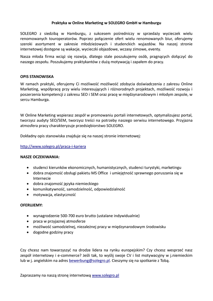 Praktyka w Online Marketing w SOLEGRO GmbH w Hamburgu SOLEGRO z siedzibą w Hamburgu, z sukcesem pośredniczy w sprzedaży wycieczek wielu renomowanych touroperatorów. Poprzez połączenie ofert wielu renomowanych biur, oferujemy szeroki asortyment w zakresie młodzieżowych i studenckich wyjazdów. Na naszej stronie internetowej dostępne są wakacje, wycieczki objazdowe, wczasy zimowe, eventy. Nasza młoda firma wciąż się rozwija, dlatego stale poszukujemy osób, pragnących dołączyd do naszego zespołu. Poszukujemy praktykantów z dużą motywacją i zapałem do pracy. OPIS STANOWISKA W ramach praktyki, oferujemy Ci możliwośd możliwośd zdobycia doświadczenia z zakresu Online Marketing, współpracę przy wielu interesujących i różnorodnych projektach, możliwośd rozwoju i poszerzenia kompetencji z zakresu SEO i SEM oraz pracę w międzynarodowym i młodym zespole, w sercu Hamburga. W Online Marketing wspierasz zespół w promowaniu portali internetowych, optymalizujesz portal, tworzysz audyty SEO/SEM, tworzysz treści na potrzeby naszego serwisu internetowego. Przyjazna atmosfera pracy charakteryzuje przedsiębiorstwo SOLEGRO. Dokładny opis stanowiska znajduje się na naszej stronie internetowej: http://www.solegro.pl/praca-i-kariera NASZE OCZEKIWANIA: studenci kierunków ekonomicznych, humanistycznych, studenci turystyki, marketingu dobra znajomośd obsługi pakietu MS Office i umiejętnośd sprawnego poruszania się w Internecie dobra znajomośd języka niemieckiego komunikatywnośd, samodzielnośd, odpowiedzialnośd motywacja, elastycznośd OFERUJEMY: wynagrodzenie 500-700 euro brutto (ustalane indywidualnie) praca w przyjaznej atmosferze możliwośd samodzielnej, niezależnej pracy w międzynarodowym środowisku dogodne godziny pracy Czy chcesz nam towarzyszyd na drodze lidera na rynku europejskim? Czy chcesz wesprzed nasz zespół internetowy i e-commerce? Jeśli tak, to wyślij swoje CV i list motywacyjny w j.niemieckim lub w j. angielskim na adres [email protected]. Cieszymy się na spotkanie z Tobą. Zapraszamy na naszą stronę internetową www.solegro.pl