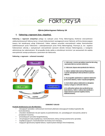 Oferta faktoringowa Faktorzy SA 1. Faktoring z regresem (tzw. niepełny). Faktoring z regresem (niepełny) polega na wykupie przez firmę faktoringową (Faktora) wierzytelności udokumentowanych fakturą (wraz z innymi dokumentami wymaganymi przez Faktora), od firmy dostarczającej towary lub świadczącej usługi (Faktorant). Faktor nabywa wszystkie wierzytelności wobec Kontrahentów (zdefiniowanych przez Faktoranta i zaakceptowanych przez firmę faktoringową), finansuje je, tzn. wypłaca Faktorantowi zaliczkę z wykupionych wierzytelności (procent określa Umowa Faktoringowa), a następnie administruje ów należnościami. W przypadku braku spłaty w określonym terminie i po wezwaniach do zapłaty wierzytelność zostaje przekazana z powrotem do Faktoranta. Faktoring z regresem – schemat transakcji ODBIORCY USŁUGI Produkt dedykowany jest dla Klientów : • stosujących sprzedaż z odroczonym terminem płatności (stosujących kredyty kupieckie dla kontrahentów), • charakter działalności nie jest oparty na pośrednictwie, tzn. posiadających rzeczywisty udział w przepływie towarów, • prowadzących sprzedaż bezgotówkową, • utrzymujących stałą współpracę z kontrahentami, którą cechuje powtarzalna sprzedaż, • współpracujących z kontrahentami nie krócej niż 6 miesięcy, • mających ograniczony kapitał własny i wykorzystane bieżące linie kredytowe, • posiadających wysoki poziom należności, • nie posiadający majątku pod zabezpieczenie kredytu Korzyści dla Klienta • możliwość wydłużenia terminów płatności dla kontrahentów, co wzmacnia pozycję konkurencyjną Firmy, • przedterminowy wpływ należności pozwala uzyskiwać rabaty u dostawców z tytułu wcześniejszego regulowania zobowiązań, • dyscyplinuje kontrahentów, • likwidacja zatorów płatniczych, co ogranicza ryzyko prowadzenia działalności, • elastyczne finansowanie, szczególnie ważne przy wzroście obrotów, • przyspieszenie spływu należności do klientów, co wpływa na poprawę płynności finansowej firmy, • brak zabezpieczeń majątkowych. 2. Faktoring samorządowy. Faktoring samorządowy (bez regresu) przeznaczony jest na uzupełnienie kapitału obrotowego Firmy, pozwala poprawić płynność finansową. Produkt ten umożliwia uzyskiwanie środków pieniężnych pod wierzytelności, z tytułu: • ochrony mienia, • utrzymania zieleni, • prac porządkowych, których dłużnikiem są Jednostki Samorządu Terytorialnego (JST). Faktoring samorządowy – schemat transakcji ODBIORCY USŁUGI Produkt dedykowany jest dla Klientów : firm świadczących usługi na zlecenie Jednostek Samorządu Terytorialnego (firmy realizujące kontrakty dostarczające towary dla samorządu). Korzyści dla Klienta: • • 100% wypłacanej zaliczki daje możliwość wydłużenia terminów płatności dla kontrahentów, co wzmacnia pozycję konkurencyjną Firmy, • • • • • • przedterminowy wpływ należności pozwala uzyskiwać rabaty u dostawców z tytułu wcześniejszego regulowania zobowiązań, dyscyplinuje kontrahentów, likwiduje zatory płatnicze, co ogranicza ryzyko prowadzenia działalności, zapewnia elastyczne finansowanie, szczególnie ważne przy wzroście obrotów, przyspiesza spływ należności do klientów, co wpływa na poprawę płynności finansowej firmy, brak zabezpieczeń majątkowych. 3. Wykup wierzytelności samorządowych. Wykup wierzytelności samorządowych to nabywanie przez Faktora wierzytelności powstałych w wyniku wykonanego przez Klienta kontraktu na rzecz JST. ODBIORCY USŁUGI Produkt dedykowany jest dla Klientów: • firm świadczących usługi na zlecenie Jednostek Samorządu Terytorialnego ( firmy realizujące kontrakty, dostarczające towary, usługi dla samorządu ) Korzyści dla Klienta (Wykonawcy): brak oceny kredytowej, szybki dostęp do środków z tytułu realizacji kontraktu na rzecz JST, brak regresu do Klienta, usprawnienie obiegu gotówki w firmie dzięki otrzymanym środkom finansowym przed terminem płatności, • Klient po udokumentowaniu bezsporności wierzytelności, uzyskuje pełną wartość (100%) wystawionych faktur. Korzyści dla Jednostki Samorządu Terytorialnego: • • • • • • • • brak jakichkolwiek kosztów związanych z zawartą transakcją wykupu wierzytelności, wydłużone terminy płatności faktur wystawianych przez kontrahentów JST, możliwość realizacji zakupów i inwestycji przez JST, nawet w przypadku braku całej sumy na sfinansowanie inwestycji, odciąża kontrahenta JST od ryzyka utraty płynności finansowej – kontrahent staje się stabilnym i przewidywalnym partnerem.