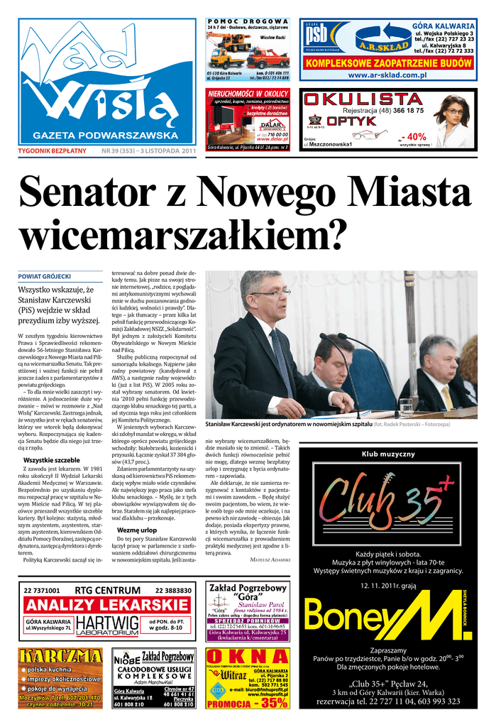 tygodnik BEZPŁATNy NR 39 (353) – 3 listopada 2011 Senator z Nowego Miasta wicemarszałkiem? powiat grójecki Wszystko wskazuje, że Stanisław Karczewski (PiS) wejdzie w skład prezydium izby wyższej. W zeszłym tygodniu kierownictwo Prawa i Sprawiedliwości rekomendowało 56-letniego Stanisława Karczewskiego z Nowego Miasta nad Pilicą na wicemarszałka Senatu. Tak prestiżowej i ważnej funkcji nie pełnił jeszcze żaden z parlamentarzystów z powiatu grójeckiego. – To dla mnie wielki zaszczyt i wyróżnienie. A jednocześnie duże wyzwanie – mówi w rozmowie z „Nad Wisłą” Karczewski. Zastrzega jednak, że wszystko jest w rękach senatorów, którzy we wtorek będą dokonywać wyboru. Rozpoczynająca się kadencja Senatu będzie dla niego już trzecią z rzędu. Wszystkie szczeble Z zawodu jest lekarzem. W 1981 roku ukończył II Wydział Lekarski Akademii Medycznej w Warszawie. Bezpośrednio po uzyskaniu dyplomu rozpoczął pracę w szpitalu w Nowym Mieście nad Pilicą. W tej placówce przeszedł wszystkie szczeble kariery. Był kolejno: stażystą, młodszym asystentem, asystentem, starszym asystentem, kierownikiem Oddziału Pomocy Doraźnej, zastępcą ordynatora, zastępcą dyrektora i dyrektorem. Polityką Karczewski zaczął się in- 22 7371001 teresować na dobre ponad dwie dekady temu. Jak pisze na swojej stronie internetowej, „rodzice, z poglądami antykomunistycznymi wychowali mnie w duchu poszanowania godności ludzkiej, wolności i prawdy”. Dlatego – jak tłumaczy – przez kilka lat pełnił funkcję przewodniczącego Komisji Zakładowej NSZZ „Solidarność”. Był jednym z założycieli Komitetu Obywatelskiego w Nowym Mieście nad Pilicą. Służbę publiczną rozpoczynał od samorządu lokalnego. Najpierw jako radny powiatowy (kandydował z AWS), a następnie radny wojewódzki (już z list PiS). W 2005 roku został wybrany senatorem. Od kwietnia ’2010 pełni funkcję przewodniczącego klubu senackiego tej partii, a od stycznia tego roku jest członkiem jej Komitetu Politycznego. W jesiennych wyborach Karczewski zdobył mandat w okręgu, w skład którego oprócz powiatu grójeckiego wchodziły: białobrzeski, kozienicki i przysuski. Łącznie zyskał 37 384 głosów (43,7 proc.). Zdaniem parlamentarzysty na uzyskaną od kierownictwa PiS rekomendację wpływ miało wiele czynników. Ale największy jego praca jako szefa klubu senackiego. – Myślę, że z tych obowiązków wywiązywałem się dobrze. Starałem się jak najlepiej pracować dla klubu – przekonuje. Wezmę urlop Do tej pory Stanisław Karczewski łączył pracę w parlamencie z szefowaniem oddziałowi chirurgicznemu w nowomiejskim szpitalu. Jeśli zosta- RTG CENTRUM 22 3883830 Stanisław Karczewski jest ordynatorem w nowomiejskim szpitalu (fot. Radek Pasterski – Fotorzepa) nie wybrany wicemarszałkiem, będzie musiało się to zmienić. – Takich dwóch funkcji równocześnie pełnić nie mogę, dlatego wezmę bezpłatny urlop i zrezygnuję z bycia ordynatorem – zapowiada. Ale deklaruje, że nie zamierza rezygnować z kontaktów z pacjentami i swoim zawodem. – Będę służyć swoim pacjentom, bo wiem, że wiele osób tego ode mnie oczekuje, i na pewno ich nie zawiodę – obiecuje. Jak dodaje, posiada ekspertyzy prawne, z których wynika, że łączenie funkcji wicemarszałka z prowadzeniem praktyki medycznej jest zgodne z literą prawa. Mateusz Adamski Klub muzyczny Każdy piątek i sobota. Muzyka z płyt winylowych - lata 70-te Występy świetnych muzyków z kraju i z zagranicy. 12. 11. 2011r. grają ANALIZY LEKARSKIE GÓRA KALWARIA ul.Wyszyńskiego 7L od PON. do PT. w godz. 8-10 Zapraszamy Panów po trzydziestce, Panie b/o w godz. 2000- 300 Dla zmęczonych pokoje hotelowe. „Club 35+” Pęcław 24, 3 km od Góry Kalwarii (kier. Warka) rezerwacja tel. 22 727 11 04, 603 993 323 2 Wszystkich Hojnych piaseczno 14 tys. zł zebrano podczas kwesty w Dniu Wszystkich Świętych. Pieniądze pozwolą odnowić pomniki na zabytkowym cmentarzu. – Od początku naszej działalności udało nam się już wiele zrobić. Zapoczątkowaliśmy remont zabytkowego muru nekropolii i odnowiliśmy kilka nagrobków – opowiada „NW” Zbigniew Mucha ze Społecznego Komitetu Renowacji Cmentarza Parafialnego w Piasecznie. – Co będzie zrobione za pieniądze zebrane tym razem? – dopytujemy. – Mamy już gotowe projekty renowacji dziesięciu kolejnych pomników, trzeba także dokończyć odnawiany mur – przyznaje. Wynik wtorkowej zbiórki był podobny do ubiegłorocznego. Do współpracy zgłosiło się niemal 30 wolonta- ~ NadWisłą ~ wydarzenia riuszy – to głównie samorządowcy i lokalni działacze społeczni. Wszyscy z satysfakcją kwestowali, wielu zadeklarowało swój udział za rok. Odwiedzający starą nekropolię równie chętnie dzielili się swoimi pieniędzmi. Gratulowali też organizatorom inicjatywy i konsekwencji w działaniu, bo – jak wskazywali – efekty pracy Komitetu widać gołym okiem i z roku na rok cmentarz staje się piękniejszy. Jednak, jak to zwykle bywa, oprócz zwolenników znaleźli się i przeciwnicy. Gdy kwestujące wolontariuszki zagadnęły jednego z młodych mężczyzn opuszczających cmentarz, ten obrzucił je inwektywami. – Weźcie się do pracy i pójdźcie posprzątać groby, a nie tylko żebrzecie wszędzie, gdzie się da! To wstyd! – rzucił. – Przecież zbieramy pieniądze właśnie po to, żeby odrestaurować zapomniane nagrobki – kwituje tę sytuację Zbigniew Mucha. Karol Stróż Firmy pytają, pierwszy mecz się oddala góra kalwaria Znów przesuwa się rozpoczęcie budowy hali sportowej na terenie byłych koszar. Przyjmowanie ofert firm w przetargu na wykonawcę przedsięwzięcia zostało przesunięte o półtora miesiąca, do 6 grudnia. – Przyczyny są dwie. Pierwsza to ogromna liczba pytań od potencjalnych oferentów. Gdybyśmy je zignorowali, postępowanie mogłoby być skutecznie zaskarżone. Drugi powód to brak zezw