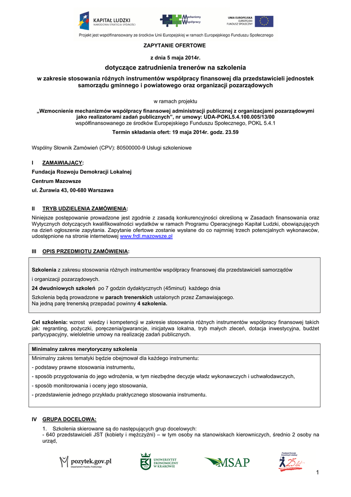 ZAPYTANIE OFERTOWE z dnia 5 maja 2014r. dotyczące zatrudnienia trenerów na szkolenia w zakresie stosowania różnych instrumentów współpracy finansowej dla przedstawicieli jednostek samorządu gminnego i powiatowego oraz organizacji pozarządowych w ramach projektu „Wzmocnienie mechanizmów współpracy finansowej administracji publicznej z organizacjami pozarządowymi jako realizatorami zadań publicznych”, nr umowy: UDA-POKL5.4.100.005/13/00 współfinansowanego ze środków Europejskiego Funduszu Społecznego, POKL 5.4.1 Termin składania ofert: 19 maja 2014r. godz. 23.59 Wspólny Słownik Zamówień (CPV): 80500000-9 Usługi szkoleniowe I ZAMAWIAJĄCY: Fundacja Rozwoju Demokracji Lokalnej Centrum Mazowsze ul. Żurawia 43, 00-680 Warszawa II TRYB UDZIELENIA ZAMÓWIENIA: Niniejsze postępowanie prowadzone jest zgodnie z zasadą konkurencyjności określoną w Zasadach finansowania oraz Wytycznych dotyczących kwalifikowalności wydatków w ramach Programu Operacyjnego Kapitał Ludzki, obowiązujących na dzień ogłoszenie zapytania. Zapytanie ofertowe zostanie wysłane do co najmniej trzech potencjalnych wykonawców, udostępnione na stronie internetowej www.frdl.mazowsze.pl III OPIS PRZEDMIOTU ZAMÓWIENIA: Szkolenia z zakresu stosowania różnych instrumentów współpracy finansowej dla przedstawicieli samorządów i organizacji pozarządowych. 24 dwudniowych szkoleń po 7 godzin dydaktycznych (45minut) każdego dnia Szkolenia będą prowadzone w parach trenerskich ustalonych przez Zamawiającego. Na jedną parę trenerską przepadać powinny 4 szkolenia. Cel szkolenia: wzrost wiedzy i kompetencji w zakresie stosowania różnych instrumentów współpracy finansowej takich jak: regranting, pożyczki, poręczenia/gwarancje, inicjatywa lokalna, tryb małych zleceń, dotacja inwestycyjna, budżet partycypacyjny, wieloletnie umowy na realizację zadań publicznych. Minimalny zakres merytoryczny szkolenia Minimalny zakres tematyki będzie obejmował dla każdego instrumentu: - podstawy prawne stosowania instrumentu, - sposób przygotowania do jego wdrożenia, w tym niezbędne decyzje władz wykonawczych i uchwałodawczych, - sposób monitorowania i oceny jego stosowania, - przedstawienie jednego przykładu praktycznego stosowania instrumentu. IV GRUPA DOCELOWA: 1. Szkolenia skierowane są do następujących grup docelowych: - 640 przedstawicieli JST (kobiety i mężczyźni) – w tym osoby na stanowiskach kierowniczych, średnio 2 osoby na urząd, 1 - 320 przedstawicieli organizacji pozarządowych (kobiety i mężczyźni) – jedna osoba z organizacji współpracującej z daną JST., 2. Grupa szkoleniowa – grupa docelowo liczyć będzie 10 trzyosobowych zespołów, w sumie 20 przedstawicieli JST oraz 10 przedstawicieli organizacji pozarządowych V POZOSTAŁE WARUNKI: 1. Szkolenia będą realizowane w miastach wojewódzkich zgodnie z harmonogramem szkoleń przedstawionym w formularzu oferty (załącznik nr 1 do niniejszego zapytania ofertowego), w lokalizacji (hotel, ośrodek) wskazanej przez Zamawiającego. 2. Szkolenia planowo będą odbywały się w godzinach 9.30 – 17.00 (pierwszy dzień) i 8:30 -13:25 (drugi dzień) – razem 14 godzin dydaktycznych , (godzina dydaktyczna = 45 minut) 3. Dojazd na szkolenie powinien zostać uwzględniony w cenie za szkolenie 4. Jeżeli wykonawcą jest firma, za całość usługi szkoleniowej wystawi fakturę z VAT zw. ponieważ usługa jest finansowana w całości ze środków publicznych i jest przeznaczona na szkolenia zawodowe pracowników. 5. W przypadku osób fizycznych formą zatrudnienia będzie Umowa zlecenia. 6. Faktura/rachunek zostanie wystawiona/y na: Fundacja Rozwoju Demokracji Lokalnej Centrum Mazowsze, z siedzibą w Warszawie, 01-552 Pl. Inwalidów 10, NIP 522-000-18-95, ale należy ją dostarczyć do siedziby FRDL Centrum Mazowsze ul. Żurawia 43, 00-680 Warszawa. 7. Zamawiający zapewnia (organizuje i finansuje) salę wraz z wyposażeniem, lunch i przerwy kawowe podczas szkolenia oraz nocleg z kolacją i śniadaniem. 8. Zamawiający drukuje i dostarcza materiały szkoleniowe. 9. Trenerzy będą zobowiązani w umowie do przedkładania dokumentacji wymaganej przez (Ministerstwo Rozwoju i Infrastruktury (MIR), spisanej w zasadach finansowania i kwalifikowania kosztów w ramach POKL (karty pracy, oświadczenia i informacje na temat zaangażowania czasowego we wszystkich projektach finansowanych ze środków unijnych, oświadczenia o nie przekroczeniu limitu godzin pracy – 240 godzin w miesiącu). Wzory ww. dokumentów dostarczy Zamawiający. 10. W przypadku wyboru trenera reprezentującego firmę, umowa może zostać podpisana z firmą, ale ze wskazaniem danego trenera do wykonania zlecenia 11. Wykonawca także w ramach usługi: a) Weźmie udział w TOT (szkolenie trenerów) w terminie najprawdopodobniej 6 czerwca 2014r. (zwrot kosztów dojazdu zapewni Wykonawca w kwocie maksymalnie 200zł, do wysokości kosztu pociągu/PKS/innego transportu publicznego na danej trasie) b) Rozdaje i zbiera listę obecności – oddzielnie na każdy dzień c) Rozdaje puste i zbiera wypełnione kwestionariusze PEFS (trener zostanie upoważniony do przetwarzania danych osobowych i podpisze oświadczenie o ochronie danych osobowych) d) Zbiera od uczestników testy, sprawdzi je i wpisze wyniki na liście obecności e) Rozdaje oraz zbiera od uczestników ankiety ewaluacyjne f) Zbierze pytania do doradców w czasie szkoleń g) Wypełni formularz/kartę trenera . Formularz będzie musiał zawierać informacje dot. tendencji panujących w JST w zakresie stosowania instrumentów finansowych. Zadaniem Trenera będzie uzyskanie informacji od uczestników szkoleń nt. dotychczasowych doświadczeń w stosowaniu instrumentów współpracy finansowej, nastawienia co do stosowania, „otwartości” na stosowanie nowych, dotąd nie stosowanych form współpracy finansowej. Wzór formularza zostanie dostarczony przez Zamawiającego. h) Rozdaje certyfikaty i 