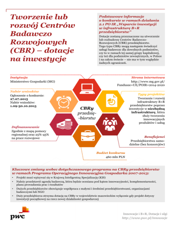 Tworzenie lub rozwój Centrów Badawczo Rozwojowych (CBR) – dotacje na inwestycje Podstawowe informacje o konkursie w ramach działania 2.1 PO IR „Wsparcie inwestycji w infrastrukturę B+R przedsiębiorstw” Dotacje zostaną przeznaczone na utworzenie lub rozbudowę Centrów BadawczoRozwojowych (CBR) przedsiębiorstw. Tego typu CBRy mogą następnie świadczyć usługi badawcze dla dowolnych podmiotów, czy to w ramach tej samej grupy kapitałowej, czy też dla podmiotów zewnętrznych, w Polsce i na całym świecie – nie ma w tym względzie żadnych ograniczeń. Instytucja Ministerstwo Gospodarki (MG) Nabór wniosków Ogłoszenie o konkursie: 27.07.2015 Nabór wniosków: 1.09-30.10.2015 Strona internetowa http://www.mg.gov.pl/ Fundusze+UE/POIR+2014-2020 Typy projektów Tworzenie i rozwój infrastruktury B+R przedsiębiorstw poprzez inwestycje w niezbędną infrastrukturę, która służy tworzeniu innowacyjnych produktów i usług CBRy przedsię-biorstw Dofinansowanie Zgodnie z mapą pomocy regionalnej oraz 25%-45% na prace rozwojowe Beneficjenci Przedsiębiorstwa samodzielne (bez konsorcjów) Budżet konkursu 460 mln PLN Kluczowe zmiany wobec dotychczasowego programu na CBRy przedsiębiorstw w ramach Programu Operacyjnego Innowacyjna Gospodarka 2007-2013: • Projekt musi wpisywać się w Krajową Inteligentną Specjalizację (KIS) • Należy przedstawić agendę badawczą, która będzie oceniana pod kątem innowacyjności, komplementarności, planu prowadzenia prac i rezultatów • Dużych przedsiębiorców obowiązuje współpraca z małymi i średnimi przedsiębiorstwami, organizacjami badawczymi lub NGO • Duży przedsiębiorca otrzyma dotację na CBRy w województwie mazowieckim wyłącznie gdy projekt dotyczy inwestycji początkowej na rzecz nowej działalności gospodarczej Innowacje i B+R, Dotacje i ulgi http://www.pwc.pl/innowacje Innowacje i B+R, Dotacje i ulgi http://www.pwc.pl/innowacje Poziomy dofinansowania Przedsiębiorca będzie mógł pozyskać dotację na komponent inwestycyjny oraz na przeprowadzenie prac B+R. W zakresie inwestycji o poziomie dofinansowania będzie decydować lokalizacja CBRu, zgodnie z mapą pomocy regionalnej. Warto zauważyć, iż od lipca 2014 r. tylko w 4 województwach progi pozostały bez zmian, podczas gdy w pozostałych poziom dofinansowania uległ zmniejszeniu. Nowa mapa pomocy regionalnej – od lipca 2014 r. 40% 1 40% 35% 35% Inwestycja Pomoc regionalna 50% 50% 50% 35% 50% 40% 35% 25% 50% 30% 50% 50-70% 10-35% 35% 40% 25% Tylko w czterech województwach progi pozostały bez zmian i wynoszą 50% 50% 35% 25% 50% 50% 40% 50% 35% 50% 50% 50% Do progów wskazanych na mapie MŚP doliczają premię: 35% Małe przedsiębiorstwo +20% Średnie przedsiębiorstwo Kwalifikowane koszty inwestycji 1 KOSZT NABYCIA NIERUCHOMOŚCI zabudowanych i niezabudowanych (w tym prawa użytkowania wieczystego) +10% Max 10% kosztów kwalifiko-wanych 2 Koszt spłaty RAT LEASINGU NIERUCHOMOŚCI poniesione do dnia zakończenia realizacji projektu, do wysokości ich wartości początkowej z dnia zawarcia umowy leasingu, (umowa na min. 3 lata dla MŚP lub 5 lat dla dużych przedsiębiorstw - od zakończenia realizacji projektu) 3 KOSZT NABYCIA albo WYTWORZENIA ŚRODKÓW TRWAŁYCH wraz z kosztem instalacji i uruchomienia 4 KOSZT NABYCIA ROBÓT I MATERIAŁÓW BUDOWLANYCH 5 KOSZT NABYCIA WARTOŚCI NIEMATERIALNYCH I PRAWNYCH w formie patentów, licencji, know-how oraz innych praw własności intelektualnej 6 Koszt spłaty RAT WARTOŚCI POCZĄTKOWEJ ŚRODKÓW TRWAŁYCH poniesione przez korzystającego z tytułu umowy LEASINGU FINANSOWEGO Eksperymentalne prace rozwojowe 2 Pomoc na prace rozwojowe Prace rozwojowe Wielkość przedsiębiorstwa Poziom dofinansowania Małe przedsiębiorstwo 45% Średnie przedsiębiorstwo 35% Duże przedsiębiorstwa 25% Innowacje i B+R, Dotacje i ulgi http://www.pwc.pl/innowacje Kryteria wyboru projektów • Ocena formalna dotycząca głównie poprawności, kompletności terminowości złożenia dokumentacji Ocena formalna • Przedmiot realizacji projektu nie dotyczy rodzajów działalności wykluczonych • Projekt został rozpoczęty po dniu złożenia wniosku Podstawowe kryteria dostępu (Tak/Nie) Ocena merytoryczna kryteria dostępu • Projekt wpisuje się w Krajową Inteligentną Specjalizację (KIS) • Wnioskodawca posiada potencjał do prowadzenia prac B+R • W przypadku dużych przedsiębiorców zostanie nawiązana współpraca z MŚP, NGO lub organizacjami badawczymi Ocena merytoryczna kryteria punktowane • Agenda badawcza przedstawiona na okres realizacji projektu i jego trwałości • Opłacalność i trwałość finansowa projektu Kryteria Punkty Współpraca z jednostkami naukowymi polskimi lub zagranicznymi – udokumentowana na moment składania wniosku 0 lub 3 lub 5 Udział nakładów na działalność B+R w całkowitych nakładach inwestycyjnych 0-8 Przewidywana liczba nowych miejsc pracy dla pracowników B+R z wykształceniem wyższym adekwatnych do dziedziny – przyrost liczony do obecnego stanu zatrudnienia w obszarze B+R i mierzony w przypadku przedsiębiorstw powiązanych dla całej grupy 0 lub 1 lub 3 lub 5 Wnioskodawca należy do sektora małych i średnich przedsiębiorstw (MŚP) 0 lub 5 Wnioskodawca jest członkiem Krajowego Klastra Kluczowego 0 lub 2 * Priorytet w przypadku jednakowej liczby punktów na liście rankingowej Bezwzględna wartość wydatków na B+R w okresie trwałości projektu [PLN] Nd. Wyższy niż wymagany przepisami udział środków własnych w kosztach kwalifikowanych [%] Nd. Poziom bezrobocia na obszarze gdzie realizowana jest inwestycja [%] Nd. Maksymalna liczba punktów do zdobycia to 25. Aby uzyskać dofinansowanie należy uzyskać łącznie co najmniej 13 punktów. * Jeżeli do dnia ogłoszenia konkursu nie zostaną wyłonione Kluczowe Klastry Krajowe na ocenie punktowej będzie można uzyskać max. 23 pkt., a dofinansowanie będzie przyznawane dla projektów, które otrzymają m