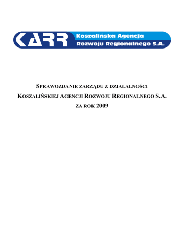 SPRAWOZDANIE ZARZĄDU Z DZIAŁALNOŚCI KOSZALIŃSKIEJ AGENCJI ROZWOJU REGIONALNEGO S.A. ZA ROK 2009 KOSZALIN, DNIA 10.02.2010 R. Polityka jakości KARR S.A. Satysfakcja Klienta jest podstawowym warunkiem sukcesu naszej firmy. Jednym z najważniejszych wymagań współczesnego rynku jest zapewnienie dobrej jakości świadczonych usług. Jakość jest dobra tylko wtedy, gdy świadczona usługa, uwzględniając rozsądną cenę, spełnia wszystkie oczekiwania Klienta. Dlatego dobro Klienta jest dla nas największą wartością. Misja Koszalińskiej Agencji Rozwoju Regionalnego polega na podejmowaniu działań, które inicjują, wspierają oraz promują zrównoważony rozwój Województwa Zachodniopomorskiego. Świadczymy najwyższej jakości usługi podmiotom gospodarczym, jednostkom samorządu terytorialnego oraz organizacjom społecznym, wspomagając rozwój gospodarczy, innowacyjność i konkurencyjność regionu. Nasze cele realizujemy współpracując z innymi podmiotami na poziomie lokalnym, regionalnym, krajowym i międzynarodowym. Wymóg zachowania wysokiej jakości dotyczy zarówno całej instytucji, jak i każdego pracownika. Deklarujemy stałą gotowość do podnoszenia poziomu naszej pracy. Nasza instytucja pragnie należeć do grona firm przyjaznych Klientom, co powinno wyróżniać ją wśród konkurencji. Podstawą polityki jakości Koszalińskiej Agencji Rozwoju Regionalnego S.A. są następujące zasady: - Jakość dotyczy wszystkich pracowników spółki, - Praca nad poprawą jakości jest naszym codziennym obowiązkiem, - Najważniejszym ogniwem w systemie jakości naszej organizacji są odpowiednio wykształceni pracownicy, którzy stale podnoszą swoje kwalifikacje, - Każdy pracownik ma świadomość swoich zadań w zakresie jakości. Ryszard Zdrojewski Prezes Zarządu KARR S.A. -2- 1. Karta Spółki Nazwa spółki: Koszalińska Agencja Rozwoju Regionalnego S.A. Adres siedziby: ul. Przemysłowa 8,75-216 Koszalin Tel./ fax: 094 341 63 30, 094 341 60 88 Adres e-mail [email protected] Adres strony www www.karr.koszalin.pl Rok powstania: 27 czerwca 1996r. Założyciele: Skarb Państwa reprezentowany przez Wojewodę Koszalińskiegoudziały w kwocie 200 tys. zł oraz Gmina Miejska Koszalin- udziały w kwocie 100 tys. zł. Rejestracja: Krajowy Rejestr Sądowy nr 0000045345 Kapitał zakładowy: 1.230,00 tys. zł podzielonych na 1.230 akcji, każda po 1 tys. zł. Organy Spółki: Walne Zgromadzenie Rada Nadzorcza Zarząd 81,71% - Województwo Zachodniopomorskie 10,16% - Agencja Rozwoju Przemysłu S.A. - Warszawa 8,13% - Gmina Miejska Koszalin Akcjonariusze: Walne Zgromadzenie Akcjonariuszy w dniu 26.06.2008 r. podjęło uchwałę nr 9/2008 o przymusowym wykupie akcji Kredyt Serwis sp. z o.o. i Gminy Miejskiej Szczecinek przez Województwo Zachodniopomorskie, które po dokonaniu wykupu posiadało 1.005 akcji o wartości 1.005 tys. zł. -3- 2. Stan organizacyjny Koszalińska Agencja Rozwoju Regionalnego Spółka Akcyjna jest samodzielną jednostką prowadzącą działalność gospodarczą, zarobkową, przeznaczającą wypracowane zyski na cele statutowe, związane z rozwojem regionu. Spółka nie posiada wyodrębnionych organizacyjnie oddziałów, ani zakładów. 2.1. Zatrudnienie, pracownicy Spółki W 2009 roku liczba pracowników w KARR S A wyniosła 33. Umowy zawierano w zróżnicowanym wymiarze czasowym oraz etatowym. Obecnie KARR S.A. zatrudnia na umowę o pracę 13 osób oraz 1 osobę na stażu. KARR S.A. pokrywa koszty tylko 40% etatu ogólnego zatrudnienia. Jak można zauważyć przeprowadzona w 2008r. restrukturyzacja zatrudnienia spowodowała w 2009r. znaczne oszczędności nakładów na wynagrodzenia w porównaniu do lat ubiegłych. 13 osób zatrudnionych na podstawie umów o pracę: prezes Zarządu, Sylwia Brzechwa - prokurent (1/4 etatu) i jednocześnie asystent kierownika projektu „Regionalny Ośrodek Europejskiego Funduszu Społecznego” (ROEFS), Maja Pilarska - główny księgowy (1/4 etatu) i księgowa projektu ROEFS (3/4 etatu), Anna Szczepańska – kierownik projektu ROEFS, Dominika Szramiak – specjalista w KARR (1/2 etatu) i asystent kierownika projektu „Moja firma w Unii Europejskiej II” (1/2 etatu), Mariusz Ryłów - specjalista w KARR i specjalista w projekcie „Moja firma w Unii Europejskiej II” (1/2 etatu), Adam Wiśniewski – specjalista w projekcie ROEFS, Piotr Jaśkiewicz – animator w projekcie ROEFS, Justyna Iwankiewicz – doradca w projekcie ROEFS, Zbigniew Zamszyn – doradca w projekcie ROEFS (1/2 etatu), Renata Sławińska – specjalista ds. rozliczeń w projekcie „Ze stoczni do własnej firmy”, Patrycja Zaręba – sekretarka projektu „Ze stoczni do własnej firmy”, Dominika Pazio – asystent Zarządu. Poza umowami o pracę, niektóre z ww. osób były zatrudnione na podstawie umów zlecenia na następujących stanowiskach: Sylwia Brzechwa – kierownik projektu „Moja firma w Unii Europejskiej II”, Maja Pilarska specjalista ds. rozliczeń w projekcie „Moja firma w Unii Europejskiej II”, Justyna Iwankiewicz – ewaluacja szkoleń w projekcie ROEFS, Anna Szczepańska – specjalista w projekcie „Ze stoczni do własnej firmy”, Dominika Szramiak – kierownik projektu „Ze stoczni do własnej firmy”, Renata Sławińska – księgowa – kasjer KARR, Patrycja Zaręba – specjalista w projekcie „Ze stoczni do własnej firmy”. W skład Rady Nadzorczej w 2009r. wchodziły 3 osoby: - Przewodniczący Rady Nadzorczej - Zastępca Przewodniczącego Rady Nadzorczej - Sekretarz Rady Nadzorczej – – – Marcin Badowski Leonarda Wiśniewska Radosław Klukaczewski – Ryszard Zdrojewski Zarząd Spółki stanowiła 1 osoba: - Prezes Zarządu Obsługę prawną w rozumieniu przepisów ustawy z dnia 6 lipca 1982 r. o radcach prawnych w zakresie prowadzonej przez KARR działalności gospodarczej, obejmującą m.in. sporządzanie opinii prawnych, zastępstwo procesowe w sprawach prowadzonych przed sądami i innymi organ