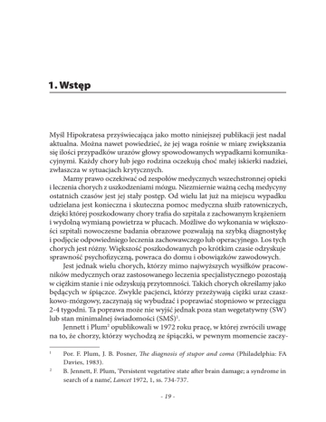 1. Wstęp Myśl Hipokratesa przyświecająca jako motto niniejszej publikacji jest nadal aktualna. Można nawet powiedzieć, że jej waga rośnie w miarę zwiększania się ilości przypadków urazów głowy spowodowanych wypadkami komunikacyjnymi. Każdy chory lub jego rodzina oczekują choć małej iskierki nadziei, zwłaszcza w sytuacjach krytycznych. Mamy prawo oczekiwać od zespołów medycznych wszechstronnej opieki i leczenia chorych z uszkodzeniami mózgu. Niezmiernie ważną cechą medycyny ostatnich czasów jest jej stały postęp. Od wielu lat już na miejscu wypadku udzielana jest konieczna i skuteczna pomoc medyczna służb ratowniczych, dzięki której poszkodowany chory trafia do szpitala z zachowanym krążeniem i wydolną wymianą powietrza w płucach. Możliwe do wykonania w większości szpitali nowoczesne badania obrazowe pozwalają na szybką diagnostykę i podjęcie odpowiedniego leczenia zachowawczego lub operacyjnego. Los tych chorych jest różny. Większość poszkodowanych po krótkim czasie odzyskuje sprawność psychofizyczną, powraca do domu i obowiązków zawodowych. Jest jednak wielu chorych, którzy mimo najwyższych wysiłków pracowników medycznych oraz zastosowanego leczenia specjalistycznego pozostają w ciężkim stanie i nie odzyskują przytomności. Takich chorych określamy jako będących w śpiączce. Zwykle pacjenci, którzy przeżywają ciężki uraz czaszkowo-mózgowy, zaczynają się wybudzać i poprawiać stopniowo w przeciągu 2-4 tygodni. Ta poprawa może nie wyjść jednak poza stan wegetatywny (SW) lub stan minimalnej świadomości (SMŚ)1. Jennett i Plum2 opublikowali w 1972 roku pracę, w której zwrócili uwagę na to, że chorzy, którzy wychodzą ze śpiączki, w pewnym momencie zaczy1 2 Por. F. Plum, J. B. Posner, The diagnosis of stupor and coma (Philadelphia: FA Davies, 1983). B. Jennett, F. Plum, ‘Persistent vegetative state after brain damage; a syndrome in search of a name’, Lancet 1972, 1, ss. 734-737. - 19 - nają spontanicznie otwierać oczy i pojawia się u nich cykl snu i czuwania. Autorzy ci uznali wspomniane objawy za kluczowe w rozpoznaniu stanu, który nazwali „przetrwałym stanem wegetatywnym” (PSW). Stan ten, określany jako „czuwanie bez świadomości”3 wskazywał na sytuację nieznaną dotychczas medycynie i psychologii. Jeśli chodzi o chorych z zaburzeniami świadomości, które określano jako stan wegetatywny, uważano, że chorzy ci nie mają żadnej świadomości siebie ani otoczenia. Obecnie wiemy, że może być inaczej. Zmiana tego poglądu zajęła długie lata dyskusji i polemik w środowisku medycznym i w całych społeczeństwach poszczególnych krajów. Wiadomo też, że pomoc udzielona na czas tym chorym, najczęściej po wypadku, gdy budzą się ze śpiączki, może umożliwić im powrót do znacznego stopnia sprawności ogólnej. Okazało się, że wielu z nich prędzej czy później przechodzi w stan nazywany obecnie stanem minimalnej świadomości. Fakty te dają się wyjaśnić w świetle osiągnięć naszego naukowca prof. Jerzego Konorskiego4, który w latach czterdziestych XX w. dokonał znakomitego odkrycia – zjawiska plastyczności mózgu pozwalającego na powstawanie trwałych przekształceń funkcjonalnych sieci neuronalnej mózgu w wyniku działania określonych bodźców stymulacji sensorycznej i/lub ich kombinacji. Podłożem plastyczności, wg Konorskiego, są morfologiczne zmiany synaptyczne. Z kolei w 1968 roku na Uniwersytecie Harvarda5 zdefiniowano stan nieodwracalnej śpiączki jako nowe kryterium śmierci człowieka6. W tekście raportu Komitetu Harwardzkiego znajdujemy stwierdzenia takie jak to, że „naszym celem jest zdefiniowanie nieodwracalnej śpiączki jako nowego kryterium śmierci”7, że definicja dotyczy „tych osób, które są w śpiączce i u których nie ma wykrywalnej aktywności OUN”8, oraz że „jakikolwiek narząd, mózg lub inny, który już nie działa i nie ma możliwości odzyskania swej funkcji, jest pod względem wszelkich praktycznych kryteriów martwy”9. Utożsamienie braku działania mózgu, a właściwie braku występowania tylko niektórych 5 3 4 8 9 6 7 Ibid., s. 734. J. Konorski, Integracyjna działalność mózgu (Warszawa: PWN, 1969). H. K. Beecher i wsp., ‘A definition of irreversible coma. Report of the Ad Hoc Committee of the Harvard Medical School to Examine the Definition of Brain Death’, JAMA, 1968, 205 (6), ss. 337-340 (85-88). Ibid., s. 337 (85). Ibid. Ibid. Ibid. - 20 - jego funkcji, co manifestuje się jako śpiączka połączona z bezdechem oraz brak odruchów, za które odpowiada pień mózgu, ze zniszczeniem całego mózgu oraz uznanie tego stanu rzeczy za nieodwracalny zostało poddane później zdecydowanej krytyce w literaturze przedmiotu. Zgodnie z postulatami wysuniętymi przez Komisję Harwardzką, nowe kryteria śmierci zastosowano po raz pierwszy w ustawodawstwie w Stanach Zjednoczonych w stanie Kansas w 1970 roku. Nowa prawna i medyczna definicja śmierci jest alternatywna: na jej podstawie lekarz może orzekać śmierć pacjenta zarówno na podstawie kryteriów dotychczasowych, tj. ustania krążenia i oddechu, jak i nowych – ustania czynności mózgu. W większości krajów świata przyjęte zostało ustawodawstwo wzorowane na wzmiankowanym powyżej. Nowa definicja śmierci, wzorowana na tej, która została przyjęta w stanie Kansas, była stopniowo przyjmowana w pozostałych stanach oraz w innych krajach na całym świecie. Do dalszego upowszechnienia neurologicznych kryteriów śmierci odwołujących się do pojęcia ŚM przyczyniła się praca Komisji Prezydenckiej, która w 1981 roku opublikowała „Raport na temat medycznych, prawnych i etycznych problemów związanych z orzekaniem śmierci”10. W raporcie tym przedstawiono w sposób kompleksowy teorię mózgu jako centralnego integratora, tworząc w ten sposób bazę teoretyczną dla koncepcji ŚM jako śmierci organizmu jako zinte