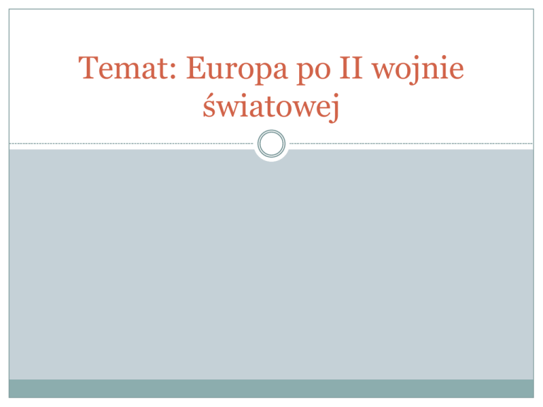 Temat: Europa po II wojnie światowej 1. Skutki II wojny światowej Straty w ludziach – strona 198-199 Straty materialne Straty w kulturze Zmiany układu sił na świecie: Stare potęgi osłabione po wojnie : Wielka Brytania i Francja Nowe potęgi: USA, ZSRR Pojęcia omawiane na lekcji strefy okupacyjne demilitaryzacja, dekartelizacja, denazyfikacja, ONZ, Powszechna deklaracja praw człowieka, żelazna kurtyna, zimna wojna, Kominform, doktryna powstrzymywania, plan Marshalla, Organizacja Europejskiej Wspólnoty Gospodarczej, Rada Wzajemnej Pomocy Gospodarczej, NATO, Układ Warszawski 2. Konferencja w Poczdamie 17.07-2.08.1945 Decyzje dotyczące Niemiec: Niemcy w pełni odpowiedzialne za wojnę Postanowienie dotyczące ścigania i karania zbrodniarzy Reparacje wojenne Ubytki terytorialne na wschodzie Strefy okupacyjne Wysiedlenia ludności niemieckiej (4D) Demilitaryzacja, denazyfikacja, dekartelizacja, demokratyzacja Decyzje dotyczące Polski Przekazanie Polsce terenów na wschód od Odry i Nysy Łużyckiej do czasu konferencji pokojowej (nie udało się zwołać takiej konferencji) Przyłączenie do Polski Gdańska, Warmii, Mazur Potwierdzenie linii Curzona Uznanie Tymczasowego Rządu Jedności Narodowej (de facto uznanie poparcia dla rządu londyńskiego) 3. Proces w Norymberdze listopad 1945październik 1946r. 22 oskarżonych (m.in. Herman Goring, Hans Frank, Rudolf Hess, Johann Ribbentrop) 12 skazano na karę śmierci, 7 otrzymało wysokie wyroki, 3 uniewinniono Proces w Norymberdze - dokument 4. Powstanie i zadania ONZ Powstał na bazie Deklaracji Narodów Zjednoczonych z 1942r. W San Francisco w kwietniu 1945r spotkanie założycielskie 50 państw (51. była Polska) Najważniejszym organem jest Rada Bezpieczeństwa (5 członków stałych z prawem weta) 1948r. Powszechna Deklaracja Praw Człowieka 5. Zimna wojna Coraz większe różnice wśród aliantów Przemówienie Churchilla w Fulton 05.03.1946 rok (tekst źródłowy nr 2/260) Rozwój partii komunistycznych w państwach europejskich (Francja, Włochy, Grecja) Wrzesień 1947 roku w Szklarskiej Porębie powstało Biuro Informacji Partii Komunistycznych (Kominform) 1947 prezydent USA H. Truman ogłasza doktrynę powstrzymywania 6. Plan Marshalla Amerykańska pomoc gospodarcza dla Europy ZSRR i państwa zależne od niego odrzuciły ten plan Kwiecień 1948r. 16 państw stworzyło Organizację Europejskiej Współpracy Gospodarczej (OEEC W latach 1948-1952 USA pożyczyły Europie 13 mld dolarów 1949r. powstała Rada Wzajemnej Pomocy Gospodarczej (RWPG) 7. NATO i Układ Warszawski Kwiecień 1949r. 10 państw zachodnioeuropejskich oraz USA i Kanada utworzyły Organizację Paktu Północnoatlantyckiego; 1952 dołączyła Grecja i Turcja, 1954 dołączyła RFN Warszawa 1955r. powołanie do życia Układu Warszawskiego